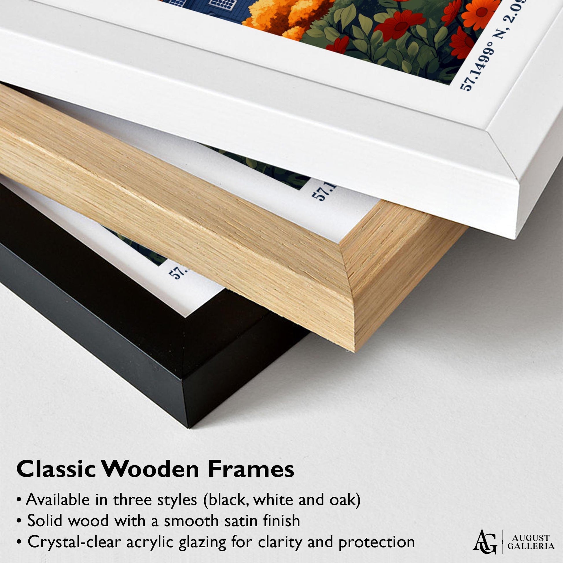Made from sustainably sourced European wood and delivered ready to hang, available in black, white, or natural oak finishes. Includes a durable crystal-clear, shatter-resistant Perspex glaze for lasting protection and a sleek, modern look.