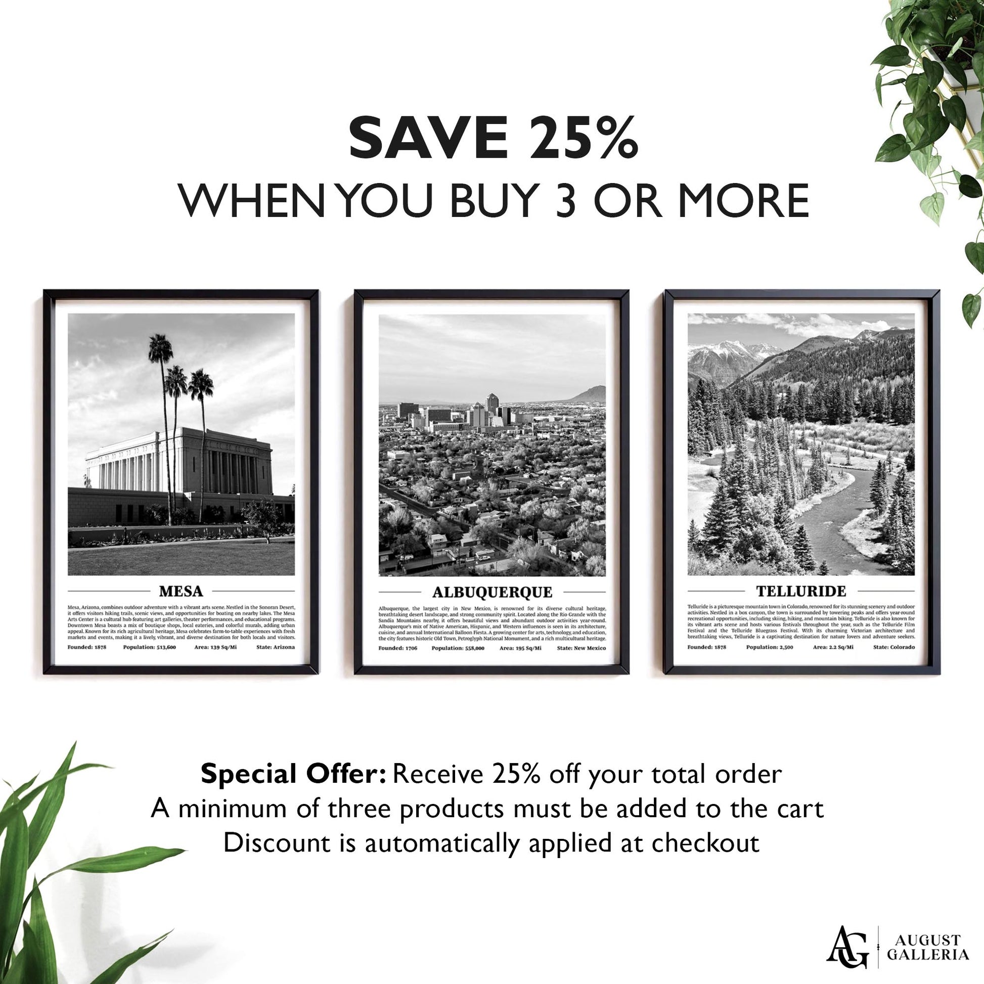 A black and white print of Albuquerque providing a glimpse into the city's history and significance. Perfect for modern interiors, this piece exudes sophistication and offers a window into the city's soul.