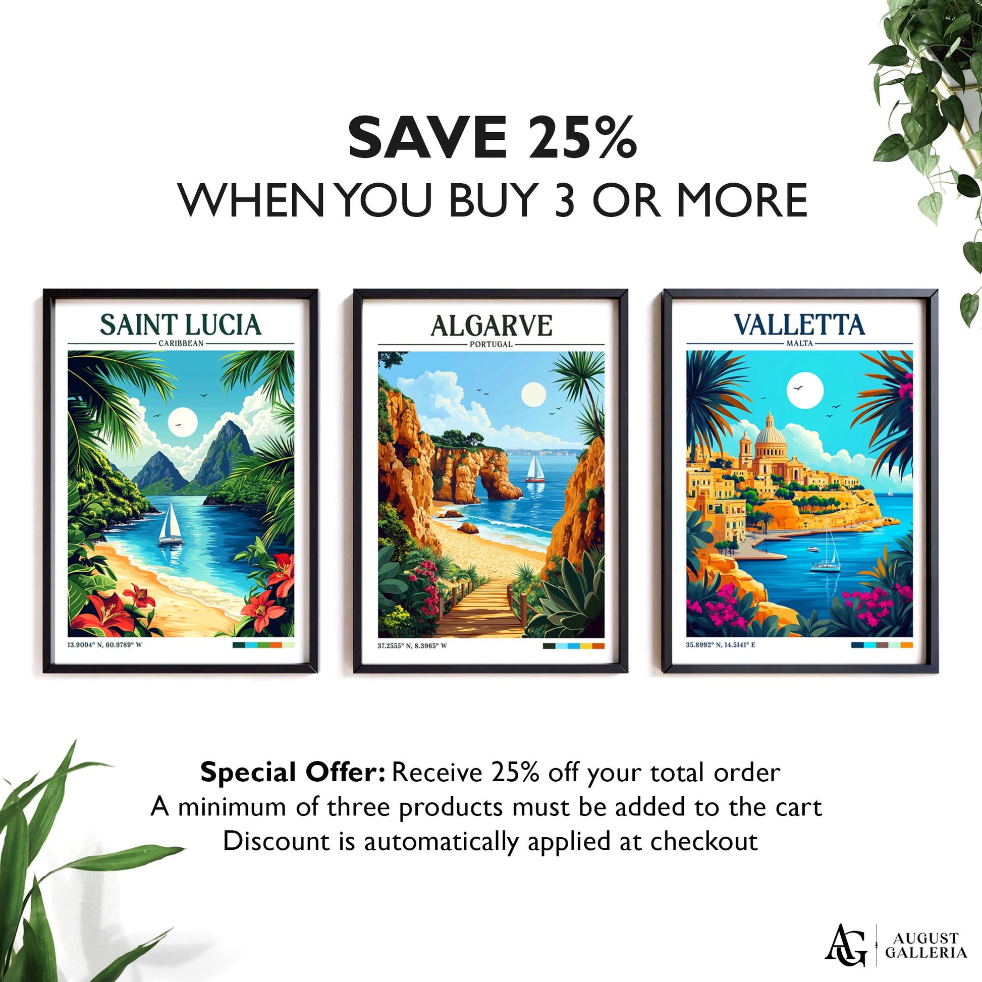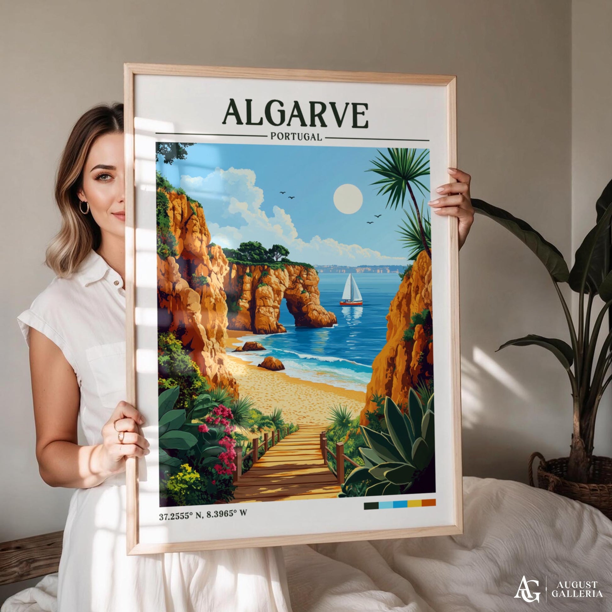 Embrace the sun-drenched beauty of the Algarve with this retro-inspired travel print. Known for its stunning beaches, dramatic cliffs, and charming towns, the Algarve’s coastal allure is captured in this nostalgic artwork. From its lively resort areas to its peaceful, hidden coves, the region offers a perfect blend of relaxation and adventure. Ideal for lovers of Portugal or those who cherish Mediterranean escapes, this print brings the laid-back elegance of the Algarve into your space, evoking memories of seaside tranquillity and vibrant culture.