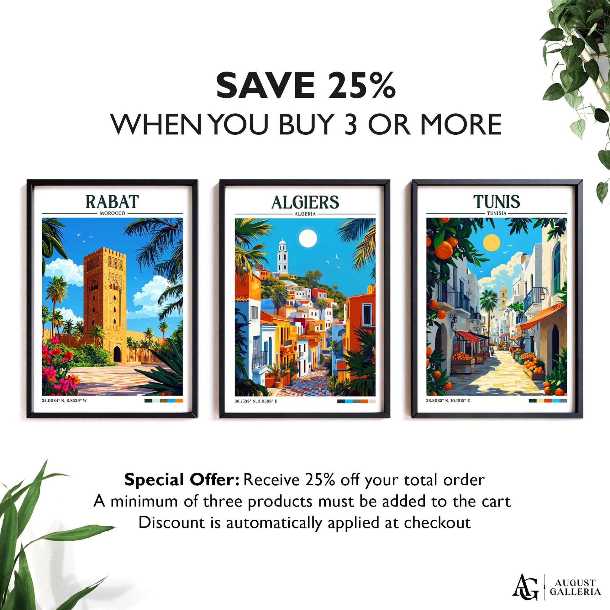 Discover the unique beauty and history of Algiers with this retro-inspired travel print. Nestled along the Mediterranean coast, Algiers is a city of rich cultural heritage, blending French colonial architecture with traditional Arabic influences. This artwork captures the essence of the city’s vibrant streets, stunning waterfront, and timeless charm. Ideal for those with a love for North African destinations or a fascination with Algiers’ fascinating history, this print brings the spirit of the Algerian capital into your home, evoking a sense of wanderlust and discovery.