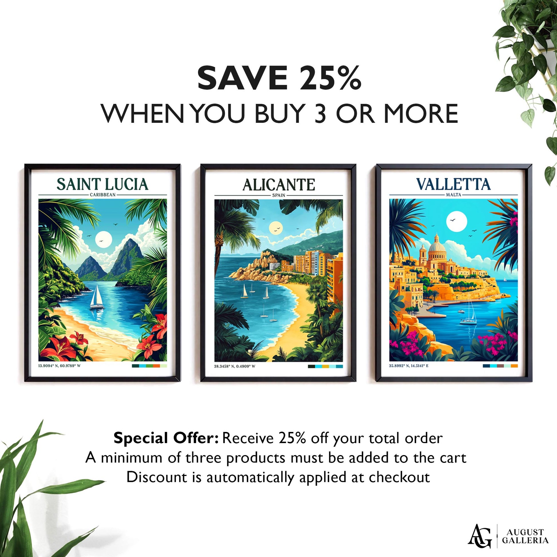 Immerse yourself in the Mediterranean charm of Alicante with this retro-inspired travel print. Celebrating the city’s sunny beaches, historic architecture, and vibrant cultural life, this artwork captures the essence of Alicante’s relaxed yet lively atmosphere. The city’s blend of Spanish tradition and coastal beauty makes it the perfect escape for those who appreciate seaside destinations and rich history. Whether you’ve walked its promenades or dream of the Spanish sun, this print brings the inviting spirit of Alicante into your space, evoking a sense of warmth and adventure.
