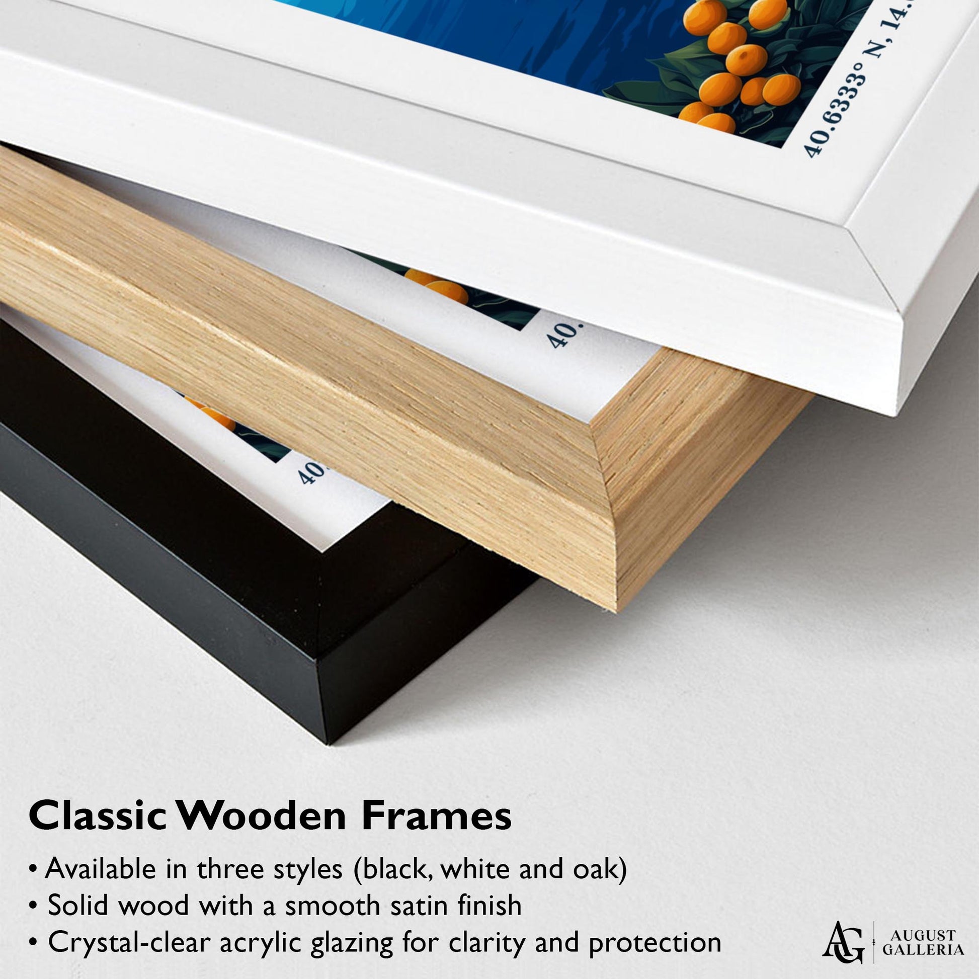 Made from sustainably sourced European wood and delivered ready to hang, available in black, white, or natural oak finishes. Includes a durable crystal-clear, shatter-resistant Perspex glaze for lasting protection and a sleek, modern look.