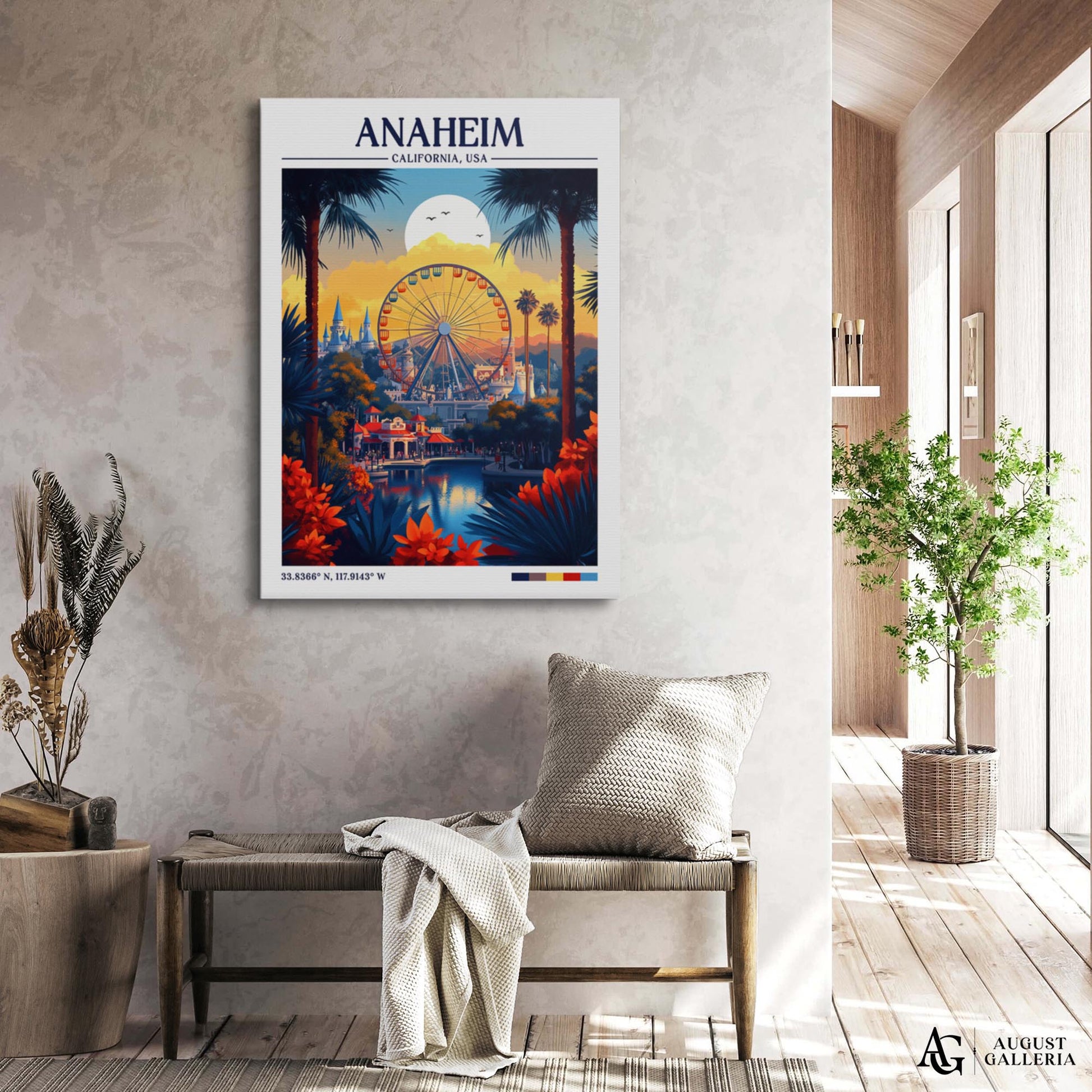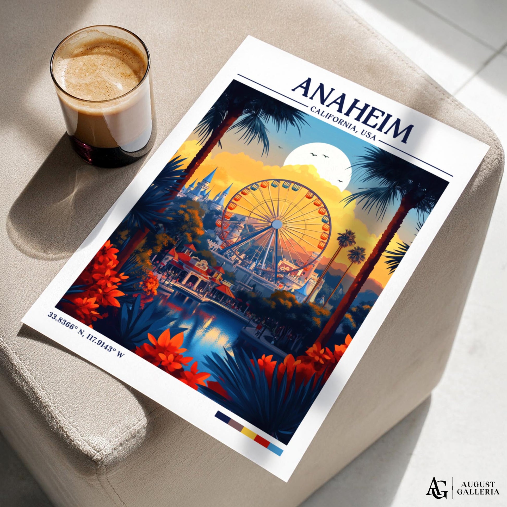 Step into the fun and excitement of Anaheim with this retro-inspired travel print. Known for its vibrant entertainment scene and family-friendly atmosphere, Anaheim embodies the spirit of California’s sunny charm. This artwork captures the lively energy of the city, offering a nostalgic glimpse into its attractions and Southern California lifestyle. Ideal for fans of theme parks, warm weather, and the iconic West Coast vibe, this print brings Anaheim’s adventurous spirit into your space, evoking a sense of joy, imagination, and timeless fun.
