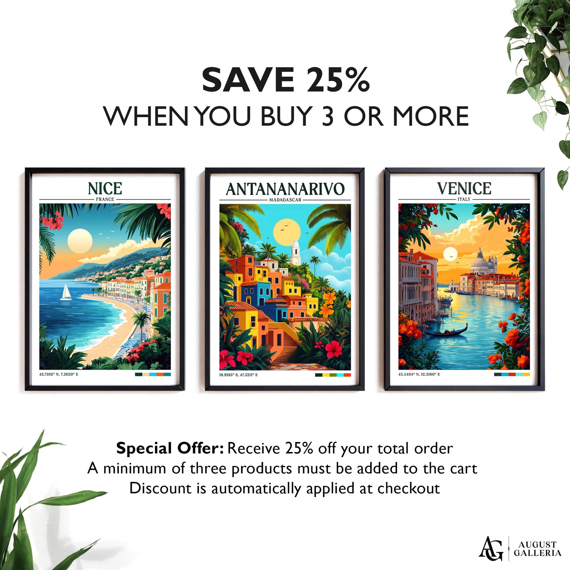 Experience the unique charm of Antananarivo with this retro-inspired travel print, celebrating the vibrant culture and history of Madagascar’s capital. Nestled in the highlands, this bustling city blends colonial architecture with traditional Malagasy influences, offering a fascinating glimpse into the heart of the island. This artwork captures Antananarivo’s dynamic energy and rich heritage, perfect for those who are drawn to off-the-beaten-path destinations or the distinct beauty of Madagascar. Whether you've visited or dream of exploring its streets, this print brings the spirit of Antananarivo into your space, evoking a sense of adventure and discovery.