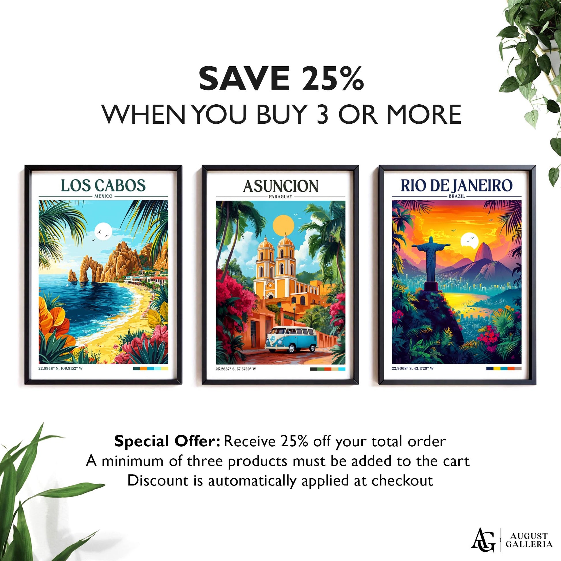 Discover the vibrant heart of Paraguay with this retro-inspired travel print, capturing the spirit of Asunción, the nation’s bustling capital. Known for its mix of modern architecture and historical charm, Asunción offers a dynamic blend of culture, tradition, and riverside beauty. This artwork evokes the city’s lively energy, from its thriving markets to its scenic parks, perfect for those who appreciate South American destinations or have a connection to Paraguay’s rich heritage. Whether you’ve visited or dream of exploring, this print brings the essence of Asunción into your home, inspiring a sense of adventure and discovery.