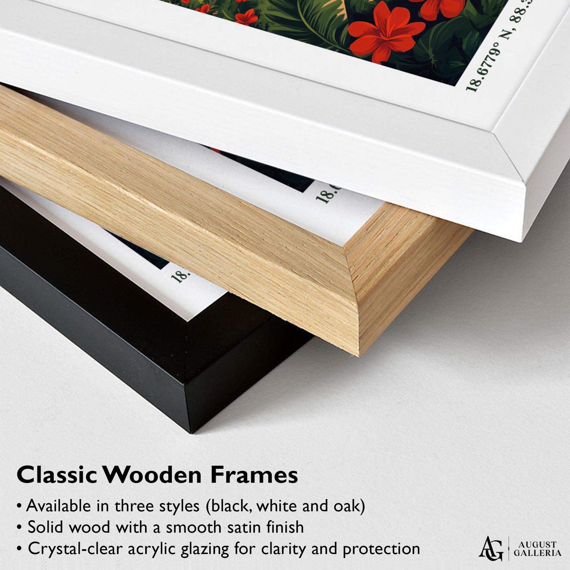 Made from sustainably sourced European wood and delivered ready to hang, available in black, white, or natural oak finishes. Includes a durable crystal-clear, shatter-resistant Perspex glaze for lasting protection and a sleek, modern look.