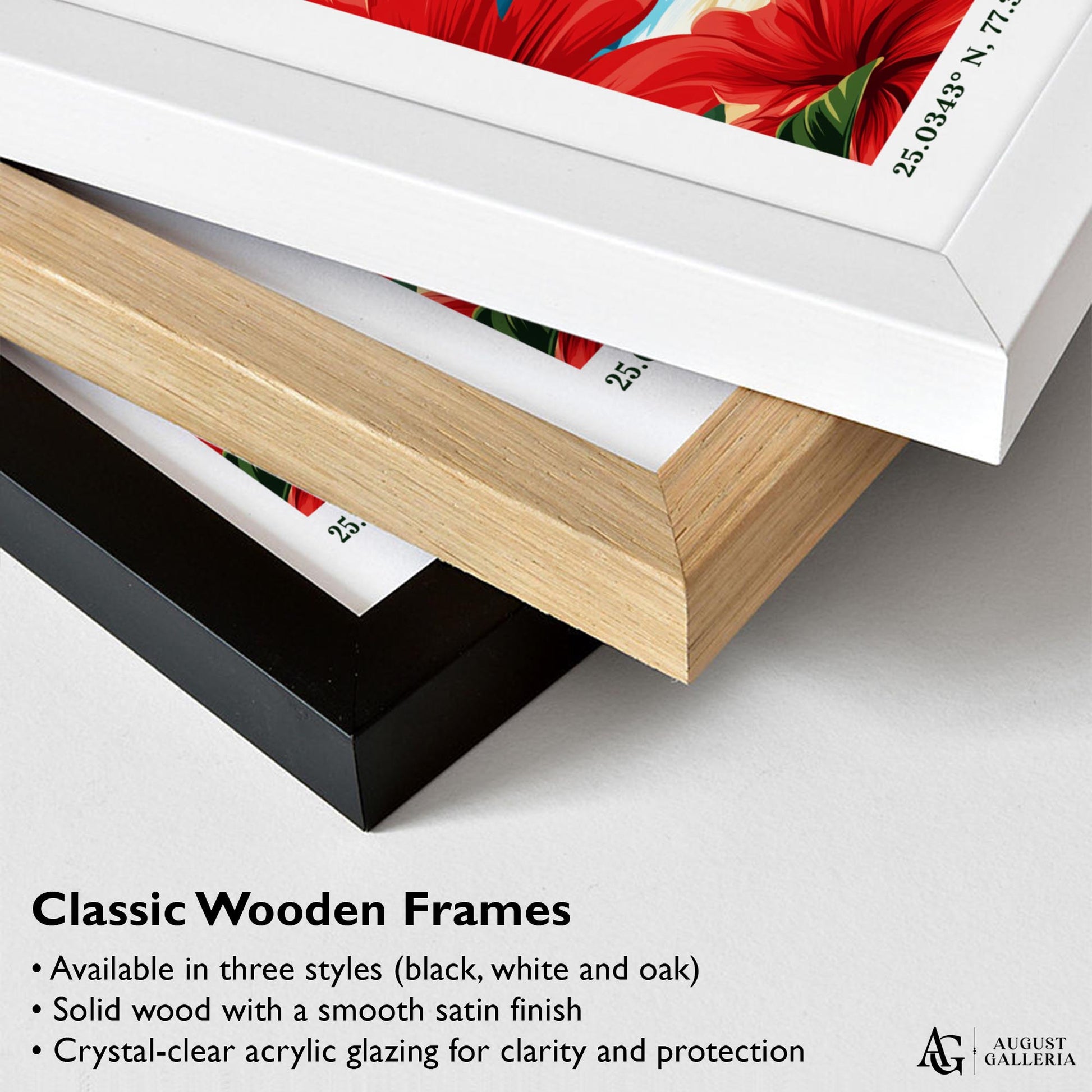 Made from sustainably sourced European wood and delivered ready to hang, available in black, white, or natural oak finishes. Includes a durable crystal-clear, shatter-resistant Perspex glaze for lasting protection and a sleek, modern look.
