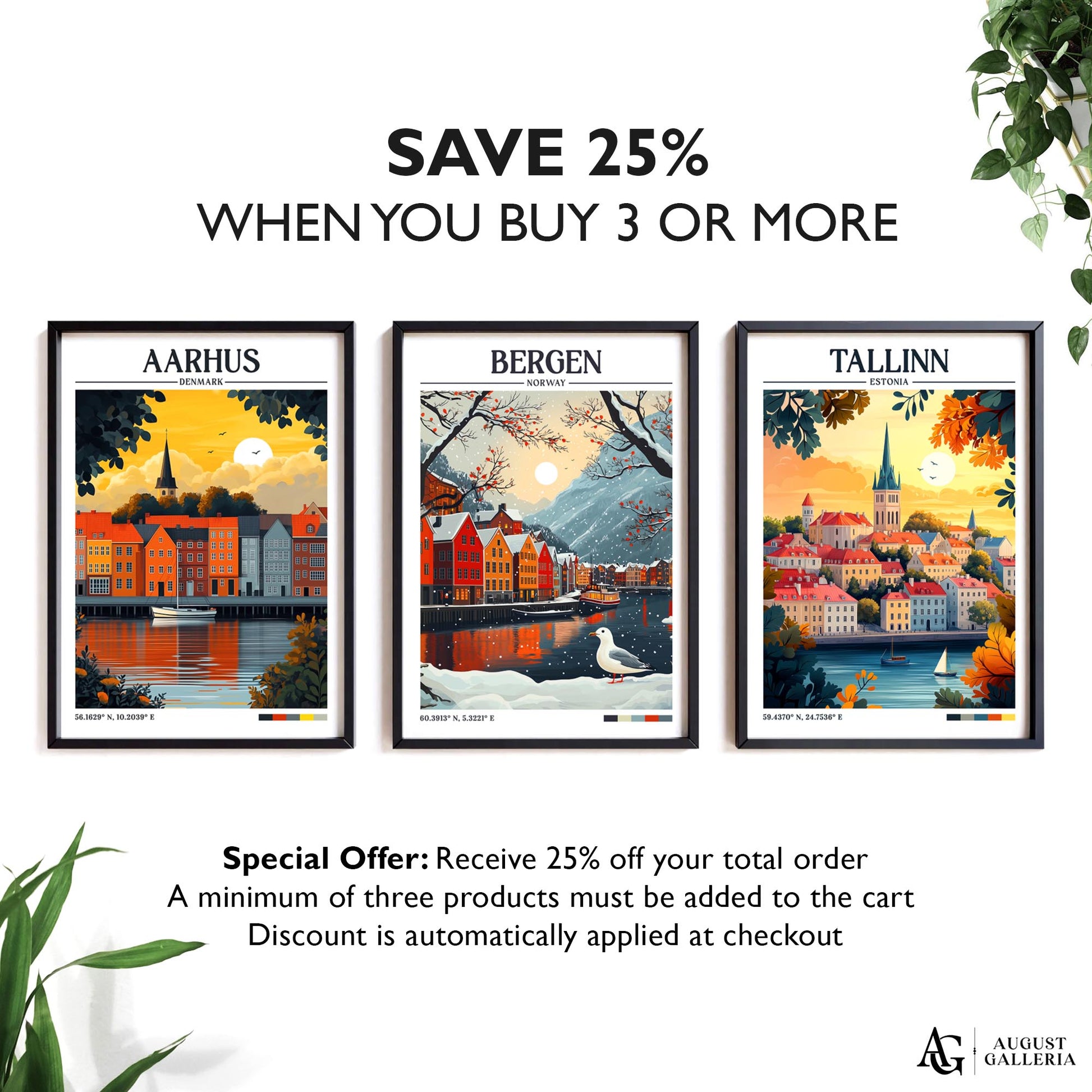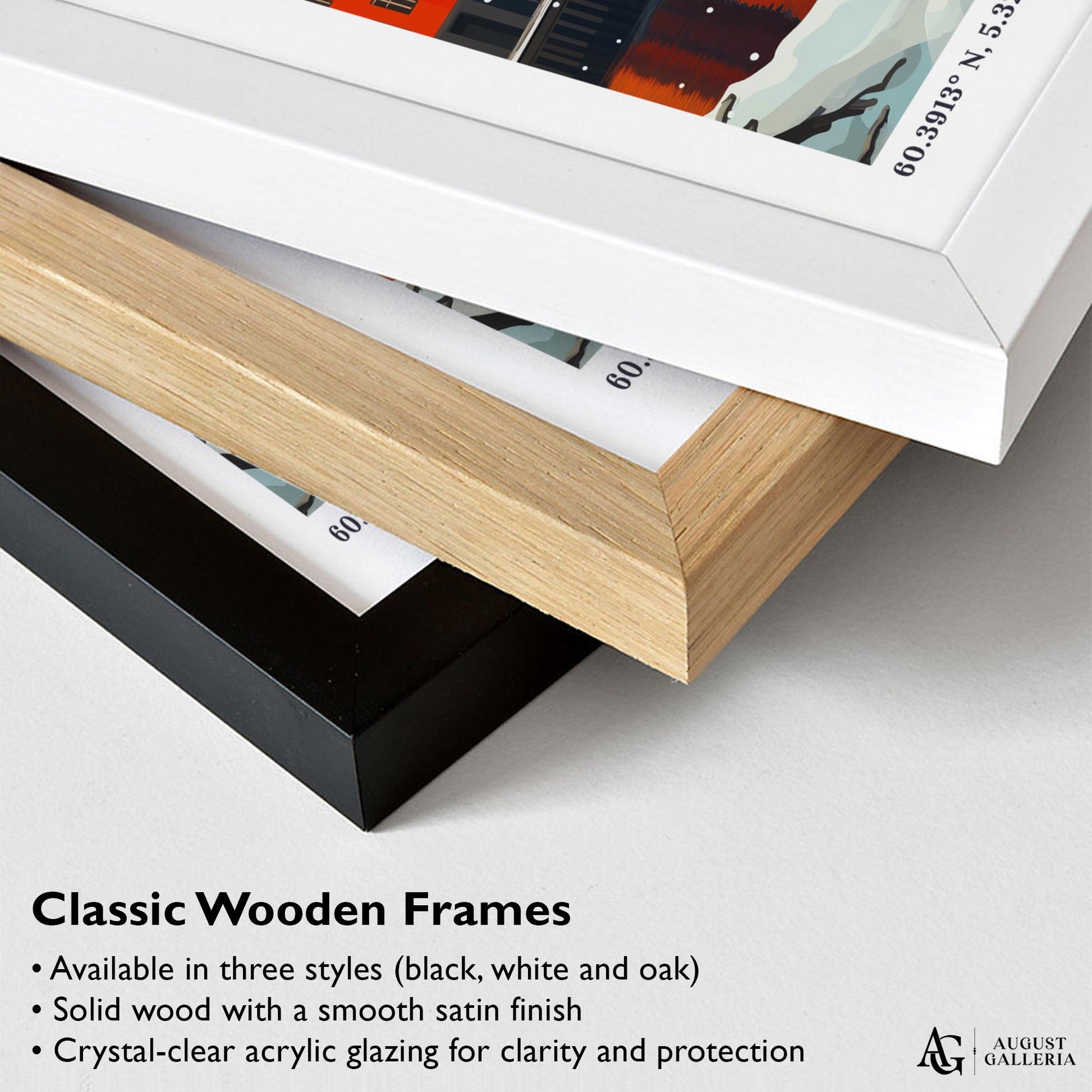 Discover the stunning beauty and coastal charm of Bergen with this retro-inspired travel print, celebrating the essence of this picturesque Norwegian city. Known for its charming wooden houses, dramatic fjords, and rich maritime history, Bergen is a gateway to some of Norway’s most breath-taking landscapes. This artwork captures the city’s unique atmosphere, from its colourful harbour to its surrounding mountains, offering a perfect addition for lovers of nature, Nordic culture, and seaside destinations. Whether you've explored its scenic streets or dream of visiting, this print brings the spirit of Bergen into your home, evoking a sense of tranquillity and adventure.