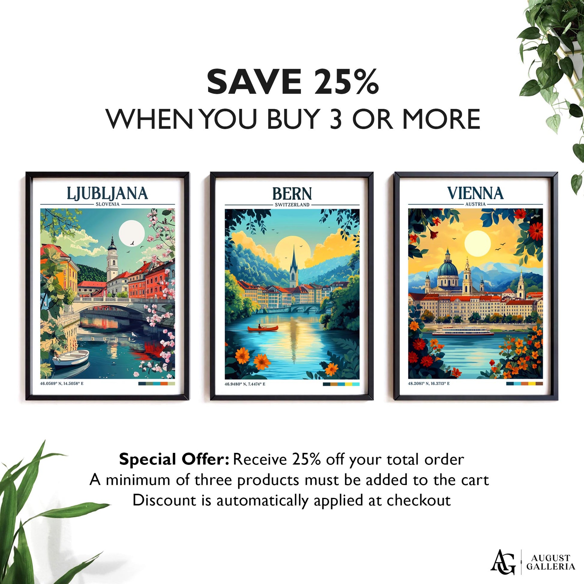 Embrace the charm and history of Bern with this retro-inspired travel print, celebrating the capital of Switzerland. Known for its well-preserved medieval architecture, picturesque streets, and scenic location along the Aare River, Bern offers a perfect blend of old-world elegance and natural beauty. This artwork captures the city’s unique atmosphere, from its iconic clock tower to its tranquil parks, making it ideal for those who appreciate Swiss culture, history, and outdoor adventures. Whether you’ve wandered through its cobblestone streets or dream of visiting, this print brings the essence of Bern into your home, evoking a sense of peace and exploration.