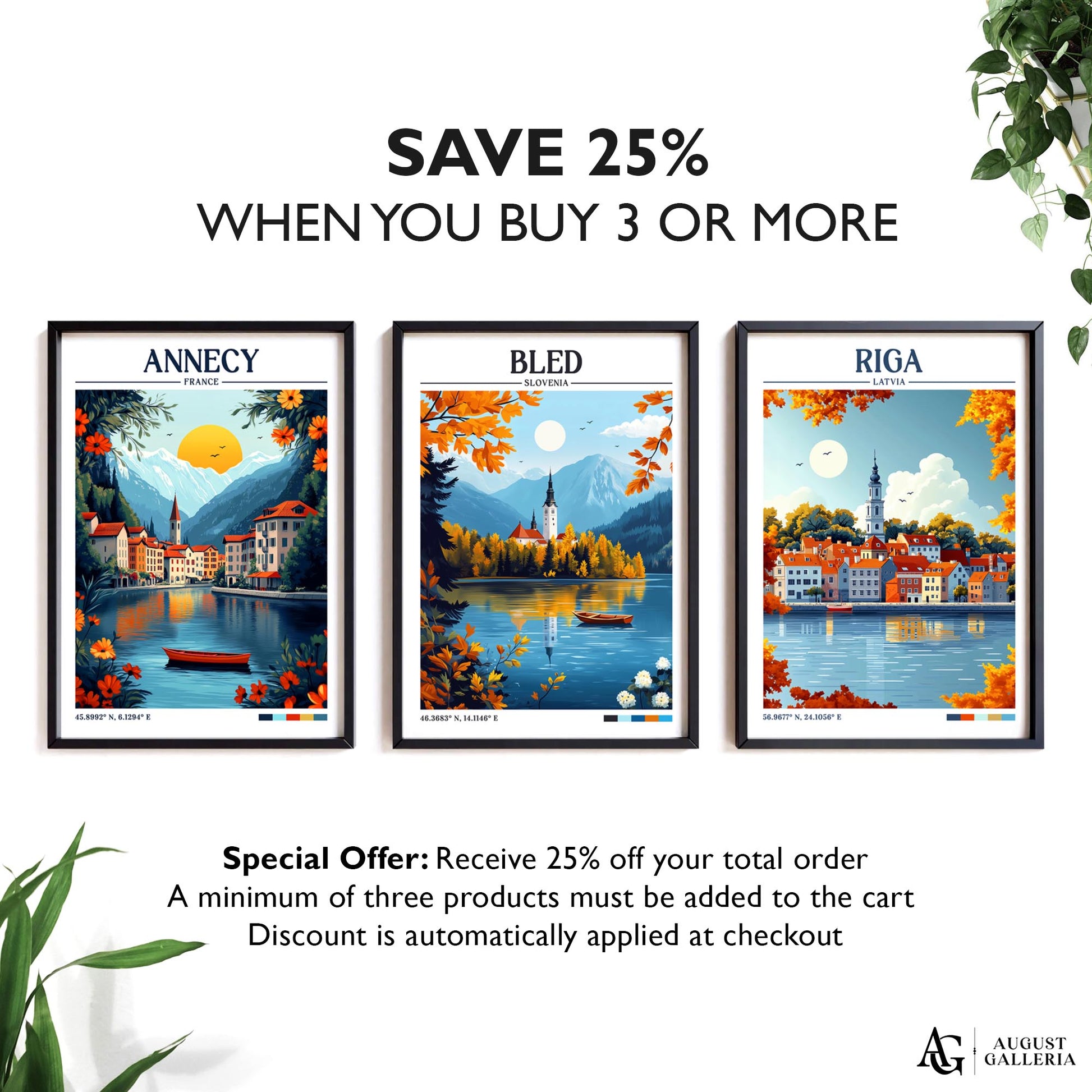 Experience the enchanting beauty of Bled with this retro-inspired travel print, celebrating one of Slovenia's most picturesque destinations. Known for its fairy-tale-like island in the centre of Lake Bled, surrounded by lush forests and towering mountains, Bled is a haven for nature lovers and adventure seekers. This artwork captures the serene atmosphere of the town, from its stunning lake views to its charming medieval castle, offering a perfect addition for those who appreciate tranquil escapes, alpine landscapes, or European heritage. Whether you've visited its iconic lake or dream of seeing it first-hand, this print brings the spirit of Bled into your home, evoking a sense of peace and wonder.