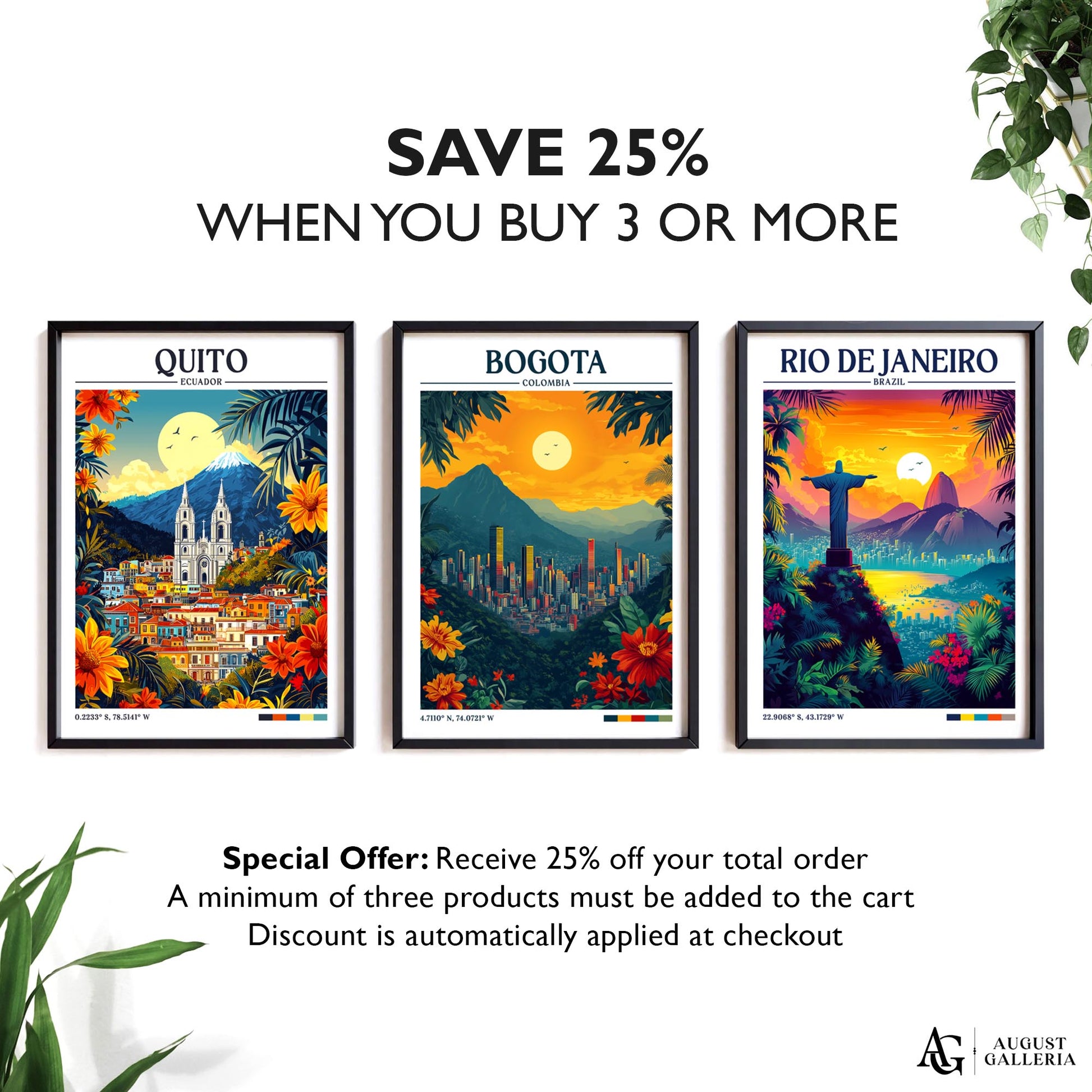 Step into the vibrant heart of Colombia with this retro-inspired travel print, celebrating Bogotá, the country’s lively capital. Known for its rich cultural heritage, stunning mountain views, and bustling urban life, Bogotá is a city where history and modernity coexist in dynamic harmony. This artwork captures the essence of the city, from its lively neighbourhoods to its historical landmarks, making it perfect for those who appreciate Latin American culture, vibrant city life, and breath-taking landscapes. Whether you’ve wandered its cobblestone streets or dream of experiencing its energy, this print brings the spirit of Bogotá into your home, evoking a sense of adventure and cultural discovery.
