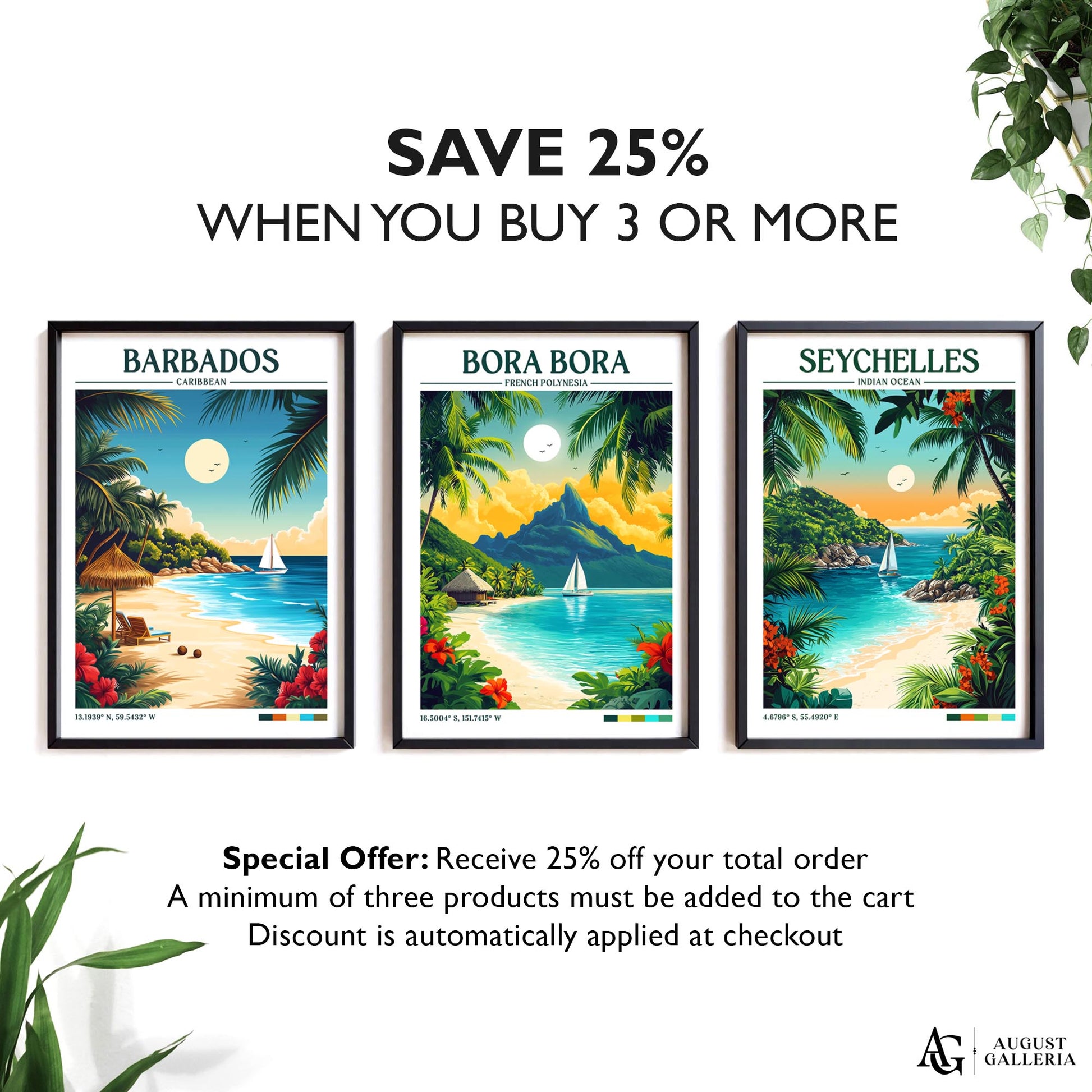 Escape to the tropical paradise of Bora Bora with this retro-inspired travel print, capturing the breath-taking beauty of one of the world’s most coveted island destinations. Known for its crystal-clear lagoons, overwater bungalows, and lush, green landscapes, Bora Bora is a true tropical escape. This artwork evokes the island’s serene atmosphere, from its turquoise waters to its stunning mountain peaks, offering the perfect reminder of the ultimate getaway. Whether you’ve relaxed on its pristine beaches or dream of visiting this island haven, this print brings the spirit of Bora Bora into your home, evoking a sense of tranquillity and island bliss.