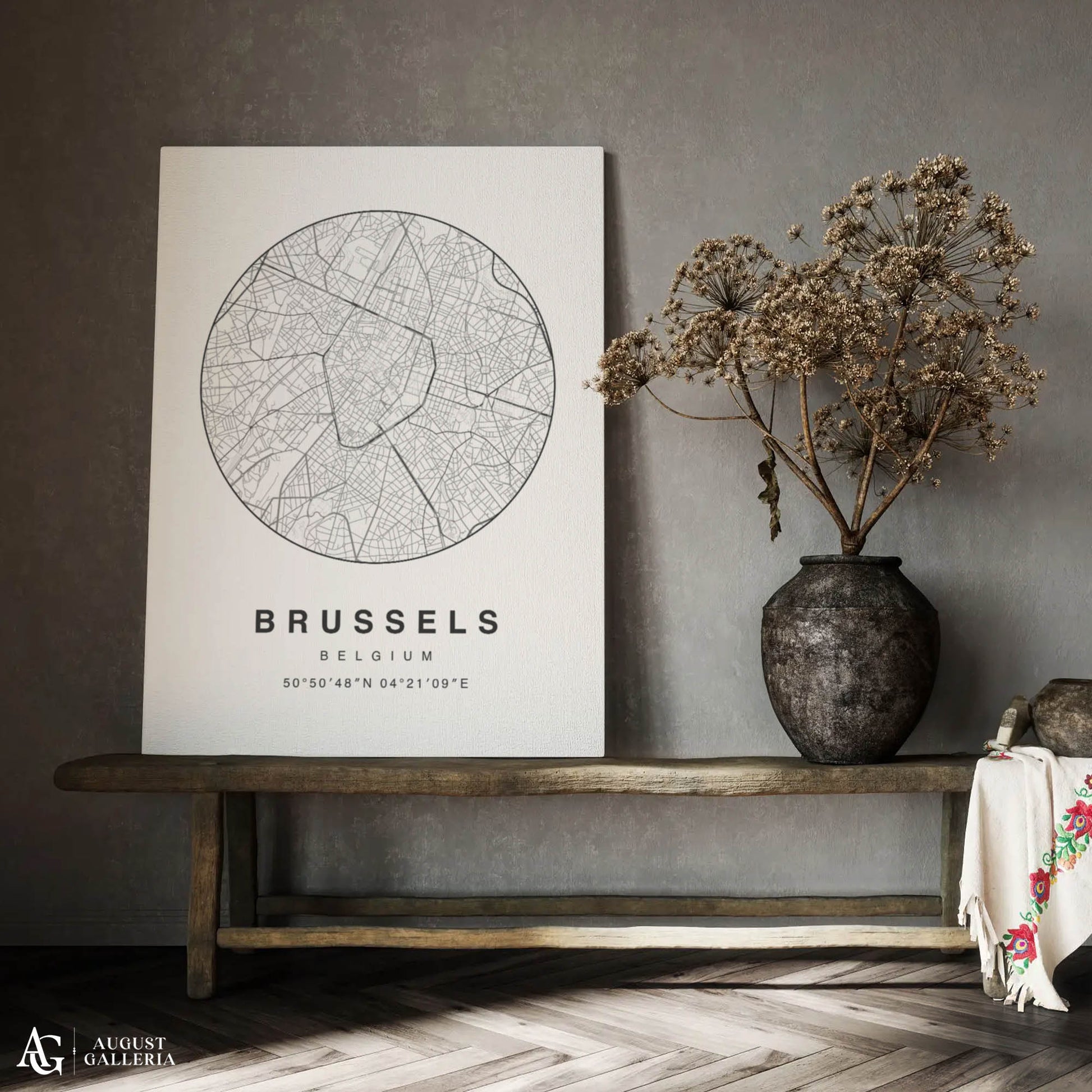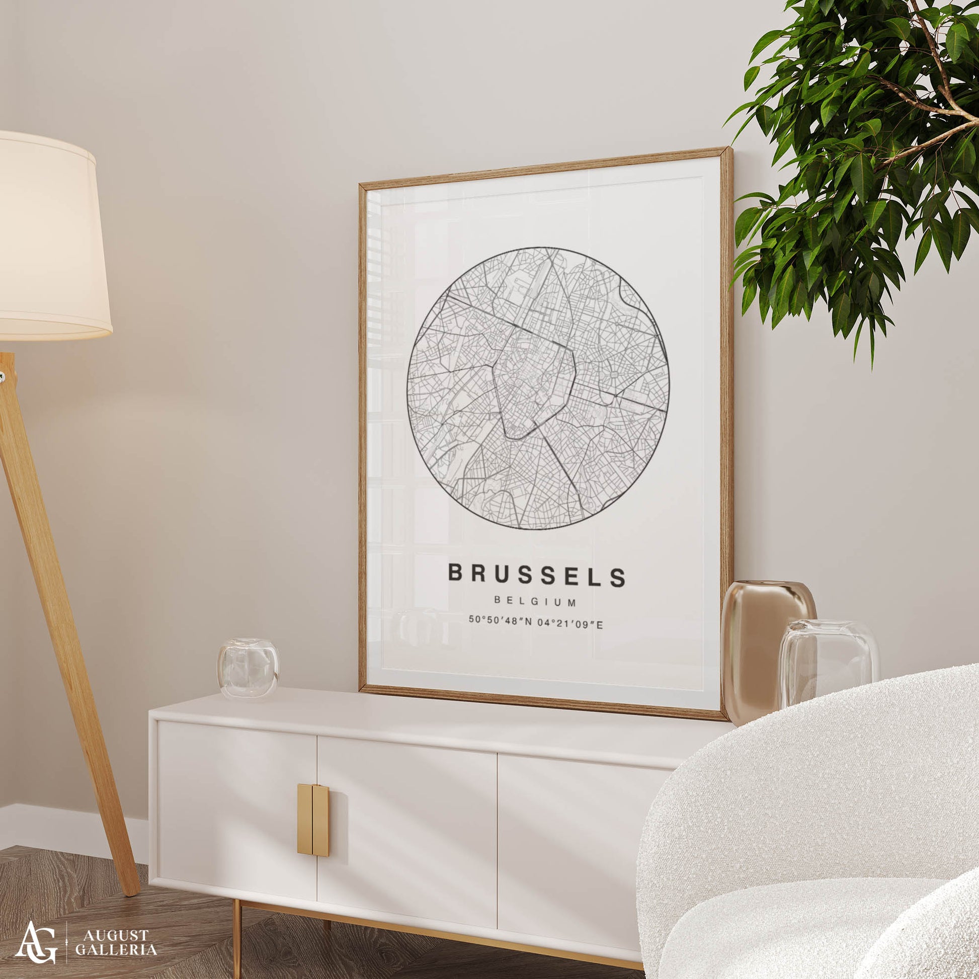 A minimalist map print of Brussels elegantly showcasing Belgium's capital with clean lines and a modern aesthetic. Highlighting Brussels' iconic landmarks such as the Grand Place, Atomium, and European Quarter, this artwork blends simplicity with cultural significance. Perfect for enthusiasts of European culture and contemporary decor, this print adds a touch of sophistication and urban charm to any space, celebrating Brussels' rich history and architectural beauty in minimalist style.