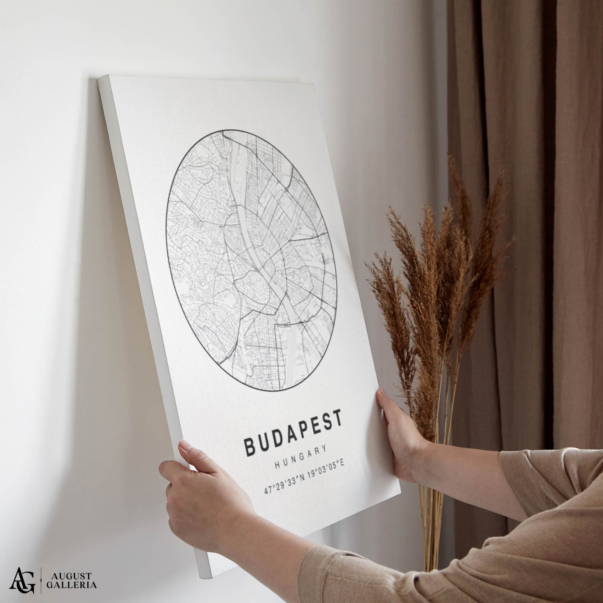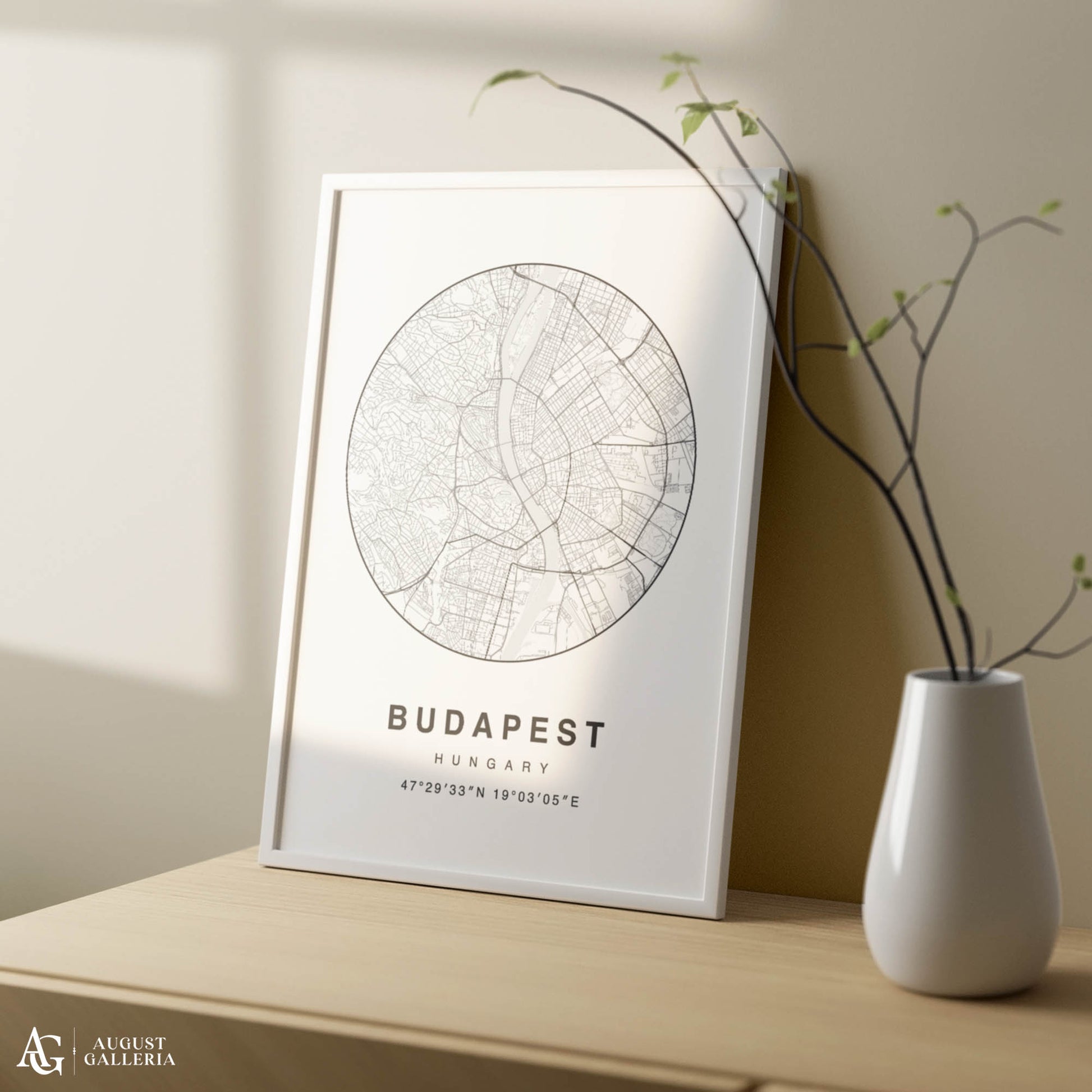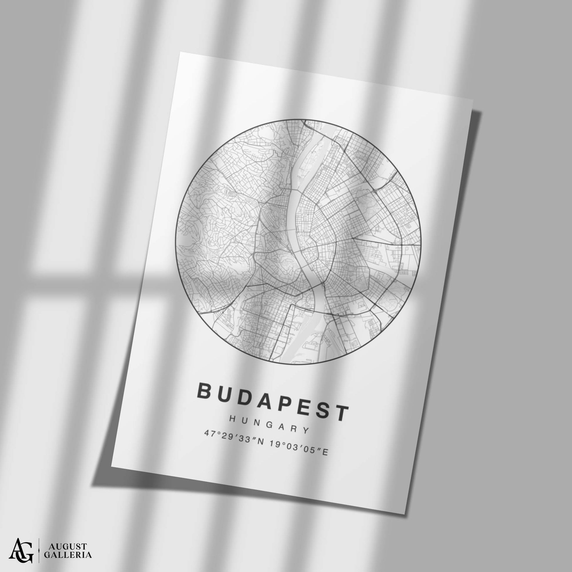 A minimalist map print of Budapest beautifully showcasing Hungary's majestic capital with clean lines and a modern aesthetic. Highlighting Budapest's iconic landmarks such as the Chain Bridge, Parliament Building, and Buda Castle, this artwork blends simplicity with cultural significance. Perfect for enthusiasts of European culture and contemporary decor, this print adds a touch of sophistication and historical charm to any space, celebrating Budapest's rich heritage and architectural grandeur in minimalist style.