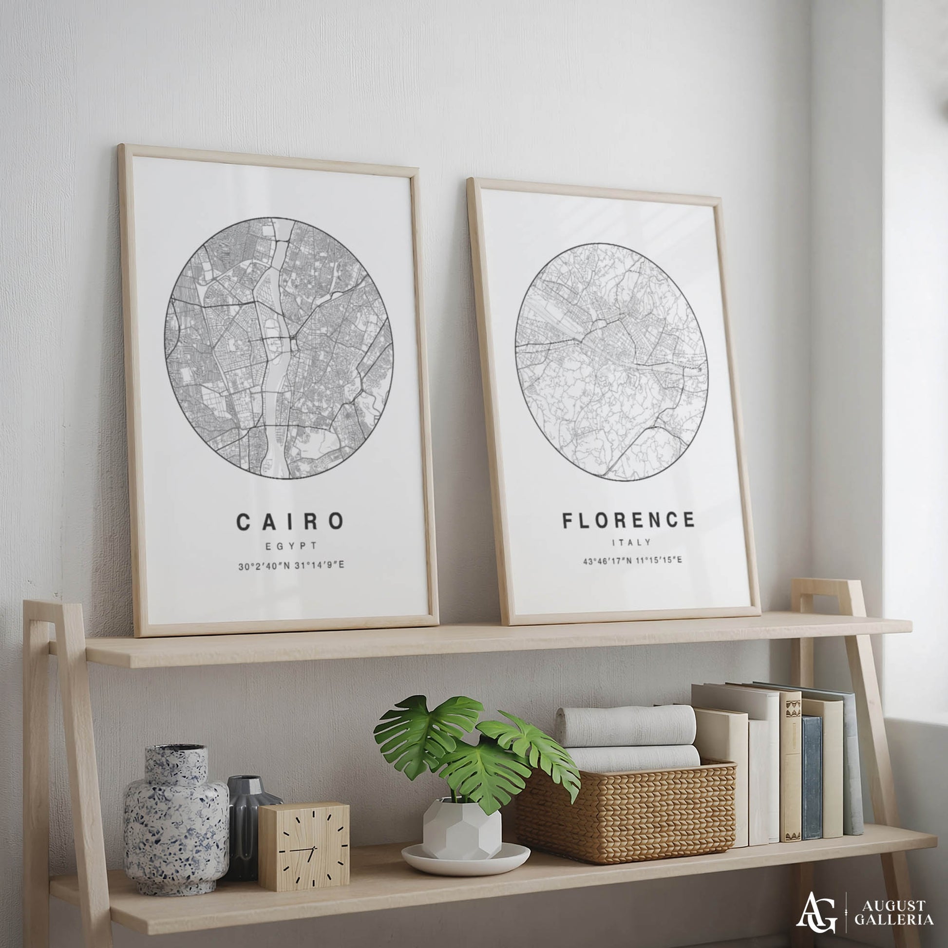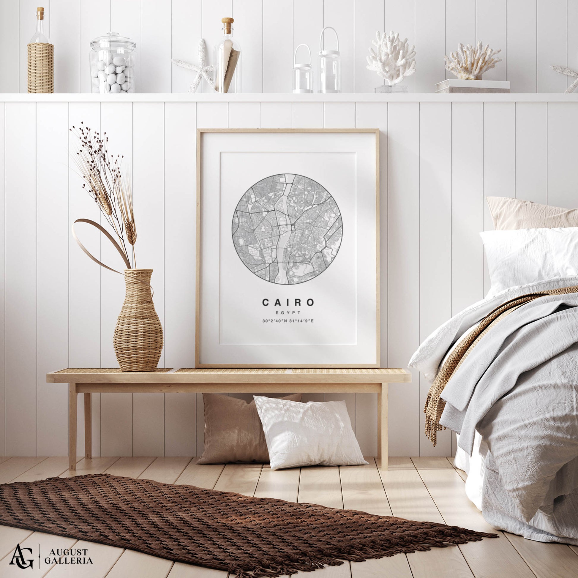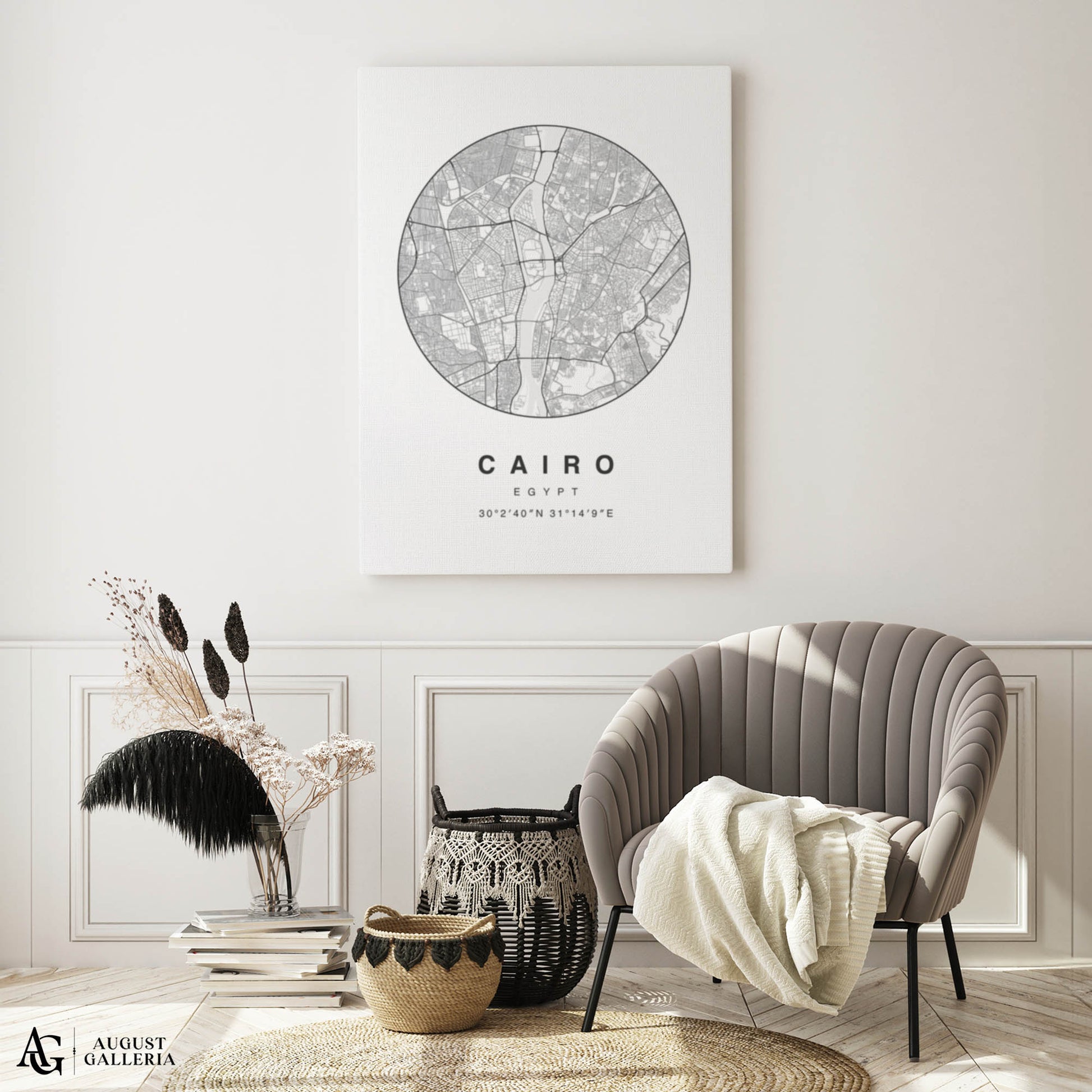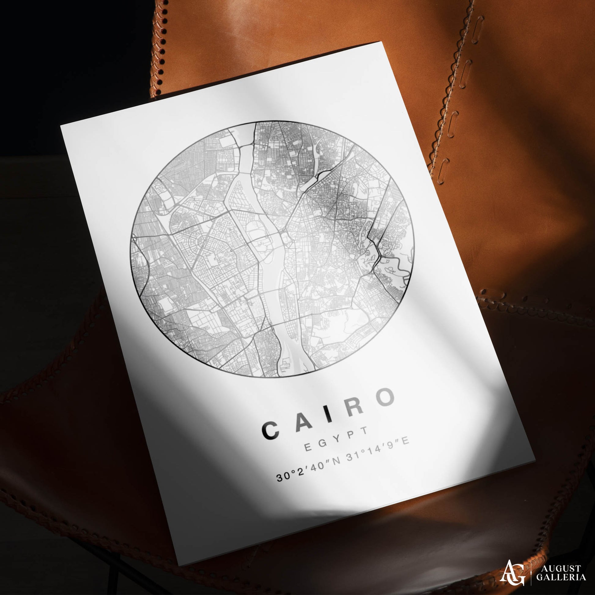 A minimalist map print of Cairo elegantly capturing Egypt's historic capital with clean lines and a modern design. Highlighting Cairo's iconic landmarks such as the Great Pyramids of Giza, the Sphinx, and historic mosques like Al-Azhar Mosque, this artwork blends simplicity with cultural significance. Perfect for admirers of ancient civilizations and contemporary decor, this print adds a touch of sophistication and cultural depth to any space, celebrating Cairo's rich heritage and architectural marvels in minimalist style.