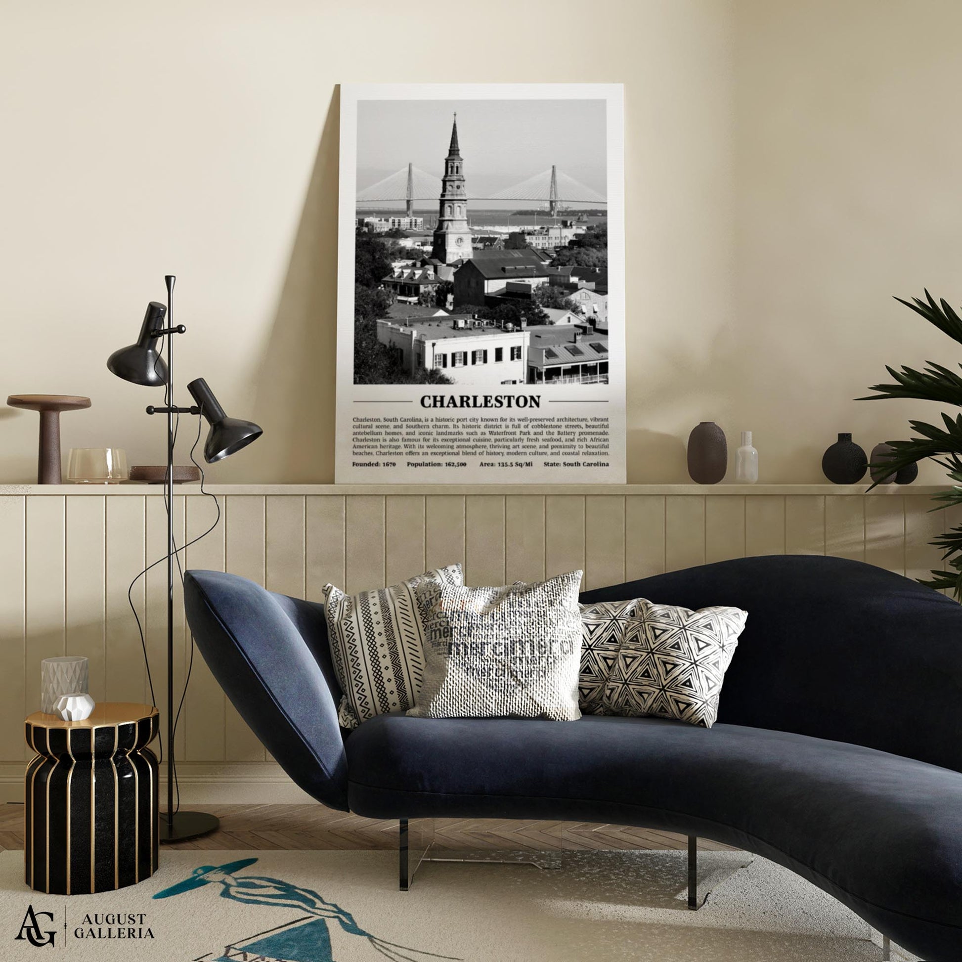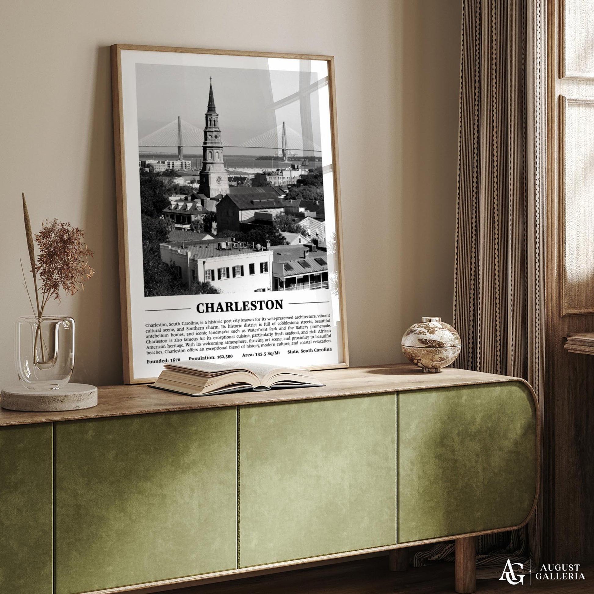 A black and white print of Charleston providing a glimpse into the city's history and significance. Perfect for modern interiors, this piece exudes sophistication and offers a window into the city's soul.