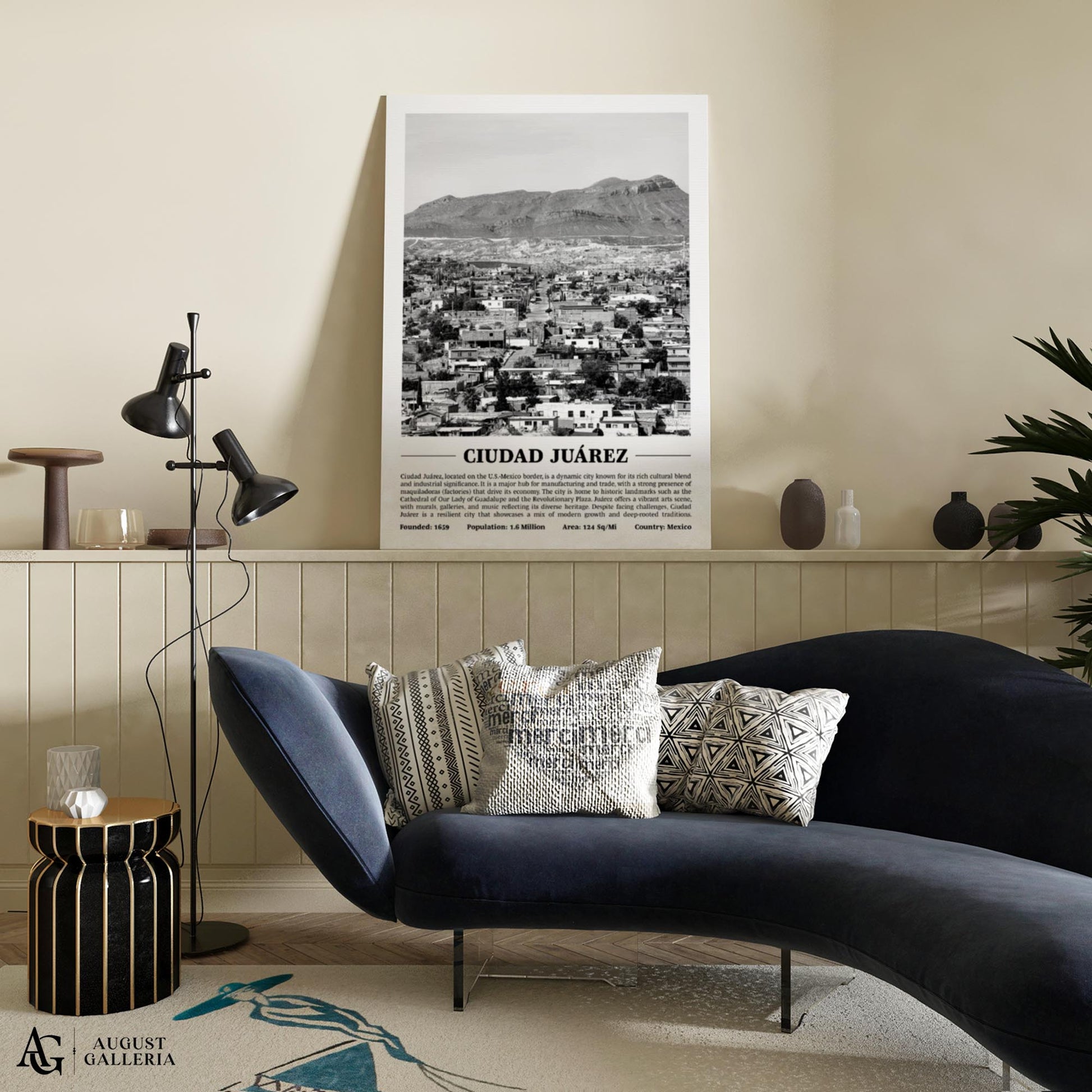 A black and white print of Ciudad Juarez providing a glimpse into the city's history and significance. Perfect for modern interiors, this piece exudes sophistication and offers a window into the city's soul.