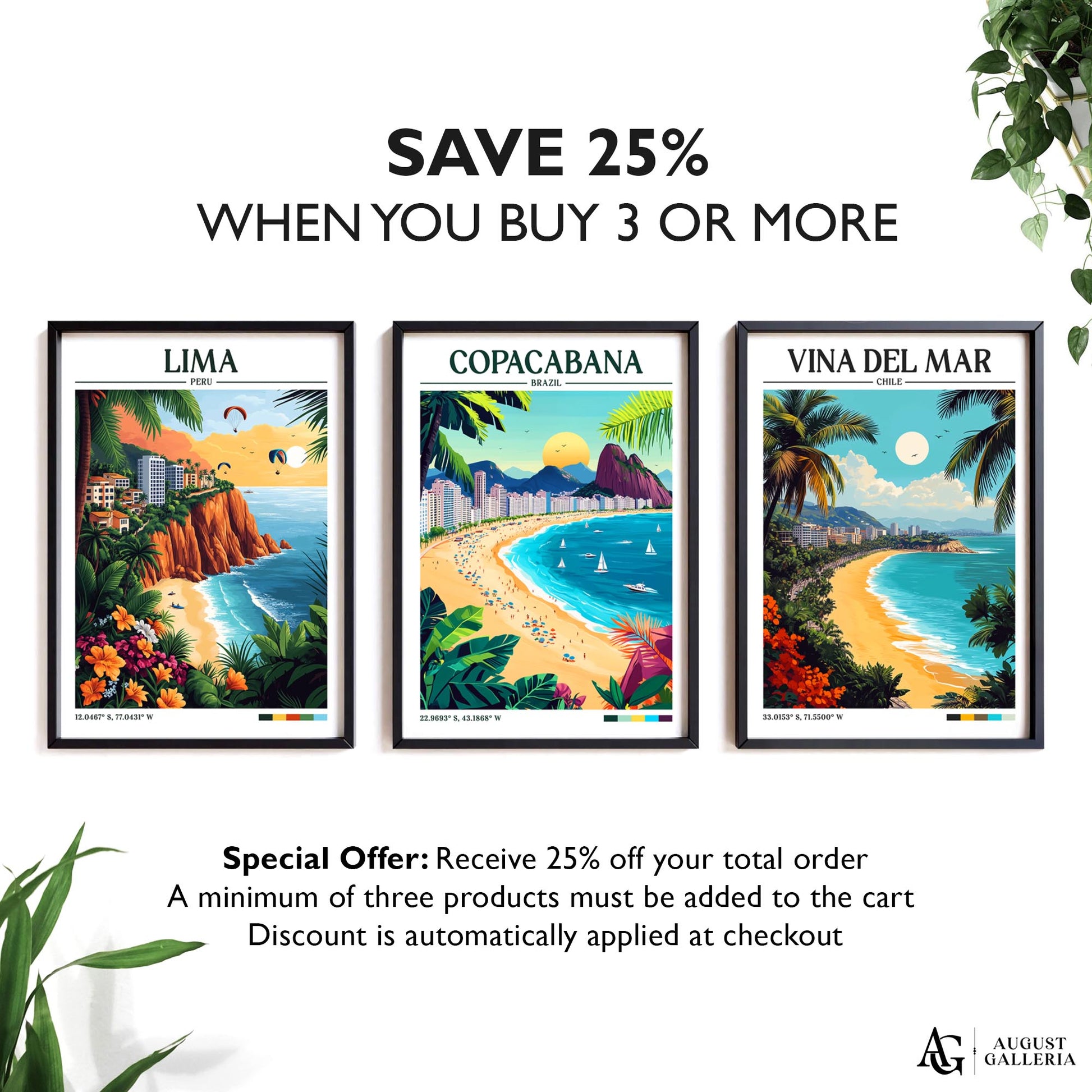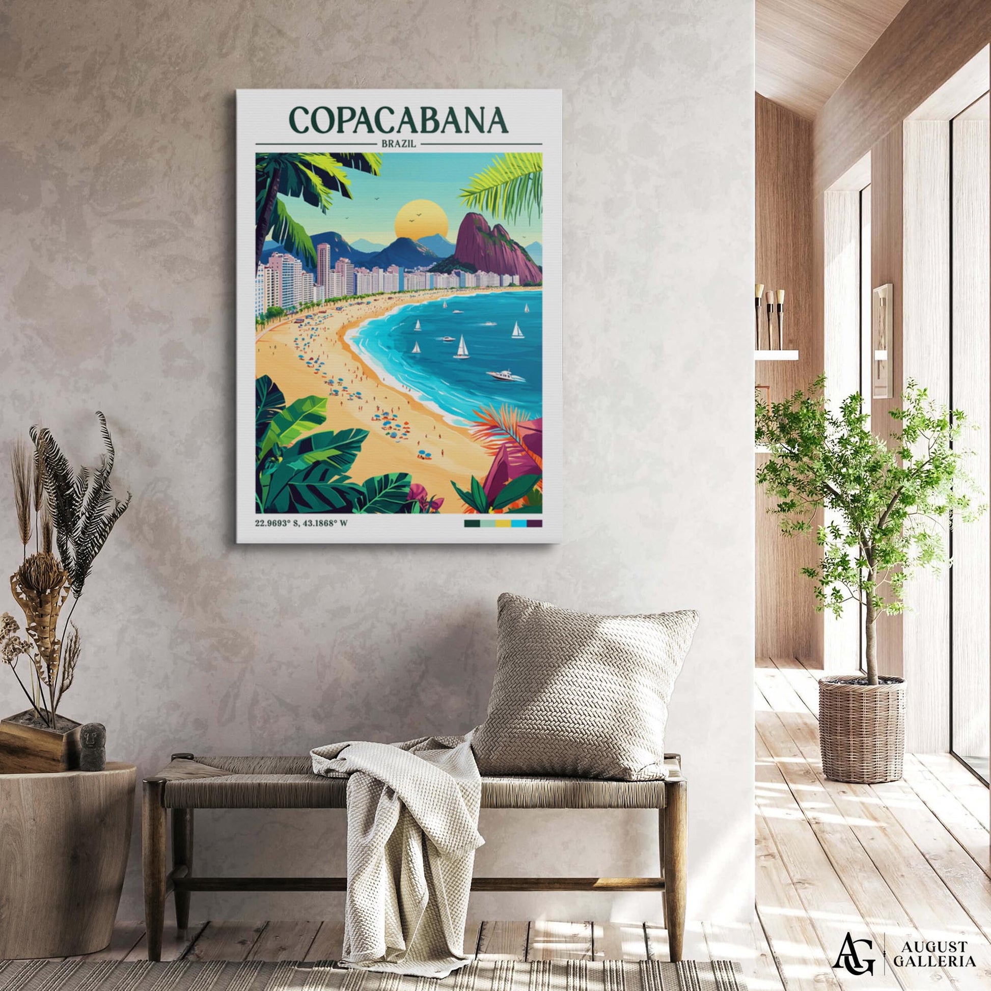 Capture the vibrant energy and iconic beauty of Copacabana with this retro-inspired travel print, celebrating one of the world’s most famous beach destinations. Known for its lively atmosphere, golden sands, and breath-taking ocean views, Copacabana is a place where tropical relaxation meets urban excitement. This artwork showcases the essence of the neighbourhood, from its bustling beachfront to its dynamic culture, making it perfect for those who appreciate sun-soaked escapes, Brazilian culture, and coastal vibes. Whether you’ve strolled along its famous shoreline or dream of visiting, this print brings the spirit of Copacabana into your home, evoking a sense of adventure and paradise.