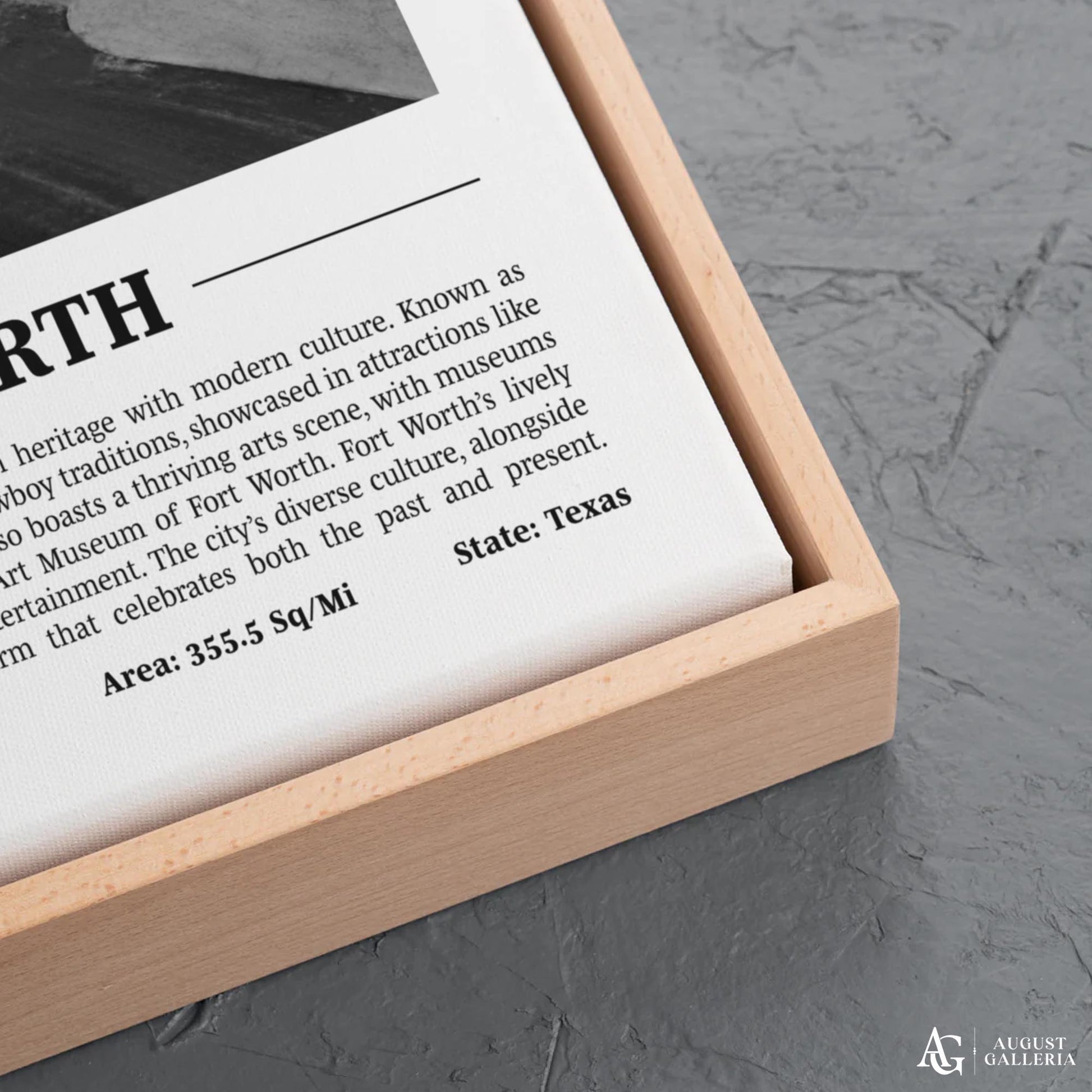 A black and white print of Fort Worth providing a glimpse into the city's history and significance. Perfect for modern interiors, this piece exudes sophistication and offers a window into the city's soul.