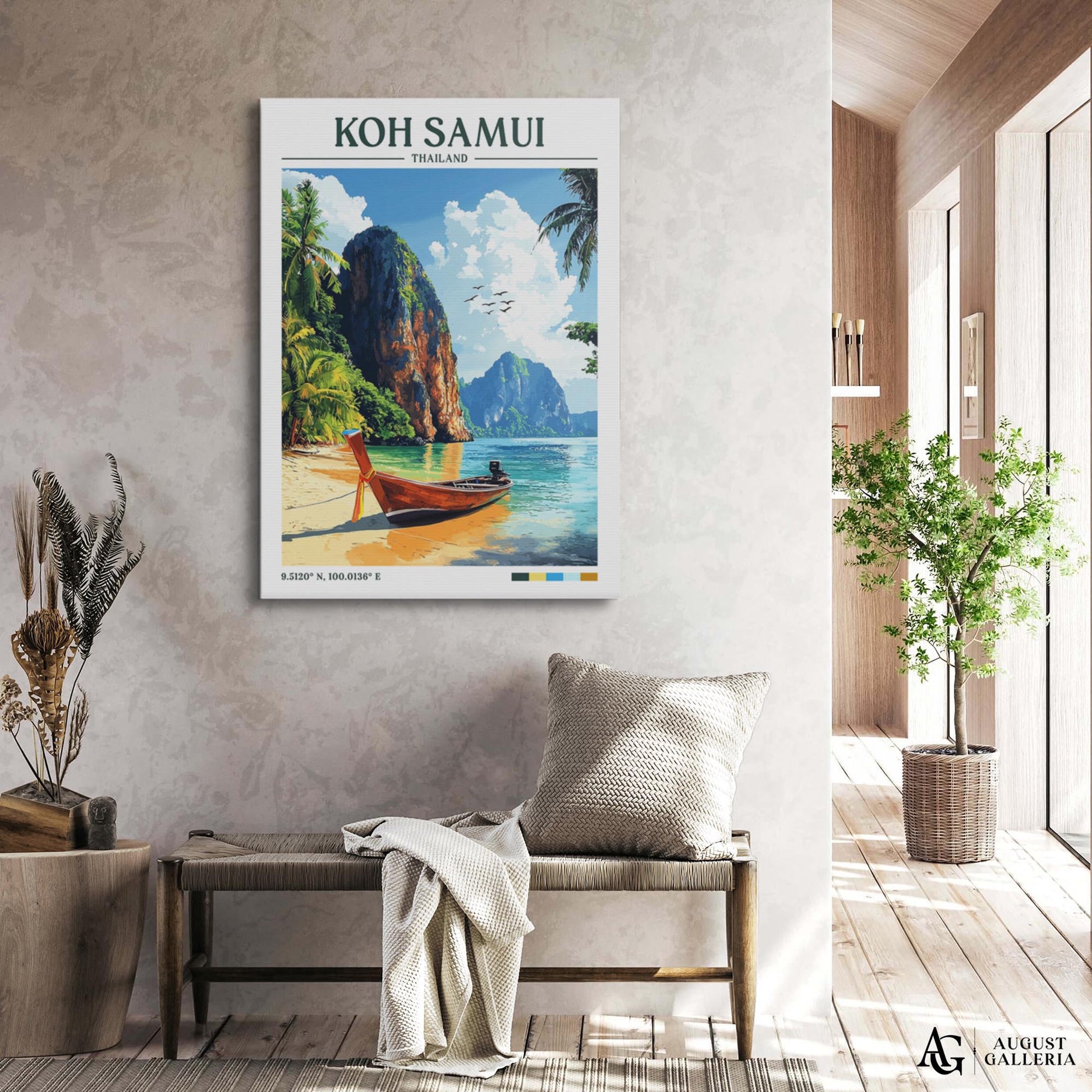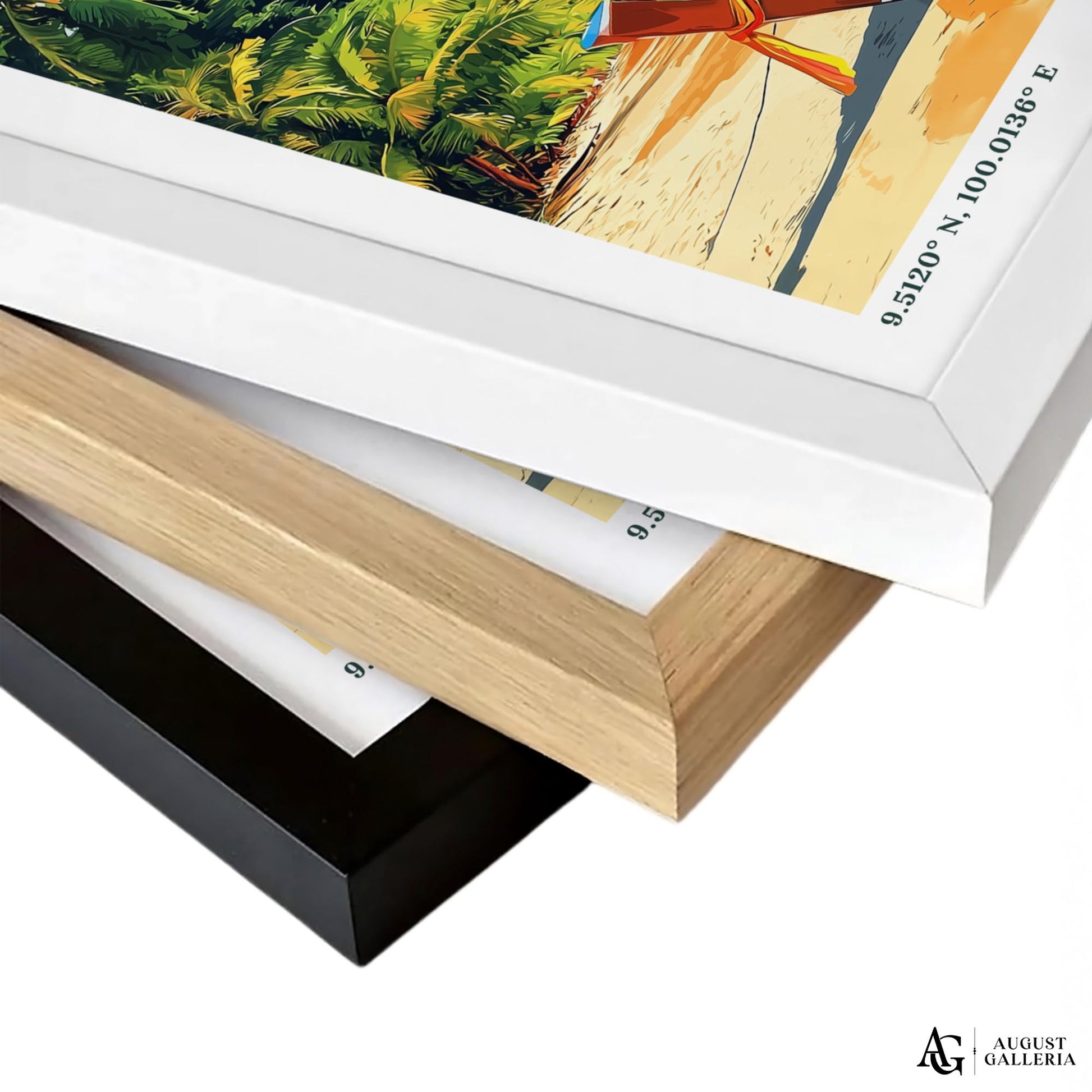 Immerse yourself in the island escape of Koh Samui with this retro travel print, celebrating the unique blend of laid-back charm and vibrant island life. Known for its palm-fringed beaches, lush hills, and lively coastal towns, Koh Samui captures the spirit of tropical adventure and relaxation. This artwork invites you to daydream of serene shores, bustling night markets, and the gentle rhythms of island living that make Koh Samui one of Thailand’s most beloved destinations.