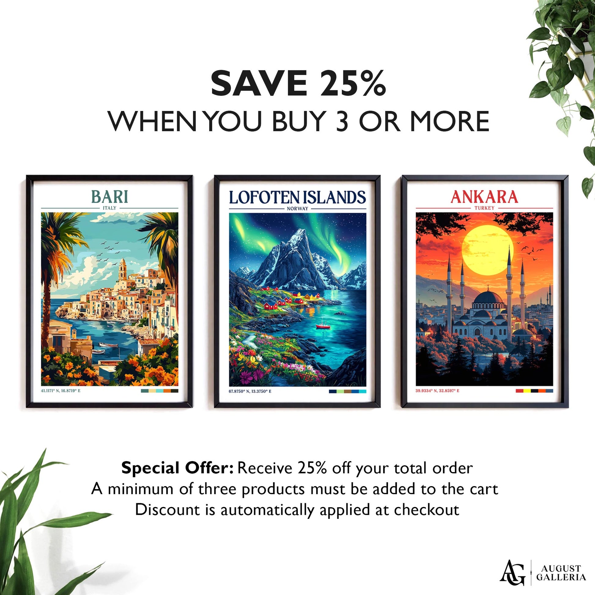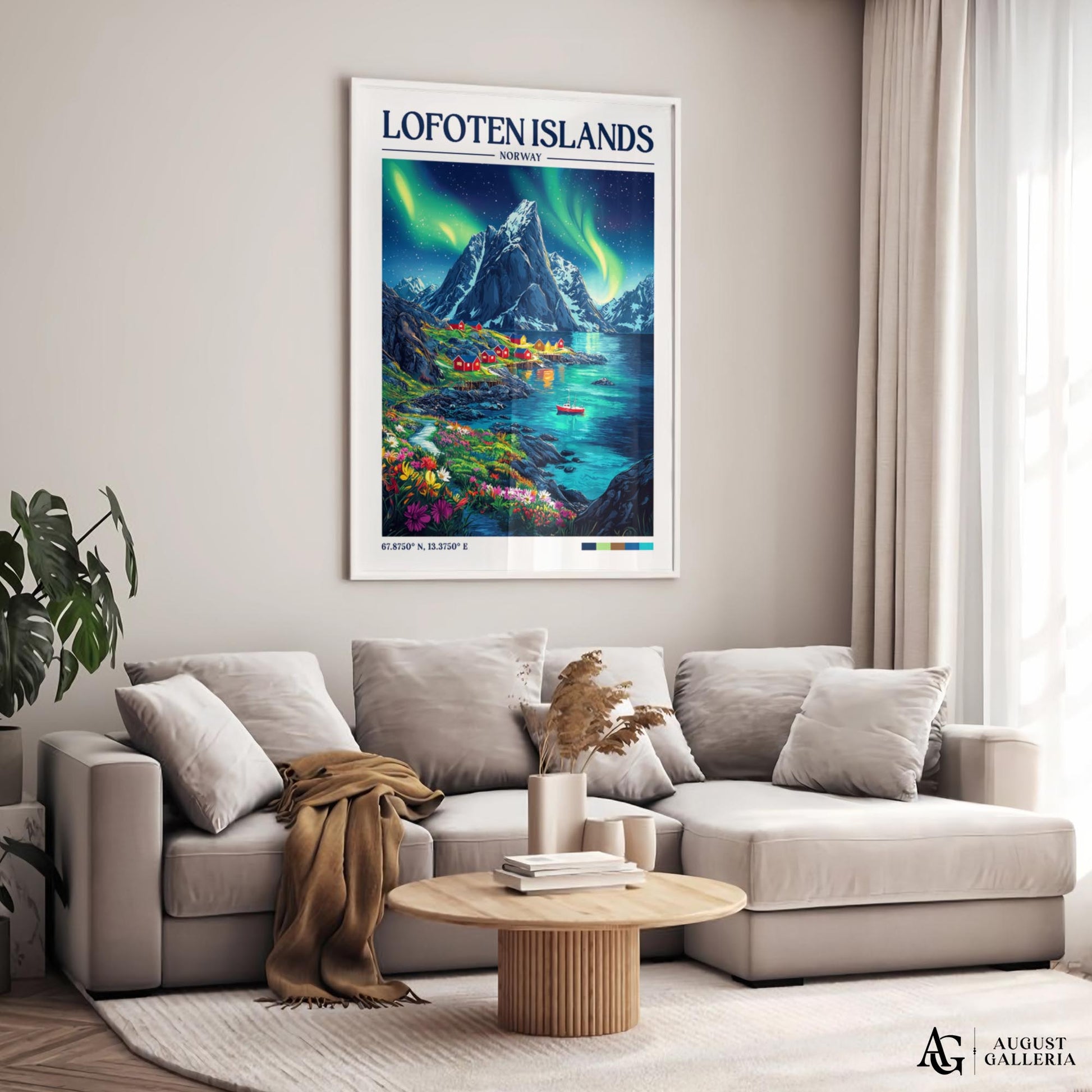 This retro travel illustration captures the dramatic beauty of the Lofoten Islands, where jagged mountain peaks rise sharply above serene fjords and traditional fishing villages dot the coastline. The artwork evokes a sense of adventure and tranquillity, transporting you to northern Norway's remote arctic archipelago. Perfect for those who appreciate wild Nordic landscapes and Scandinavian charm, this print brings a touch of rugged natural wonder to your walls.