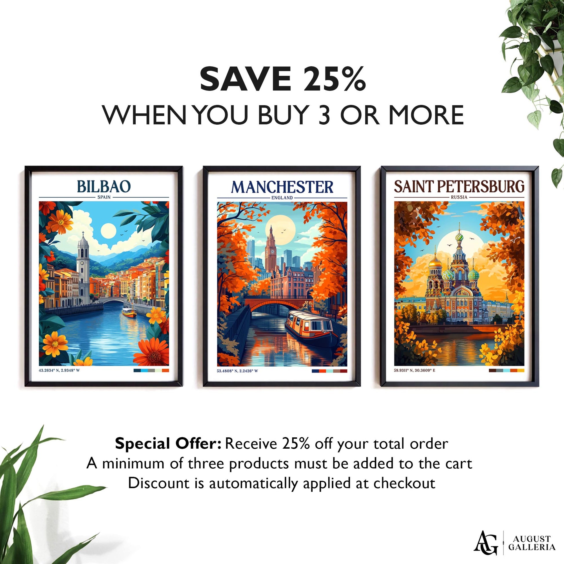 This illustrated travel print brings Manchester’s dynamic urban character to life, highlighting its distinctive blend of heritage and modernity. Running through the composition, a tranquil stretch of canal reflects both the past and present, an homage to Manchester’s industrial roots and ongoing transformation. A perfect piece for admirers of this bold and creative northern powerhouse.