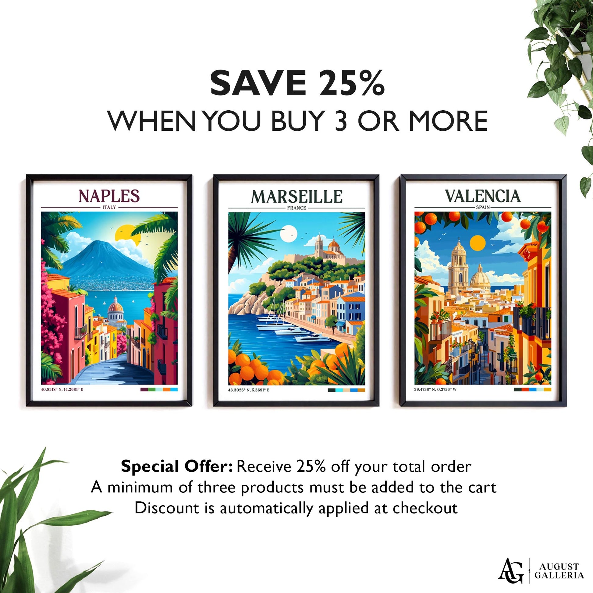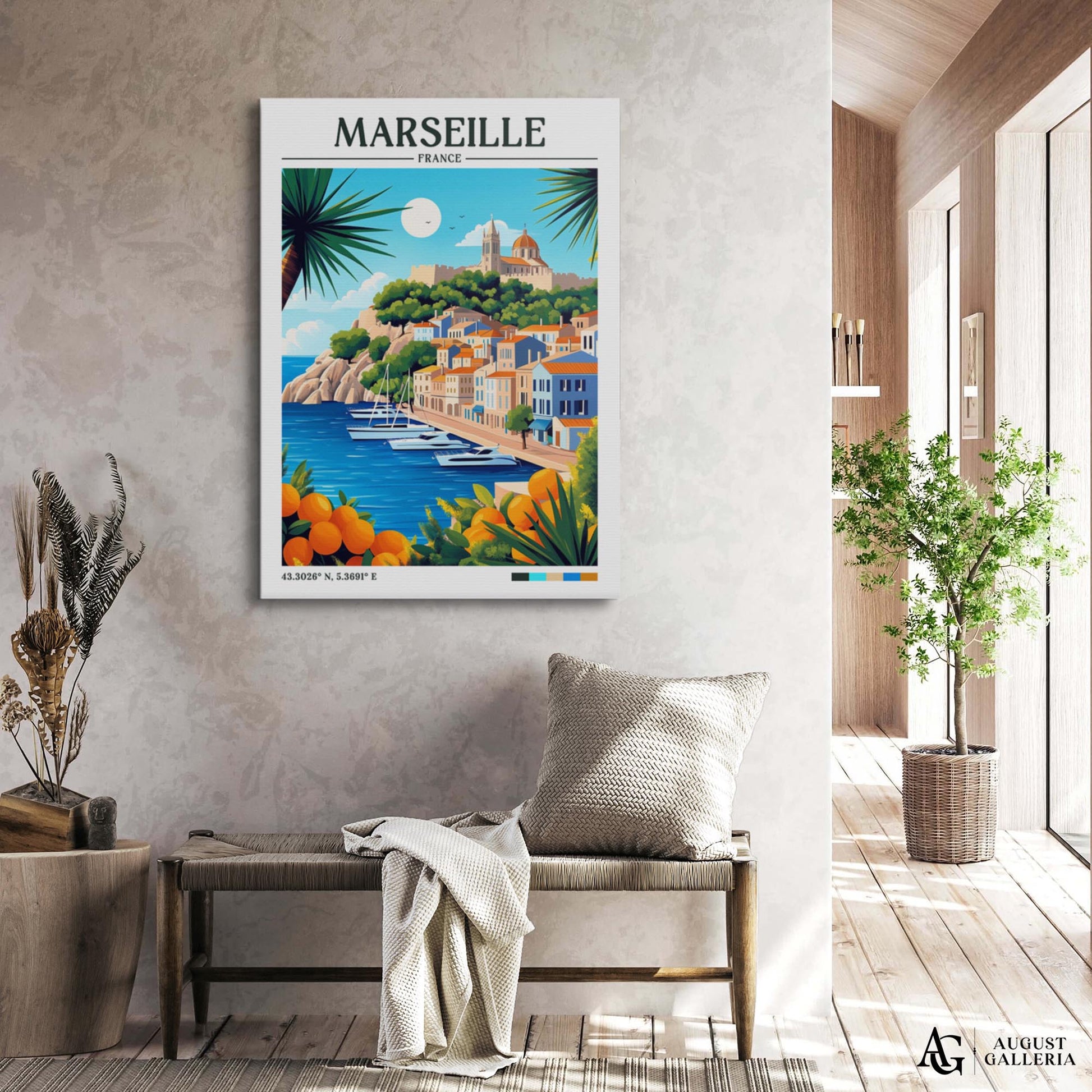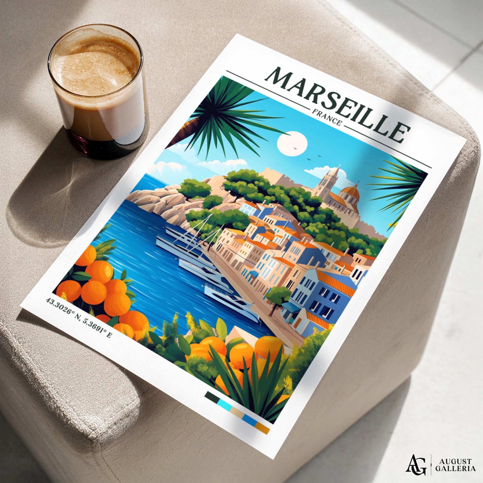 This illustrated travel print showcases the dynamic coastal charm of Marseille, France’s oldest city. With stylised views of its historic port, hillside neighbourhoods, and the striking silhouette of Notre-Dame de la Garde, it captures the lively maritime spirit and cultural richness of this southern hub. Perfect for anyone drawn to harbours, Provençal flair, and the enduring soul of the French Riviera.