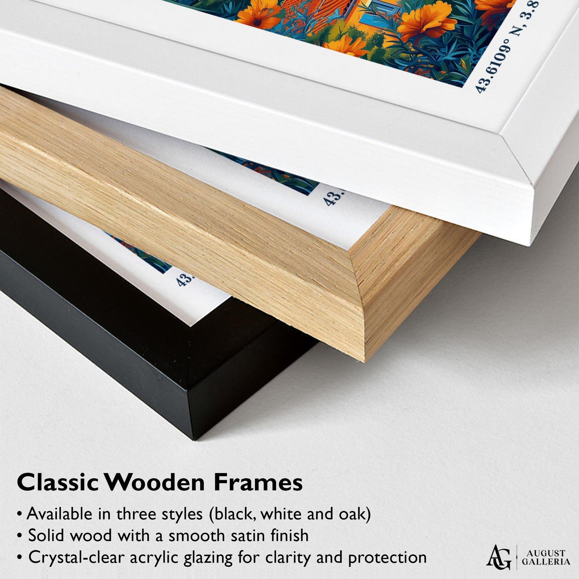 Made from sustainably sourced European wood and delivered ready to hang, available in black, white, or natural oak finishes. Includes a durable crystal-clear, shatter-resistant Perspex glaze for lasting protection and a sleek, modern look.
