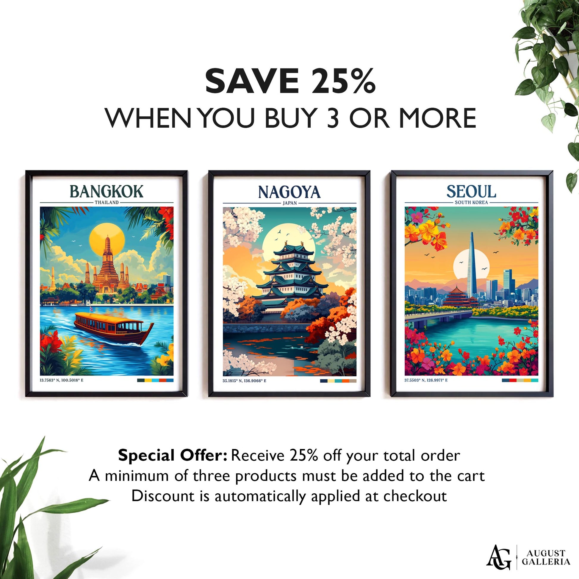 Celebrate your connection to Nagoya with this bold retro travel illustration, featuring clean lines, rich colours, and a timeless vintage style. Designed for those who appreciate the quiet charm and modern spirit of this Japanese city, the artwork captures its essence through a minimalist and nostalgic aesthetic. Whether Nagoya is your home, a favourite destination, or a place that holds meaning for you, this print offers a stylish and thoughtful tribute to its unique character.