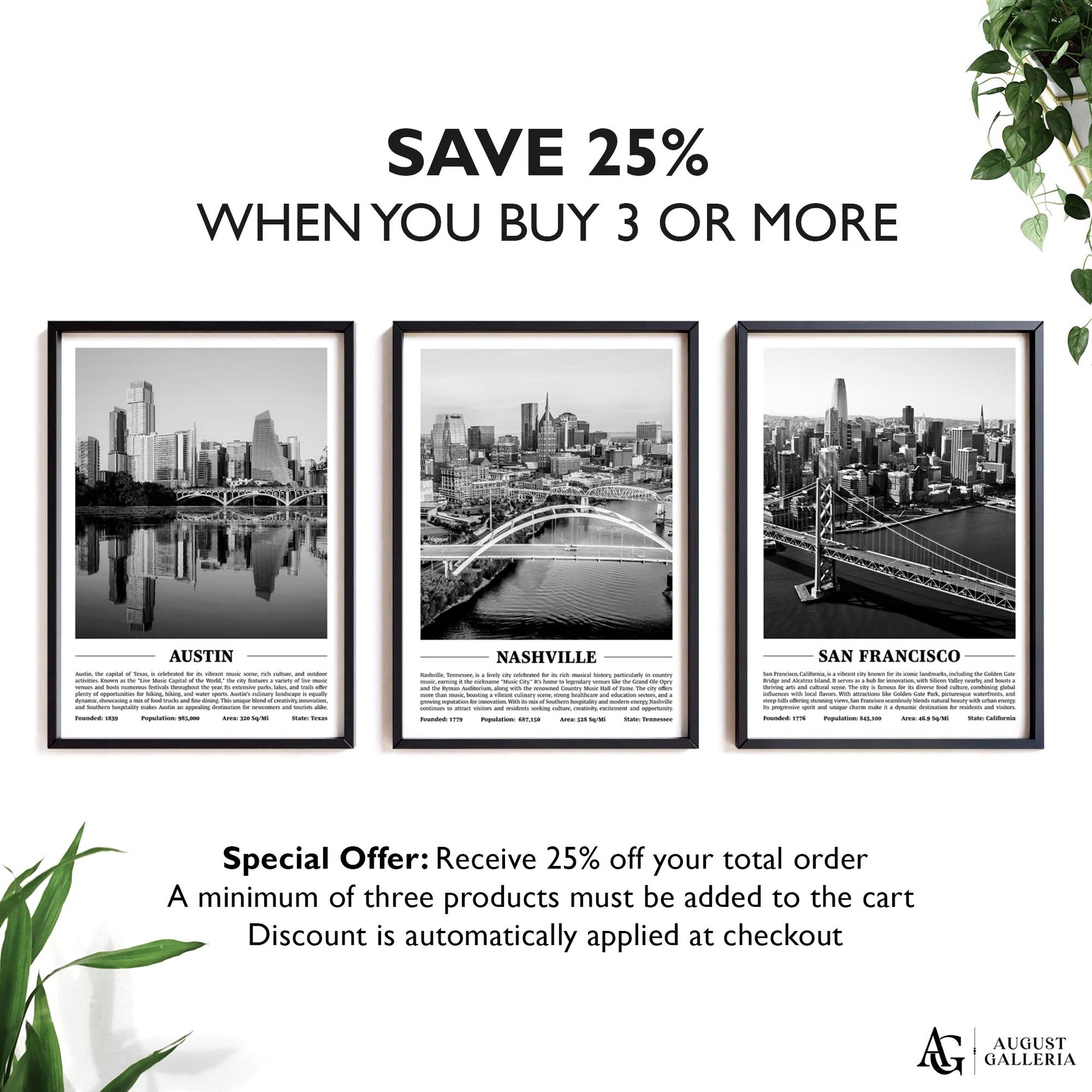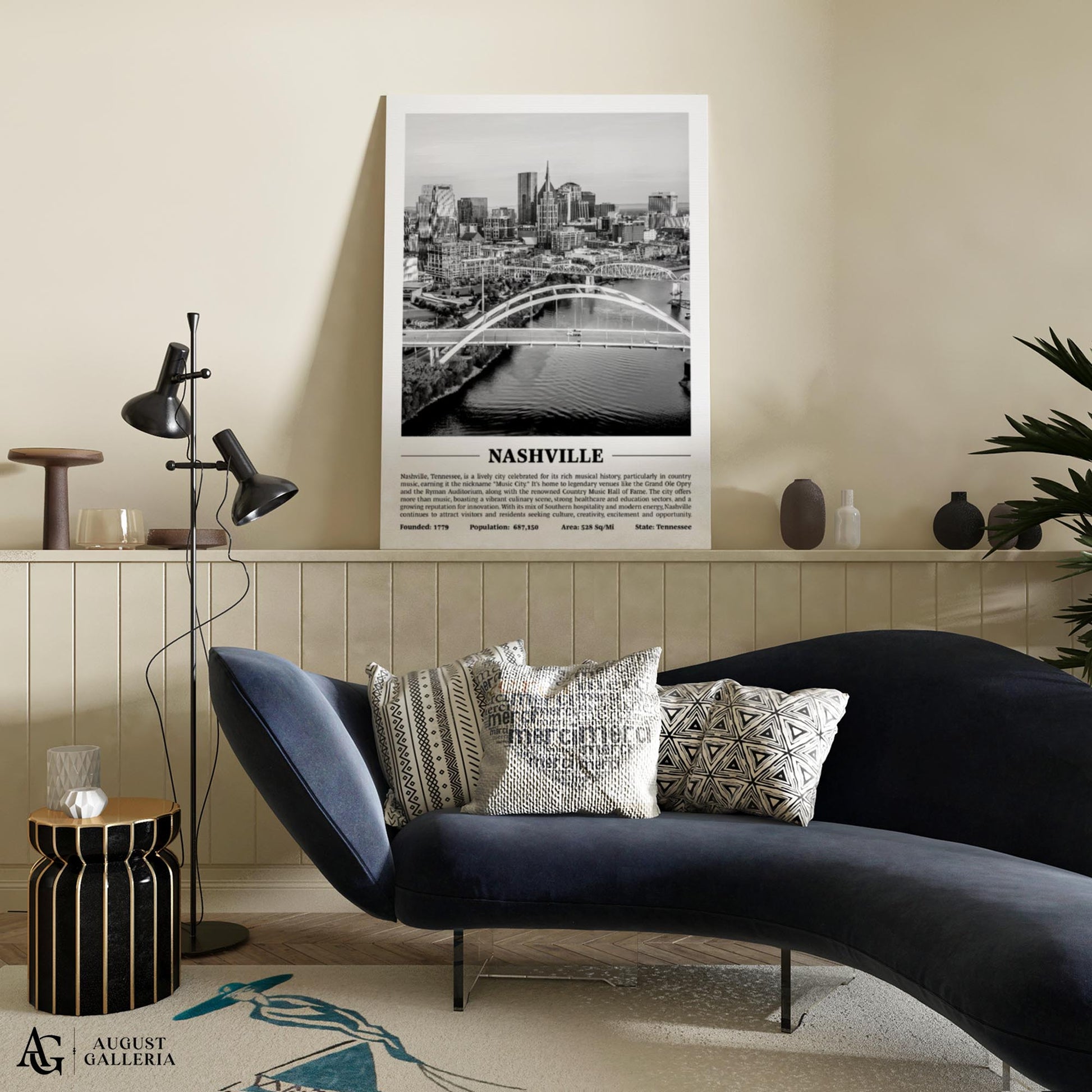 A black and white print of Nashville providing a glimpse into the city's history and significance. Perfect for modern interiors, this piece exudes sophistication and offers a window into the city's soul.