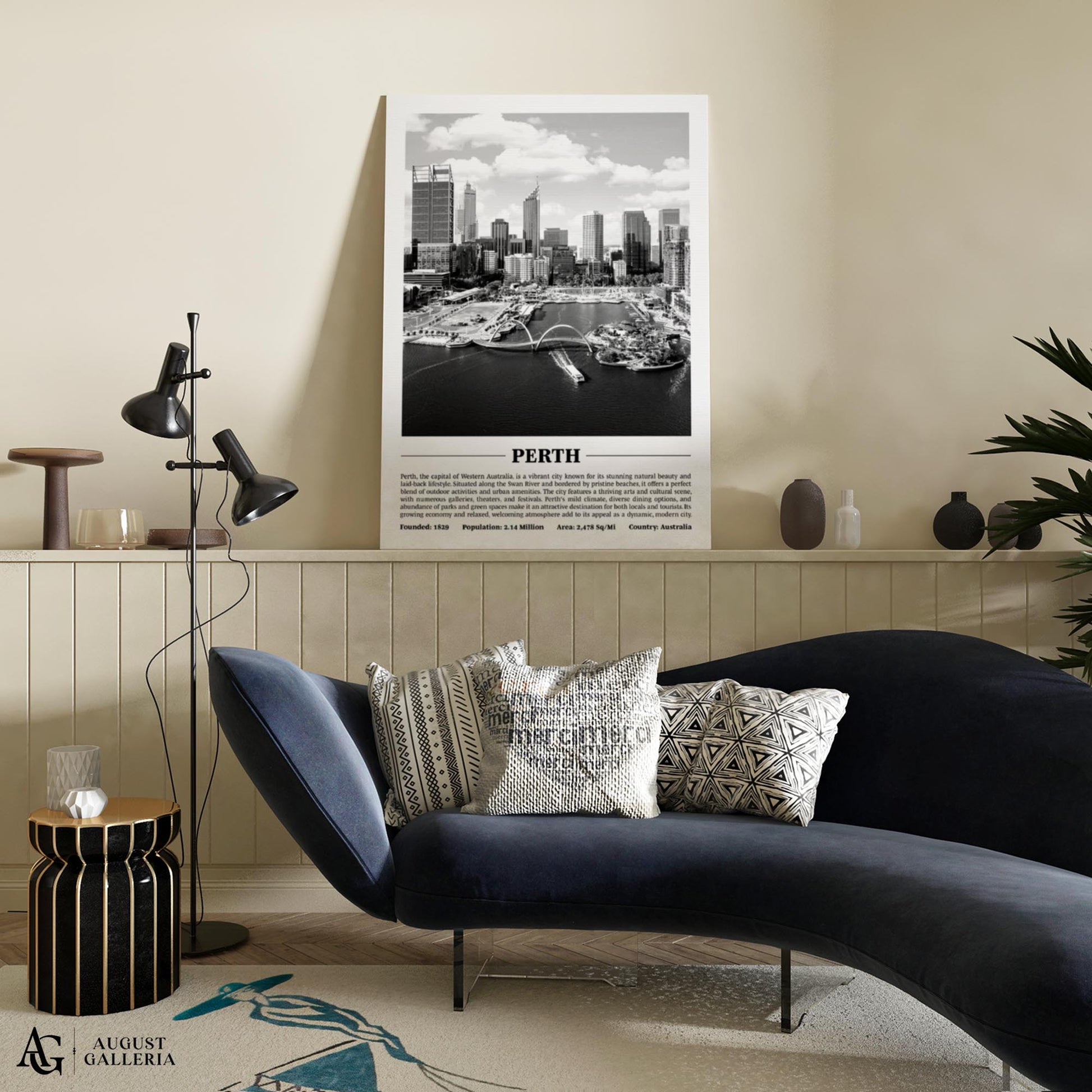 A black and white print of Perth providing a glimpse into the city's history and significance. Perfect for modern interiors, this piece exudes sophistication and offers a window into the city's soul.
