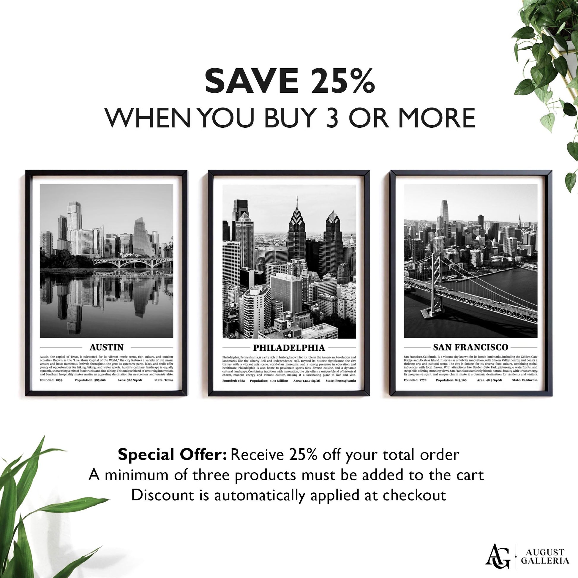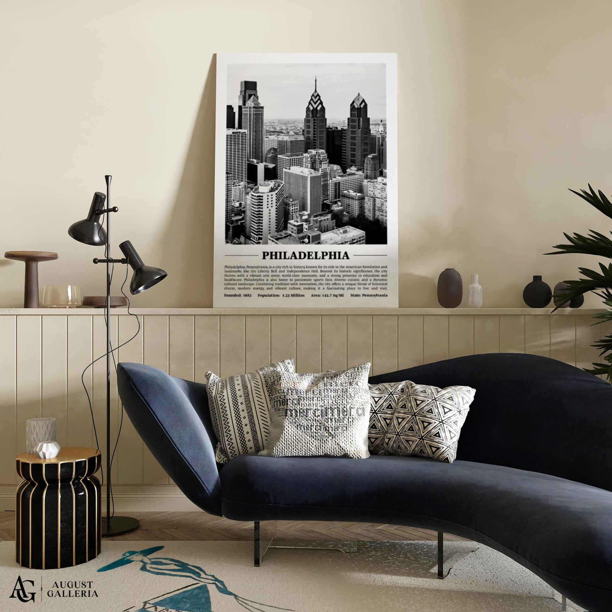 A black and white print of Philadelphia providing a glimpse into the city's history and significance. Perfect for modern interiors, this piece exudes sophistication and offers a window into the city's soul.