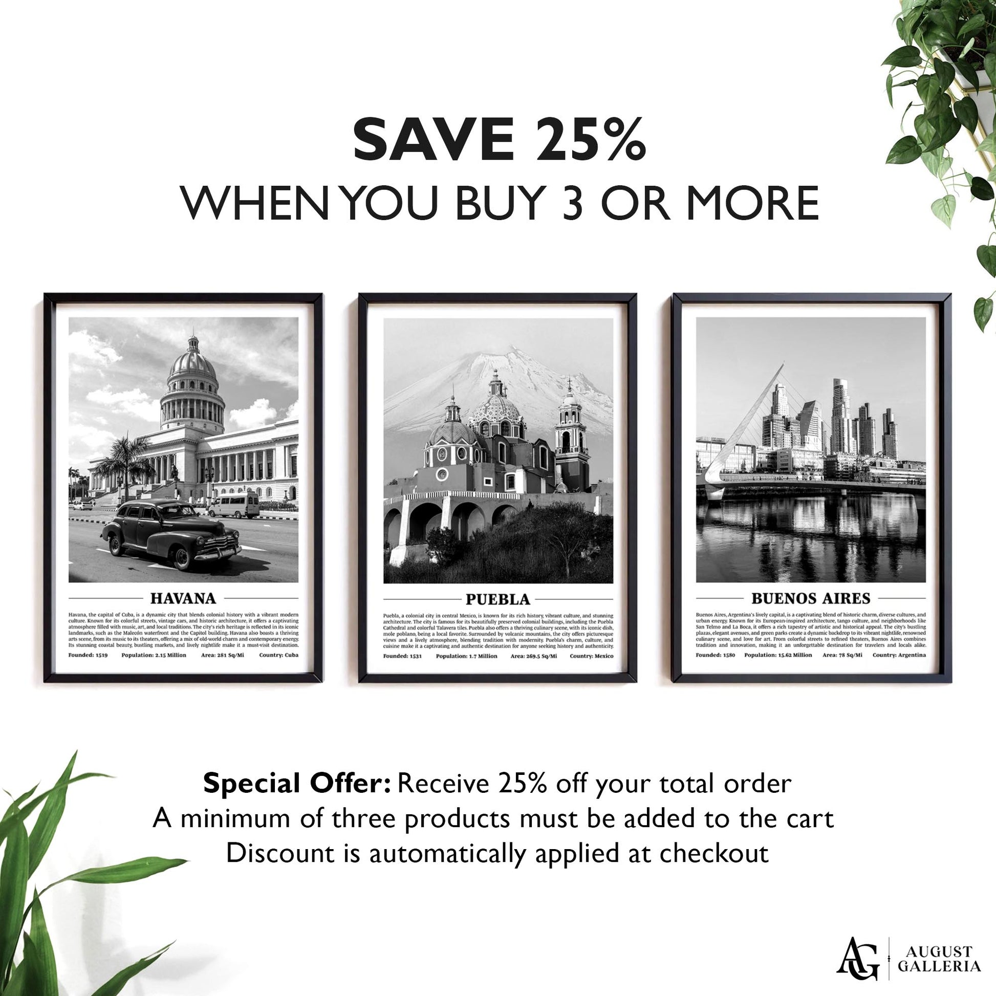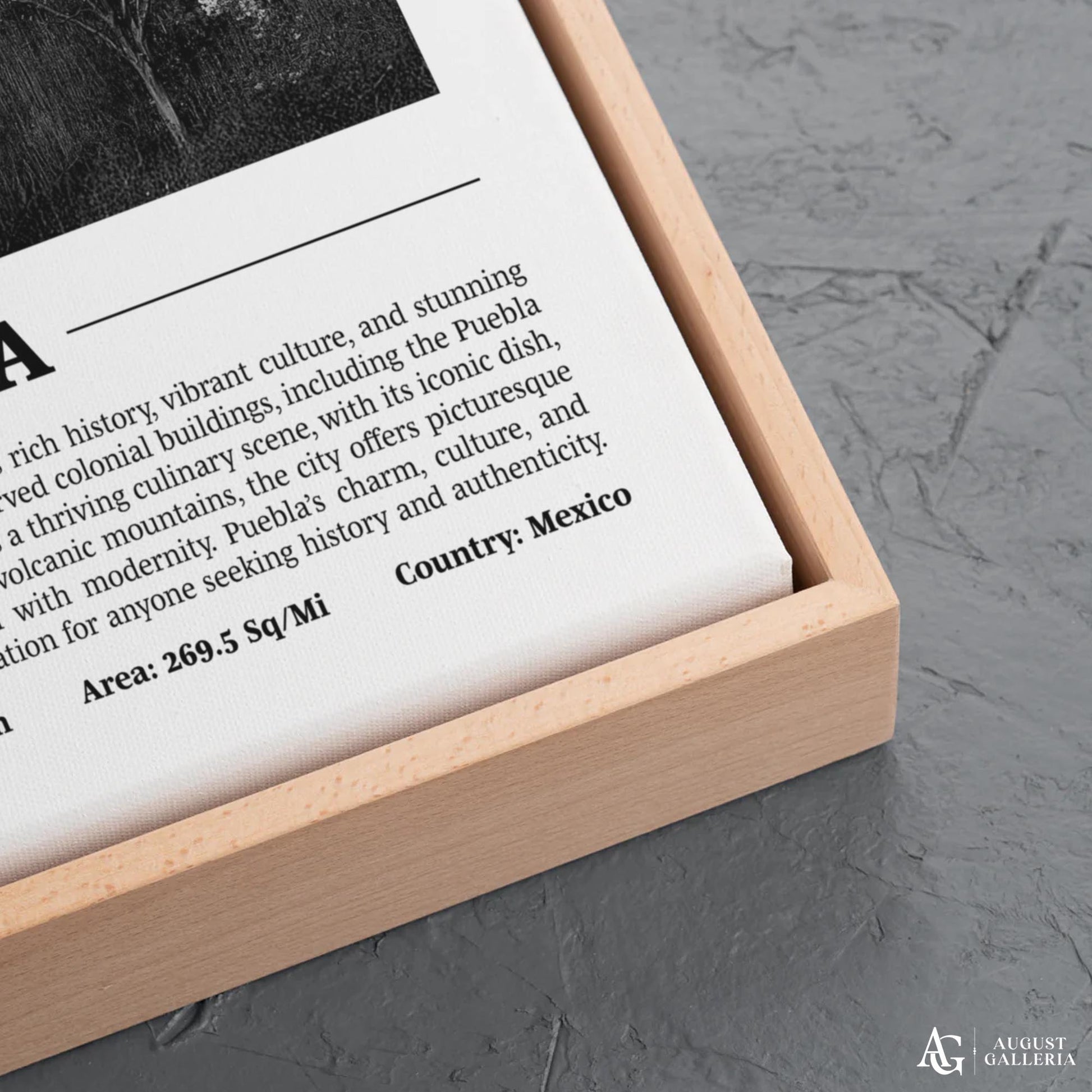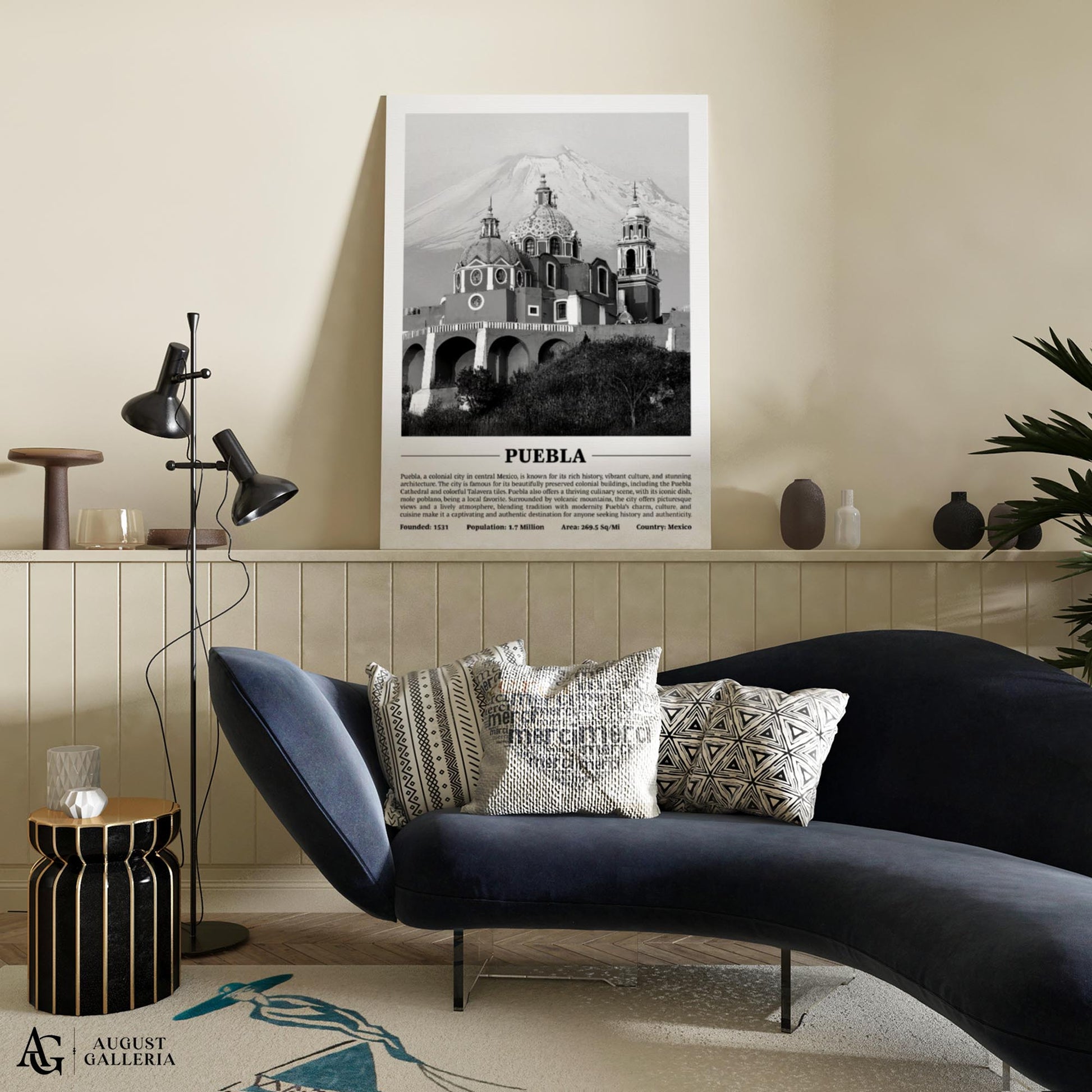 A black and white print of Puebla providing a glimpse into the city's history and significance. Perfect for modern interiors, this piece exudes sophistication and offers a window into the city's soul.
