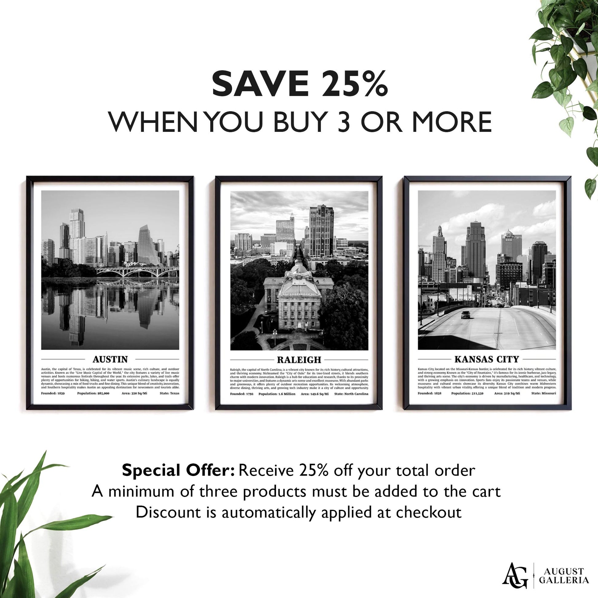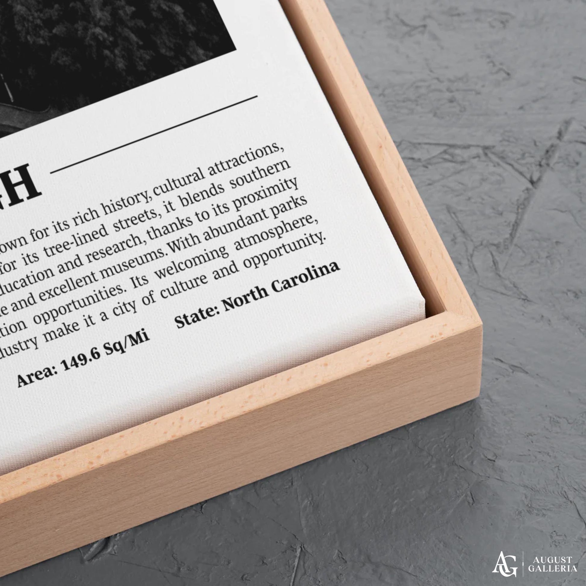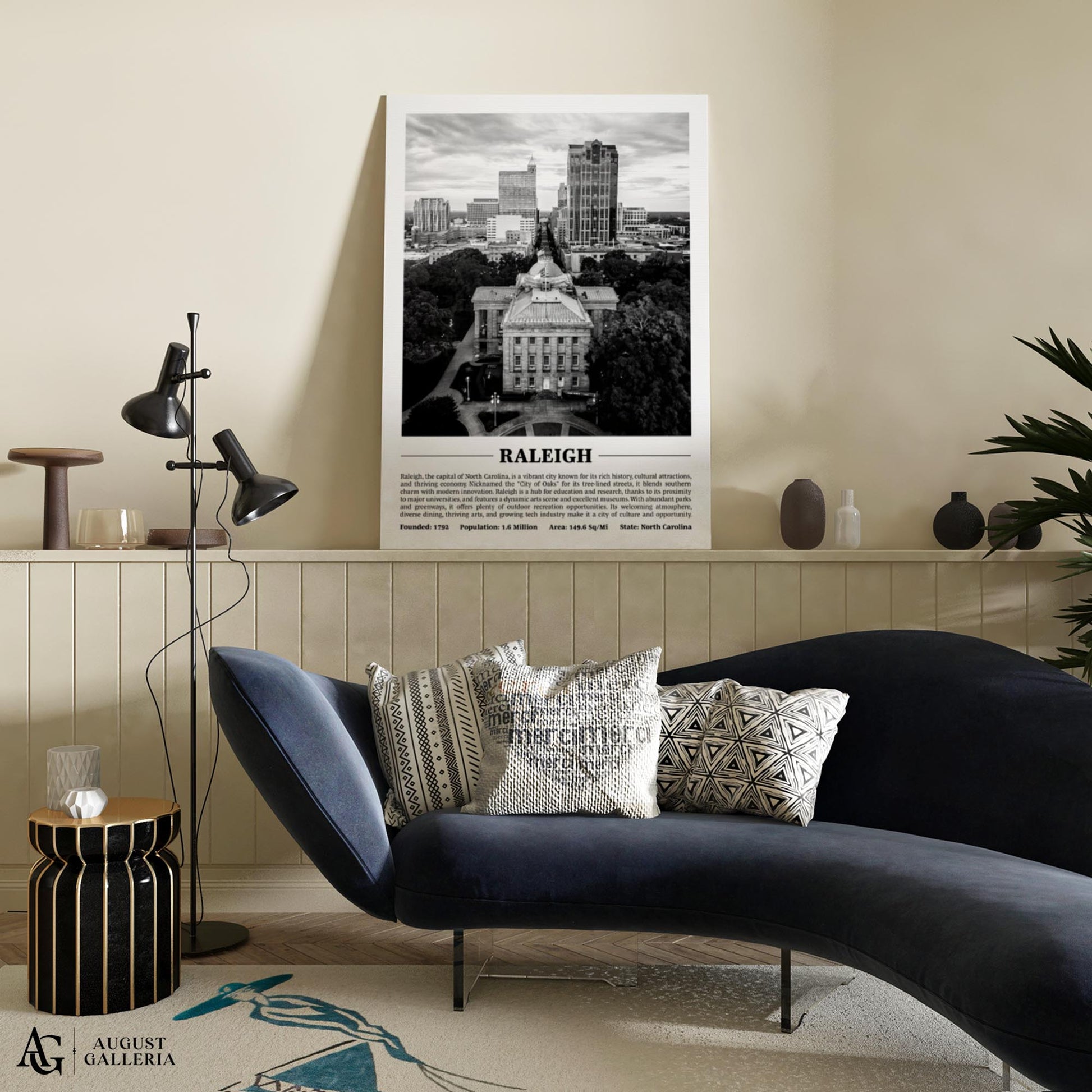 A black and white print of Raleigh providing a glimpse into the city's history and significance. Perfect for modern interiors, this piece exudes sophistication and offers a window into the city's soul.