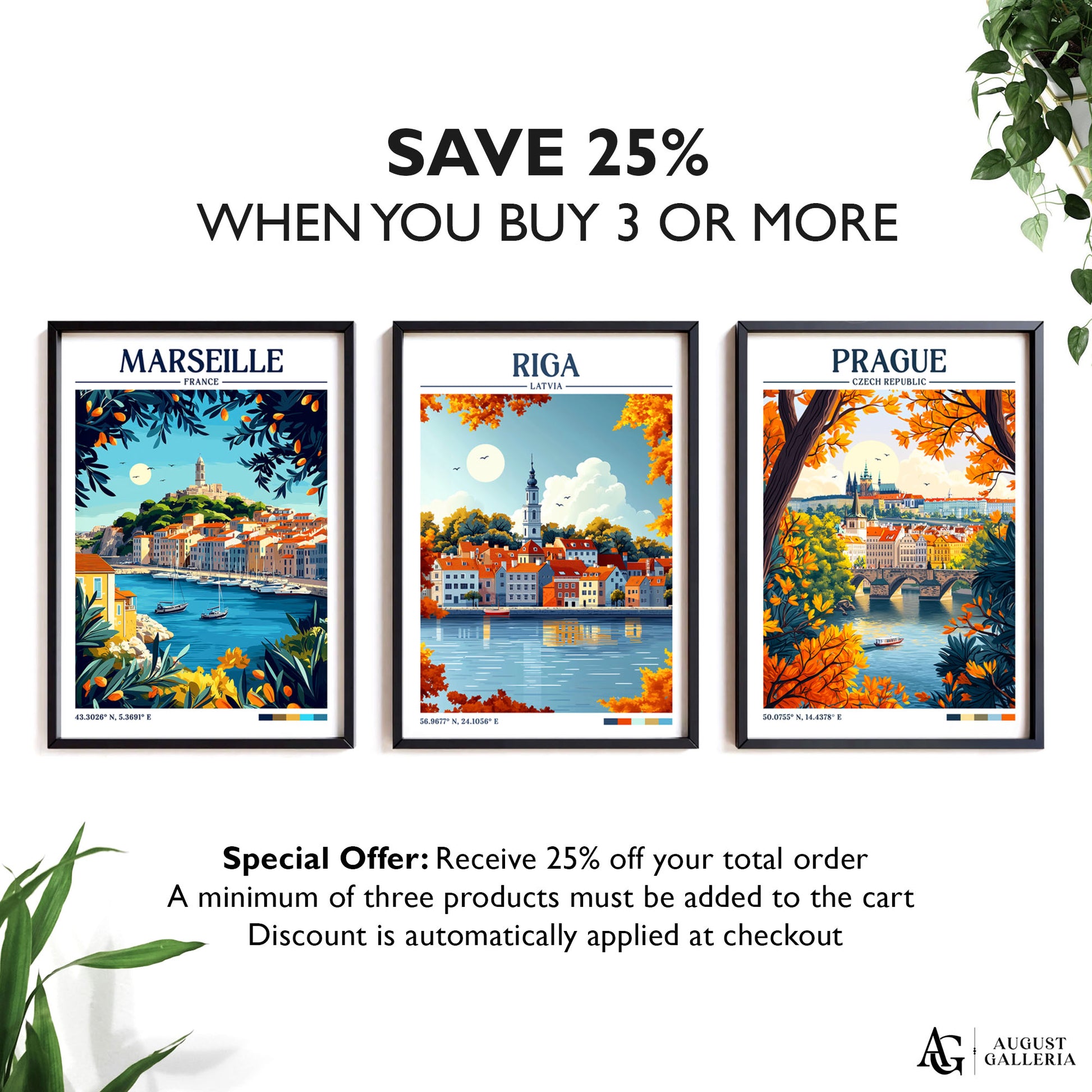 Bring the elegant charm of Riga into your space with this retro travel illustration, inspired by the city’s beautiful Art Nouveau architecture, cobbled streets, and riverside setting. Known for its rich history, vibrant cultural scene, and timeless old town, Riga is a gem of the Baltics that blends tradition with a lively modern spirit. Whether it’s your hometown, a memorable destination, or simply a city that sparks your imagination, this print is a nostalgic tribute to the unique character and enduring appeal of Riga, Latvia.