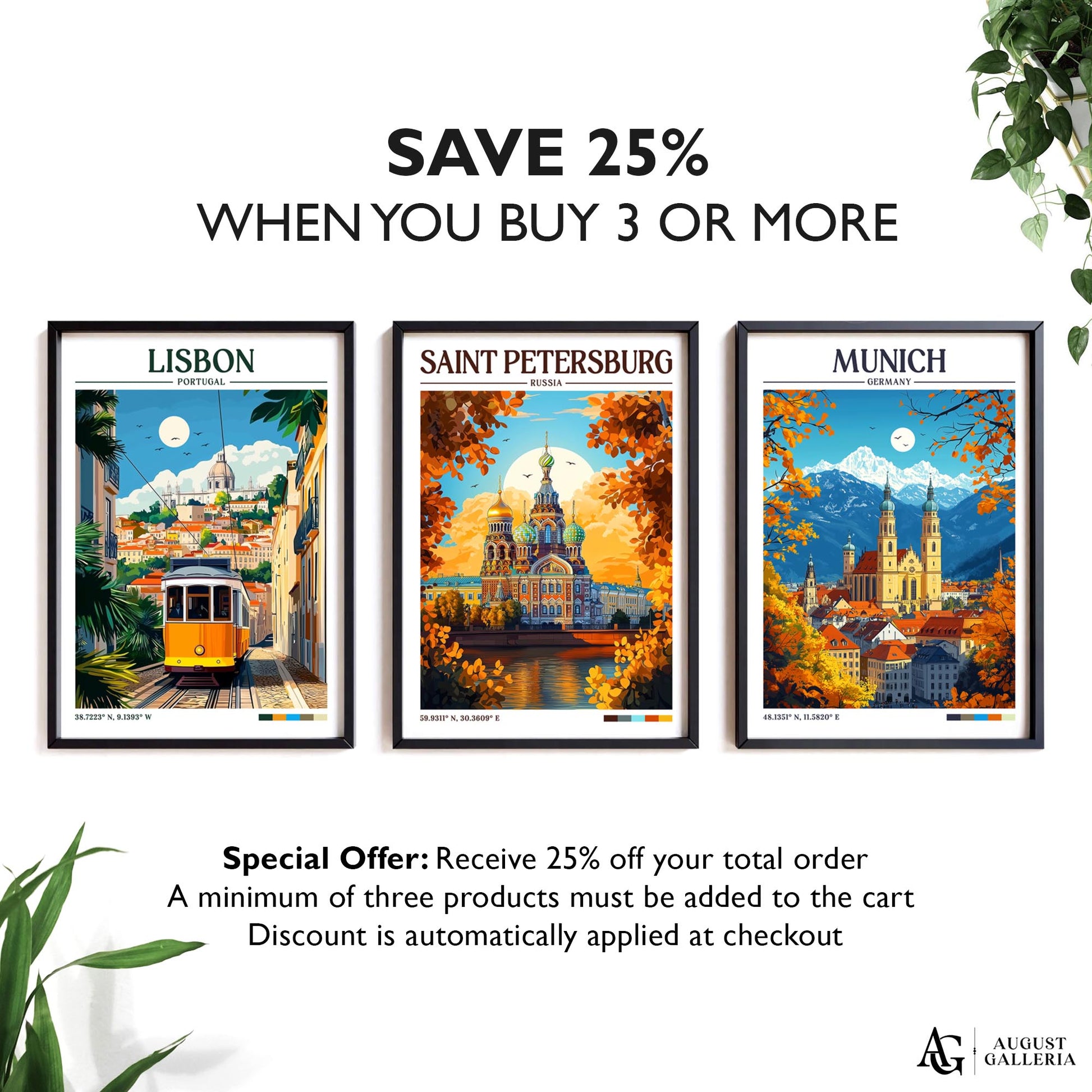 Step into the grandeur of Saint Petersburg, Russia’s imperial jewel on the Neva River. This retro-inspired artwork captures the city’s elegant canals, golden-domed churches, and ornate Baroque architecture. With a nod to landmarks like the Church of the Savior on Spilled Blood and the Winter Palace, the scene reflects the opulence and rich cultural legacy of this historic city. A celebration of old-world charm and artistic heritage, perfect for lovers of architecture, history, and timeless European beauty.