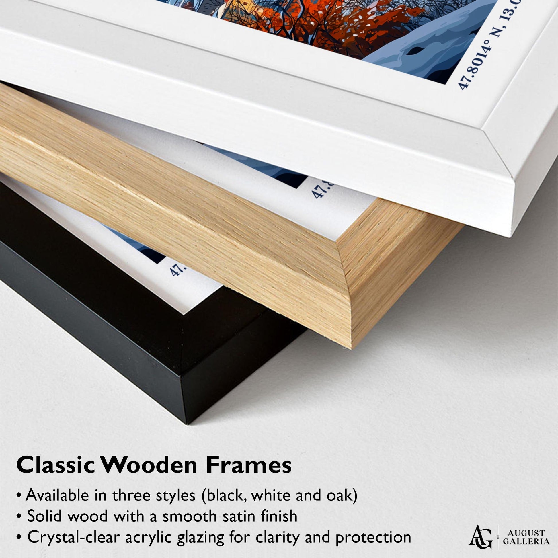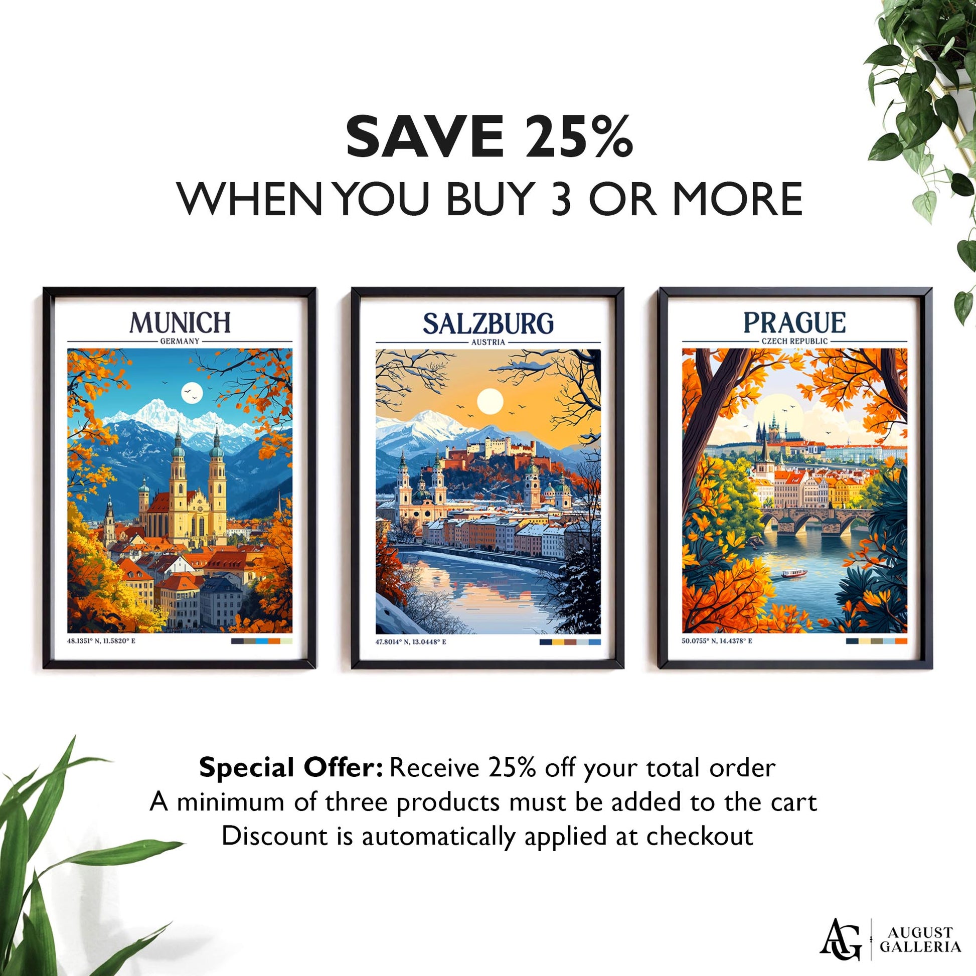 Celebrate the timeless beauty of Salzburg with this elegant retro travel print. Nestled among snow-capped peaks and the winding Salzach River, the city’s baroque skyline is crowned by the impressive Hohensalzburg Fortress. Pastel façades, ornate church towers, and charming narrow streets create an atmosphere steeped in music, history, and romance. From its role as Mozart’s birthplace to its enchanting old town squares, this artwork captures Salzburg’s unique blend of alpine grandeur and cultural refinement, making it a perfect keepsake for lovers of Austria’s charm and elegance.