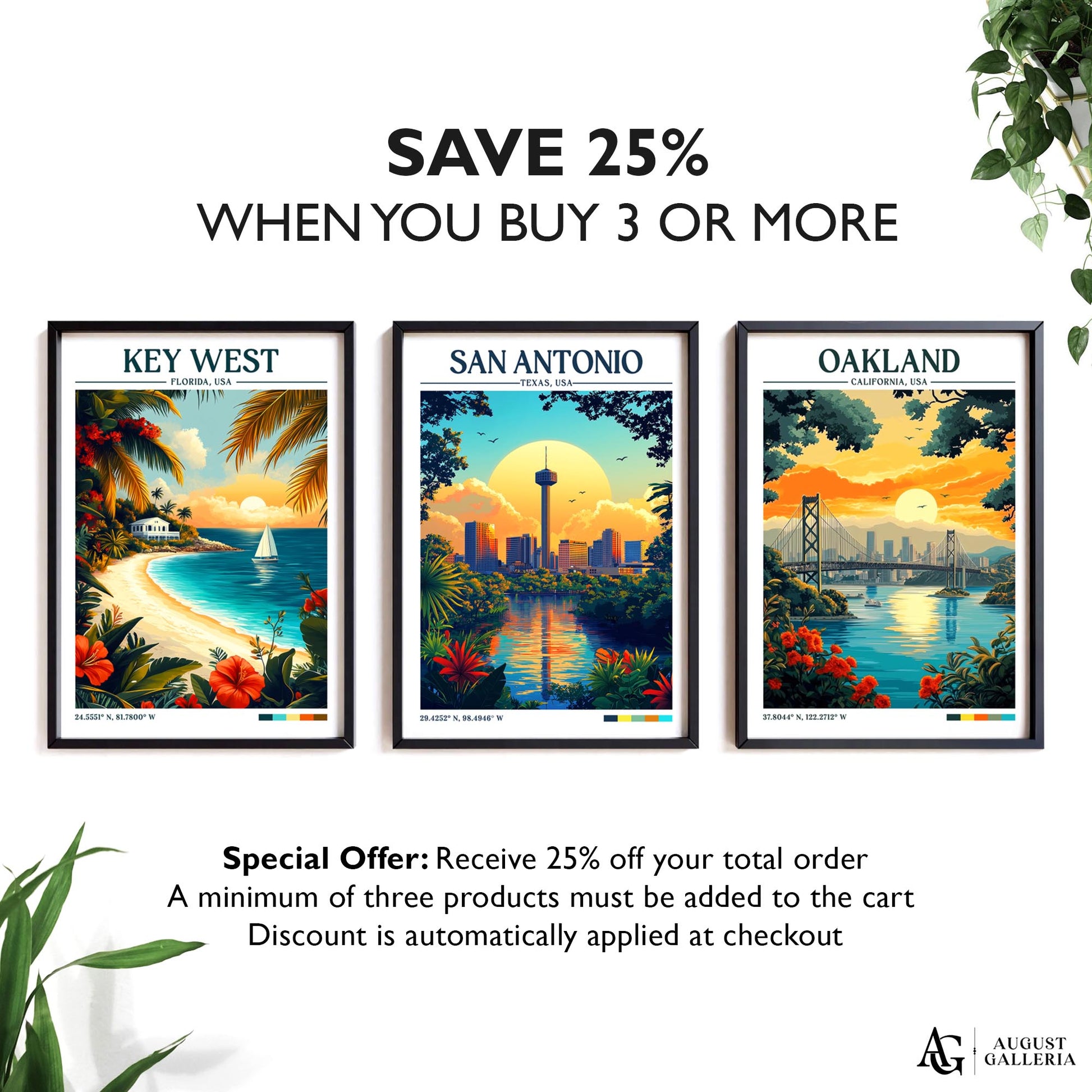Celebrate the skyline of San Antonio with this retro travel print centred on the striking Tower of the Americas. Rising elegantly above the city, its sleek design and panoramic observation deck symbolise modern San Antonio while nodding to its 1968 World’s Fair heritage. Set against a warm, sunlit sky with stylised city details below, this artwork captures the tower’s commanding presence and the vibrant spirit of Texas in timeless vintage style.
