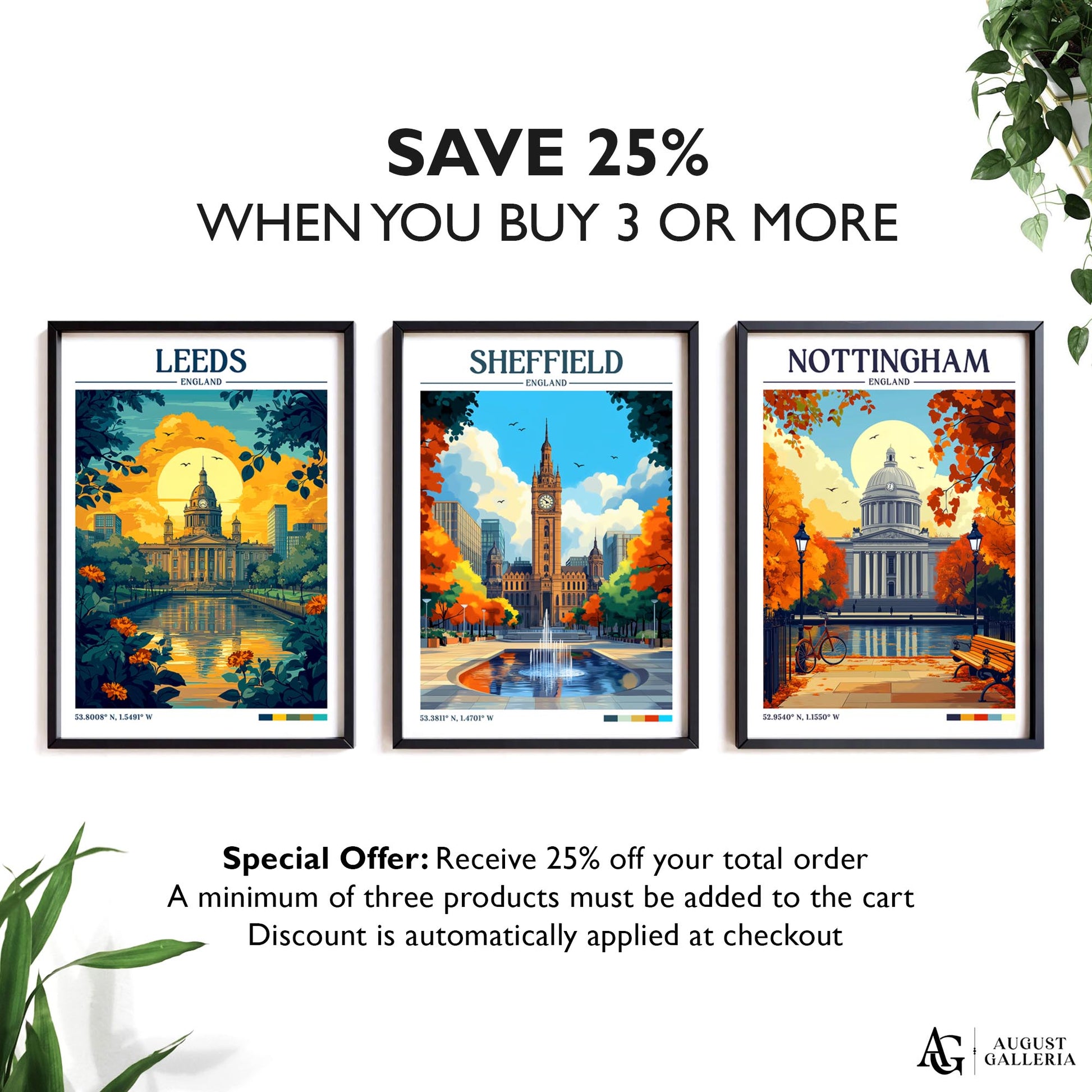 Celebrate the historic charm of Sheffield with this retro travel illustration, centred on the iconic Town Hall. Its striking Gothic Revival architecture, complete with tall clock tower and intricate detailing, rises prominently against the city skyline. Surrounded by lush green spaces and framed by distant hills, the scene captures the grandeur, civic pride, and timeless character of Sheffield, making it a perfect tribute for admirers of the city’s architectural heritage.