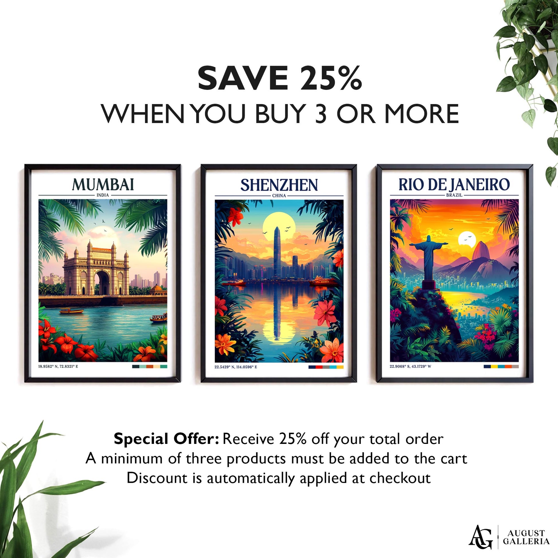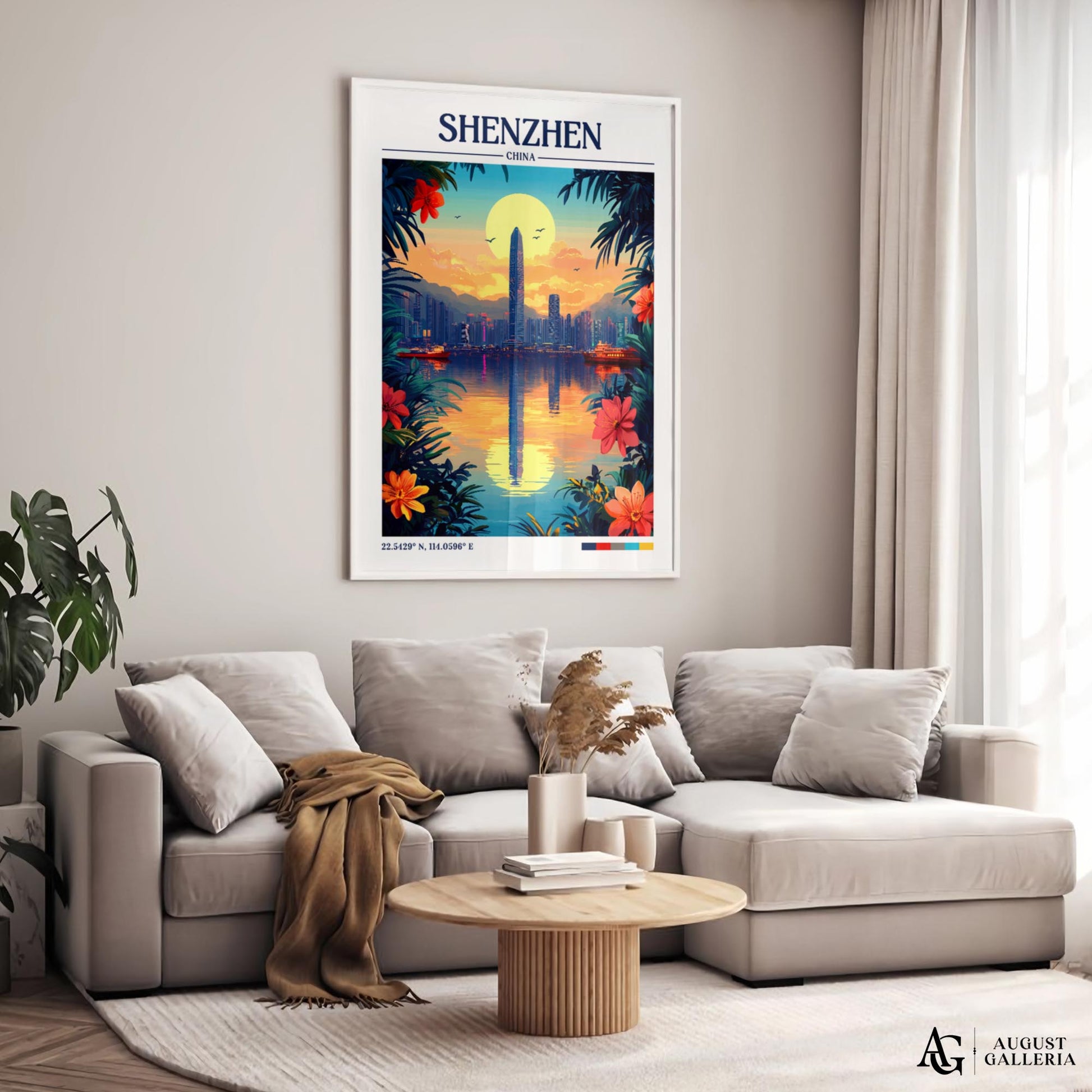 Celebrate the modern energy of Shenzhen with this retro travel illustration, showcasing the city’s futuristic skyline and iconic skyscrapers set against a soft sky. Known as a hub of innovation and design, Shenzhen blends cutting-edge architecture with bustling urban life. This print captures the city’s dynamic spirit, contemporary charm, and forward-looking character, making it a perfect keepsake for admirers of one of China’s most vibrant metropolitan centres.