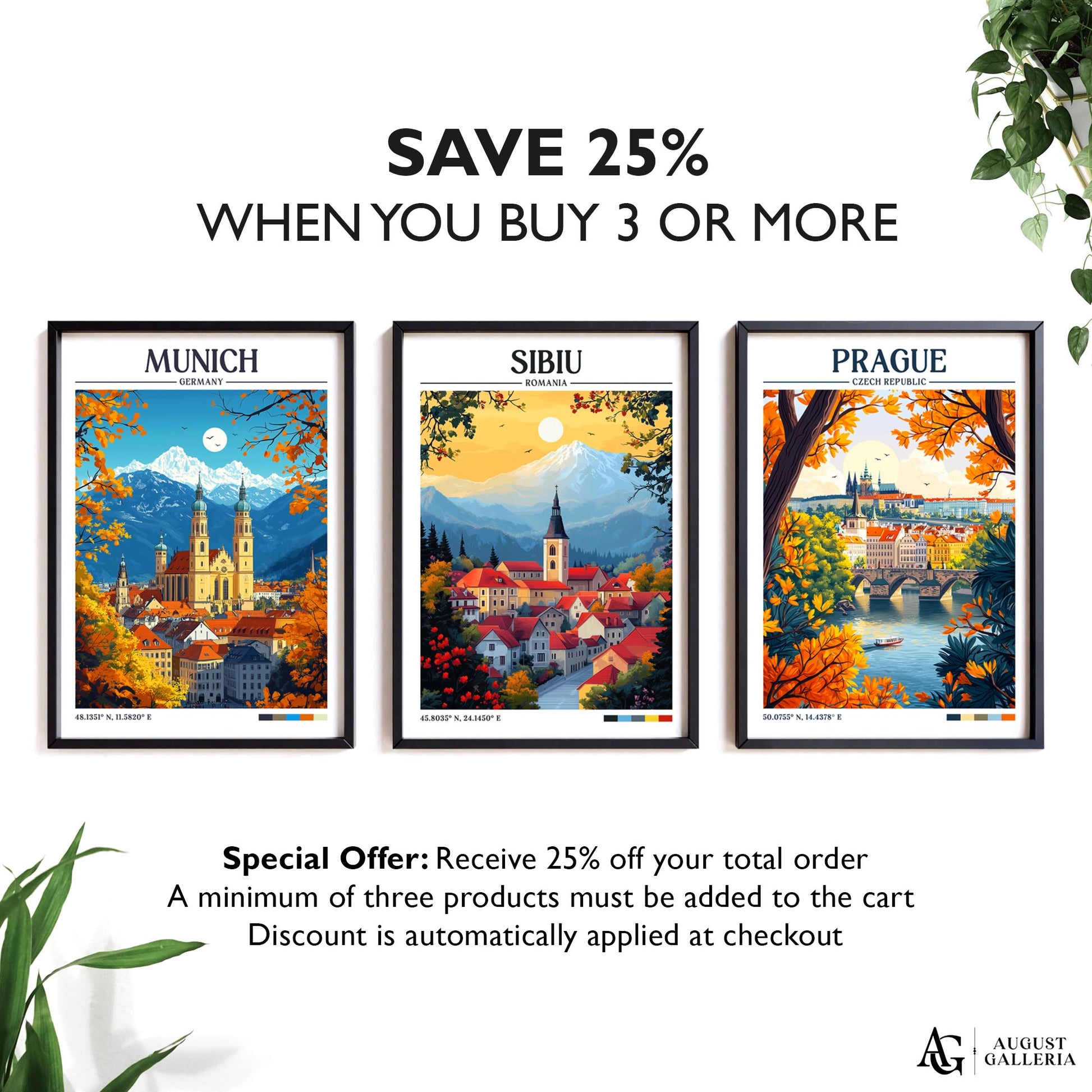 Step into the historic charm of Sibiu with this retro travel illustration, inspired by its colourful medieval squares, cobbled streets, and charming rooftops. Framed by distant hills and under a bright, clear sky, the city’s blend of Gothic, Baroque, and Renaissance architecture is brought to life in timeless style. This print celebrates the cultural richness, picturesque beauty, and enduring character of Sibiu, making it a perfect keepsake for lovers of Romania’s historic cities.