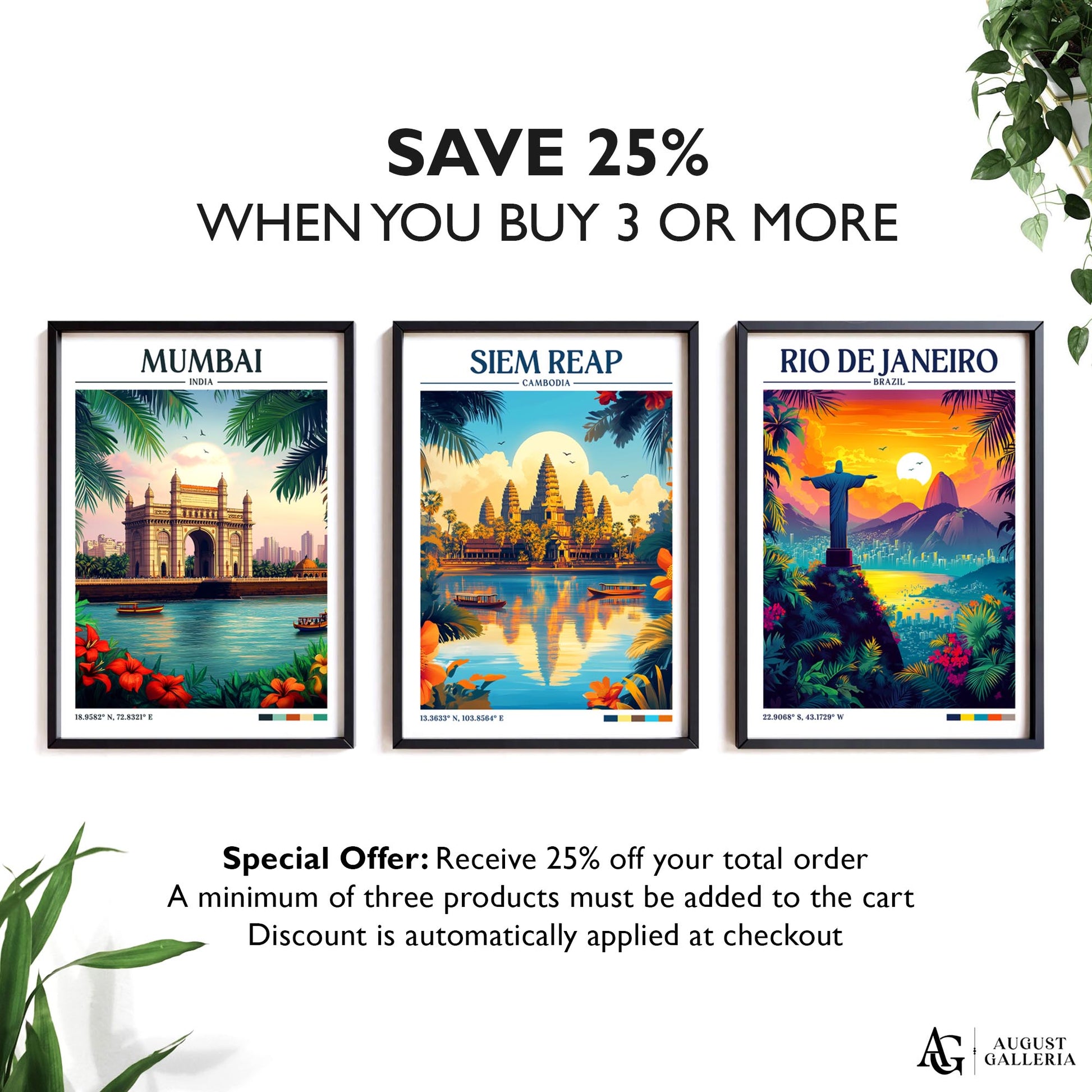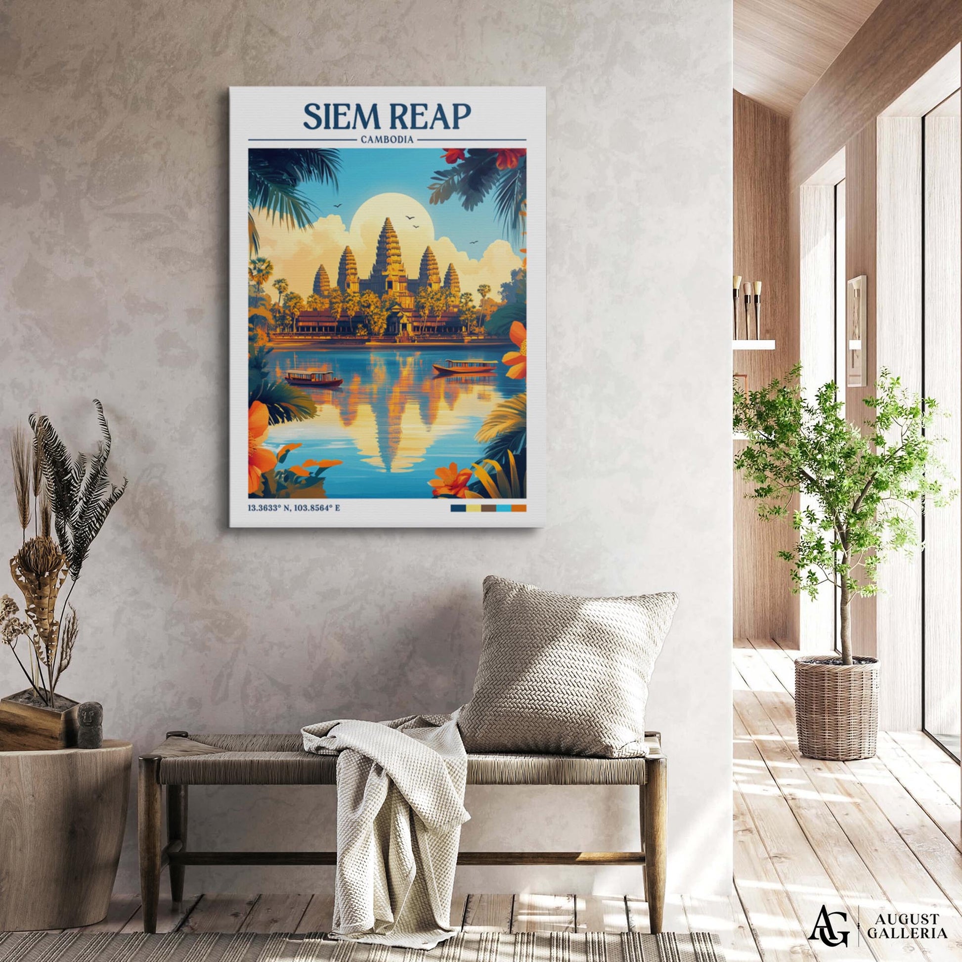 Step into the historic allure of Siem Reap with this retro travel illustration, centred on the iconic Angkor temple ruins rising against a bright sky. Intricate stone carvings, towering spires, and surrounding tropical foliage evoke the timeless beauty and spiritual heritage of the region. This artwork captures the mystique, grandeur, and cultural richness of Siem Reap, making it a perfect keepsake for lovers of Cambodia’s ancient wonders.