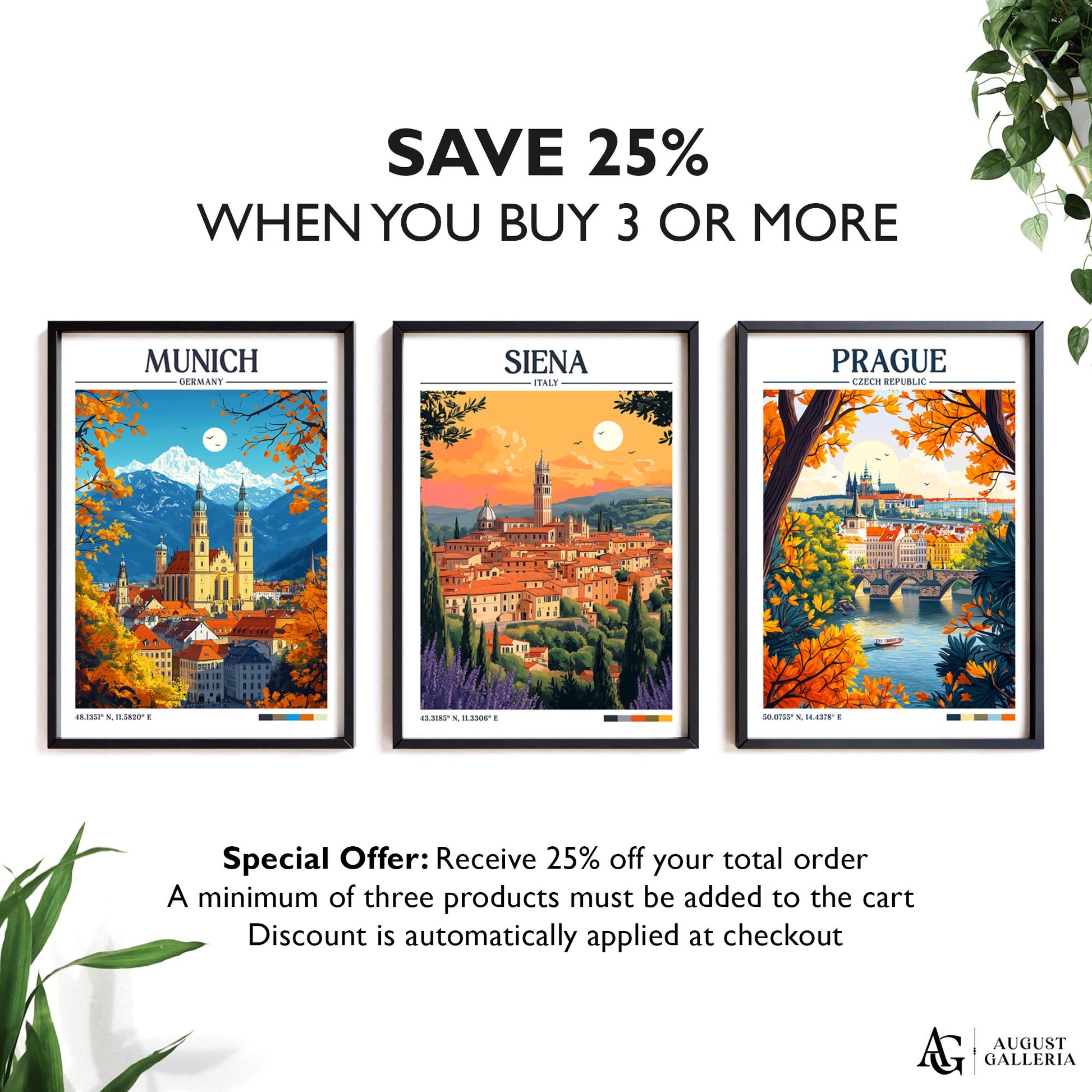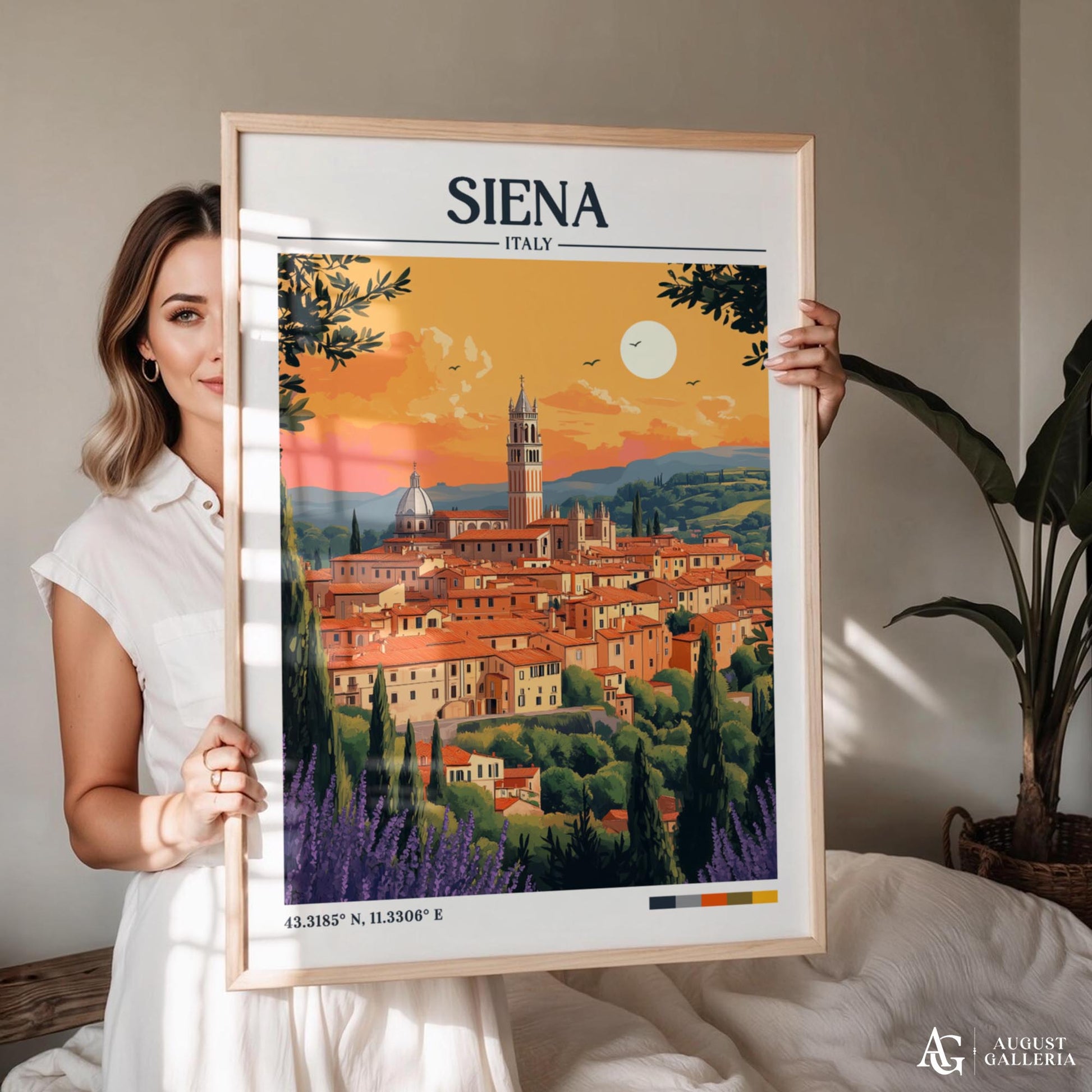 Step into the medieval charm of Siena with this retro travel illustration, featuring its famous Piazza del Campo and the soaring Torre del Mangia. Red-tiled rooftops, historic palaces, and narrow winding streets stretch across the cityscape, bathed in warm sunlight under a clear sky. This print captures the timeless beauty, cultural richness, and romantic allure of Siena, making it a perfect tribute for lovers of Tuscany and its historic treasures.