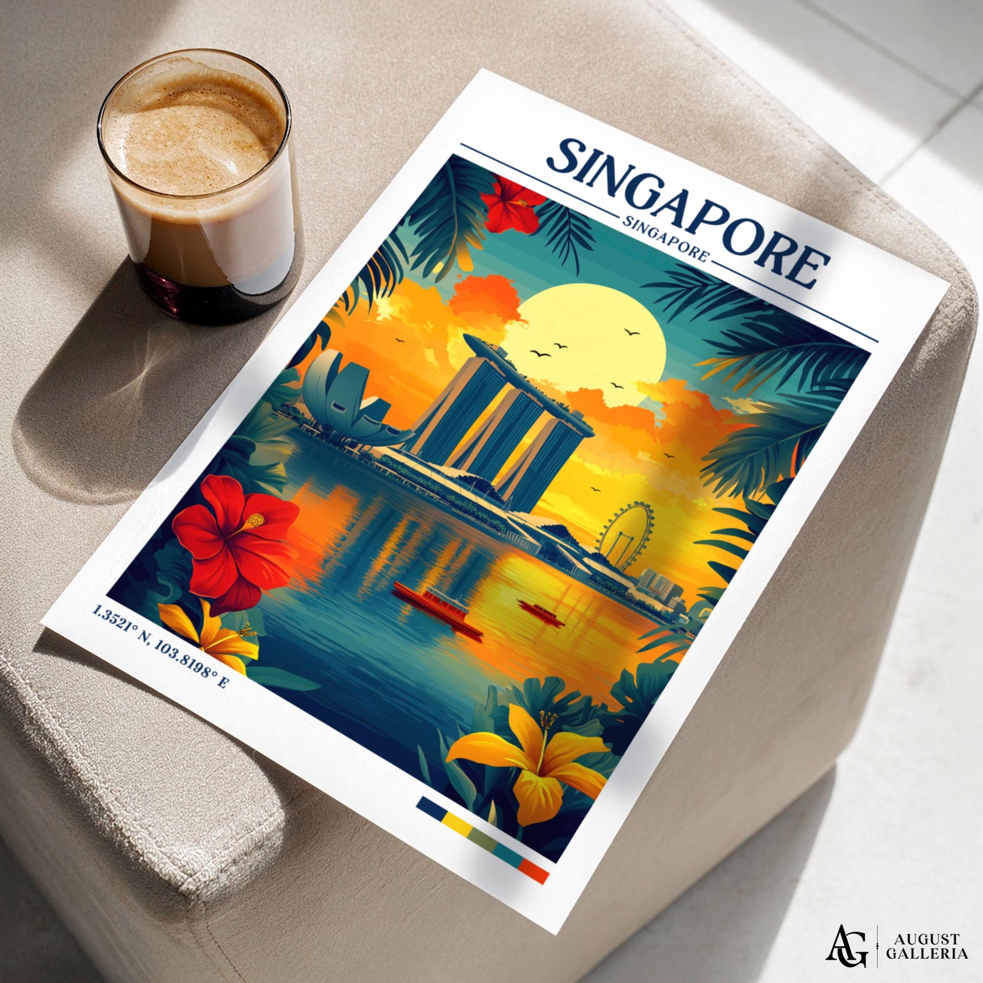 Celebrate the modern vibrancy of Singapore with this retro travel illustration, featuring its striking skyline of sleek skyscrapers and iconic city landmarks. Framed by tropical greenery and the shimmering waters of Marina Bay, the scene captures the city’s dynamic energy, cultural richness, and forward-looking spirit. This print is a timeless tribute to Singapore’s unique blend of urban sophistication and tropical charm, perfect for admirers of one of Asia’s most fascinating cities.