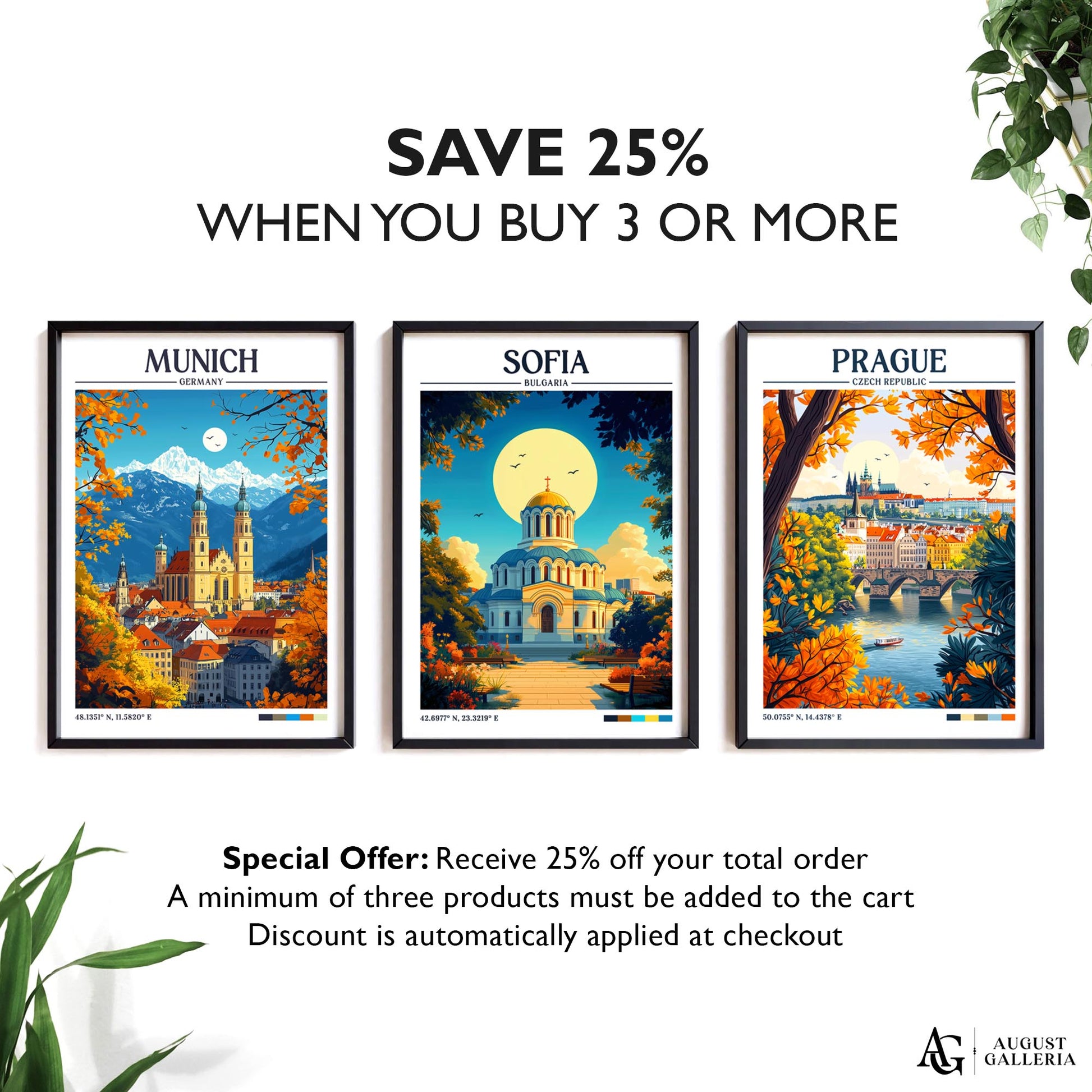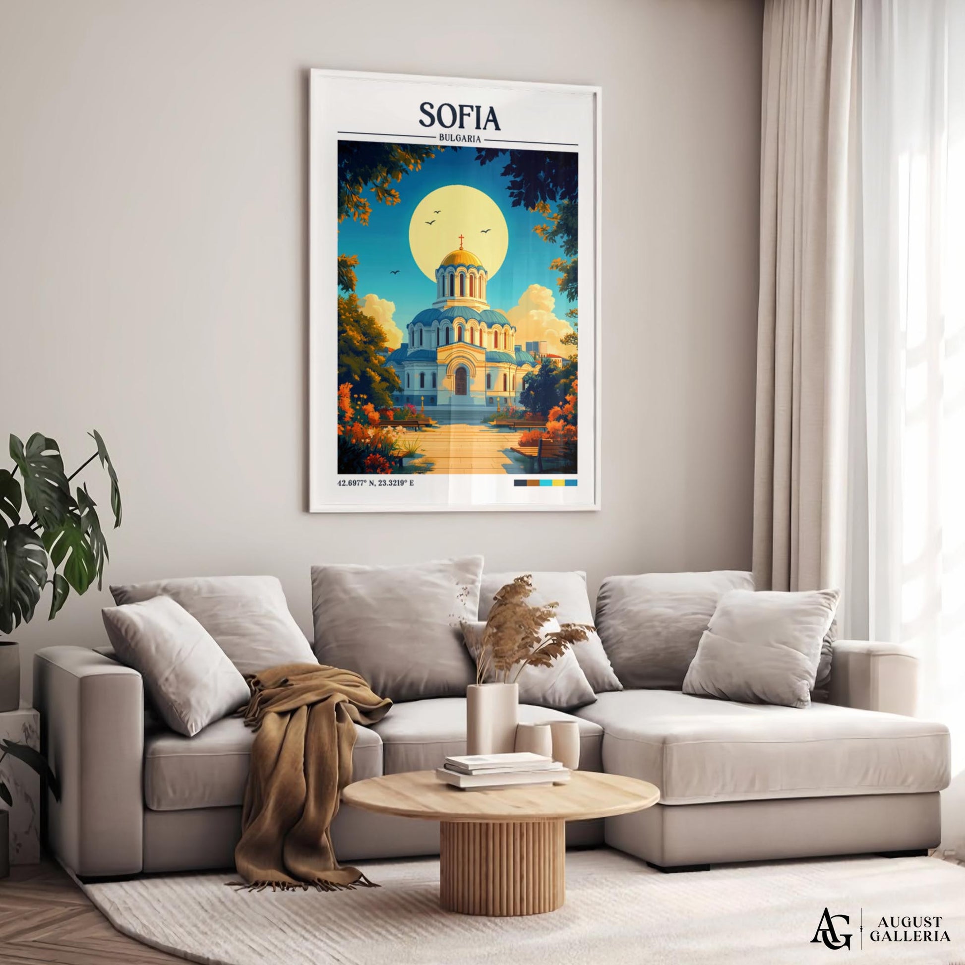 Celebrate the grandeur of Sofia with this retro travel illustration, centred on the majestic St. Alexander Nevsky Cathedral. Its striking golden domes and intricate façade rise prominently against a bright sky, capturing the cathedral’s iconic presence and architectural splendour. Framed by the cityscape and distant Vitosha Mountains, this print evokes the rich history, spiritual significance, and timeless beauty of Sofia, making it a perfect keepsake for admirers of Bulgaria’s capital.