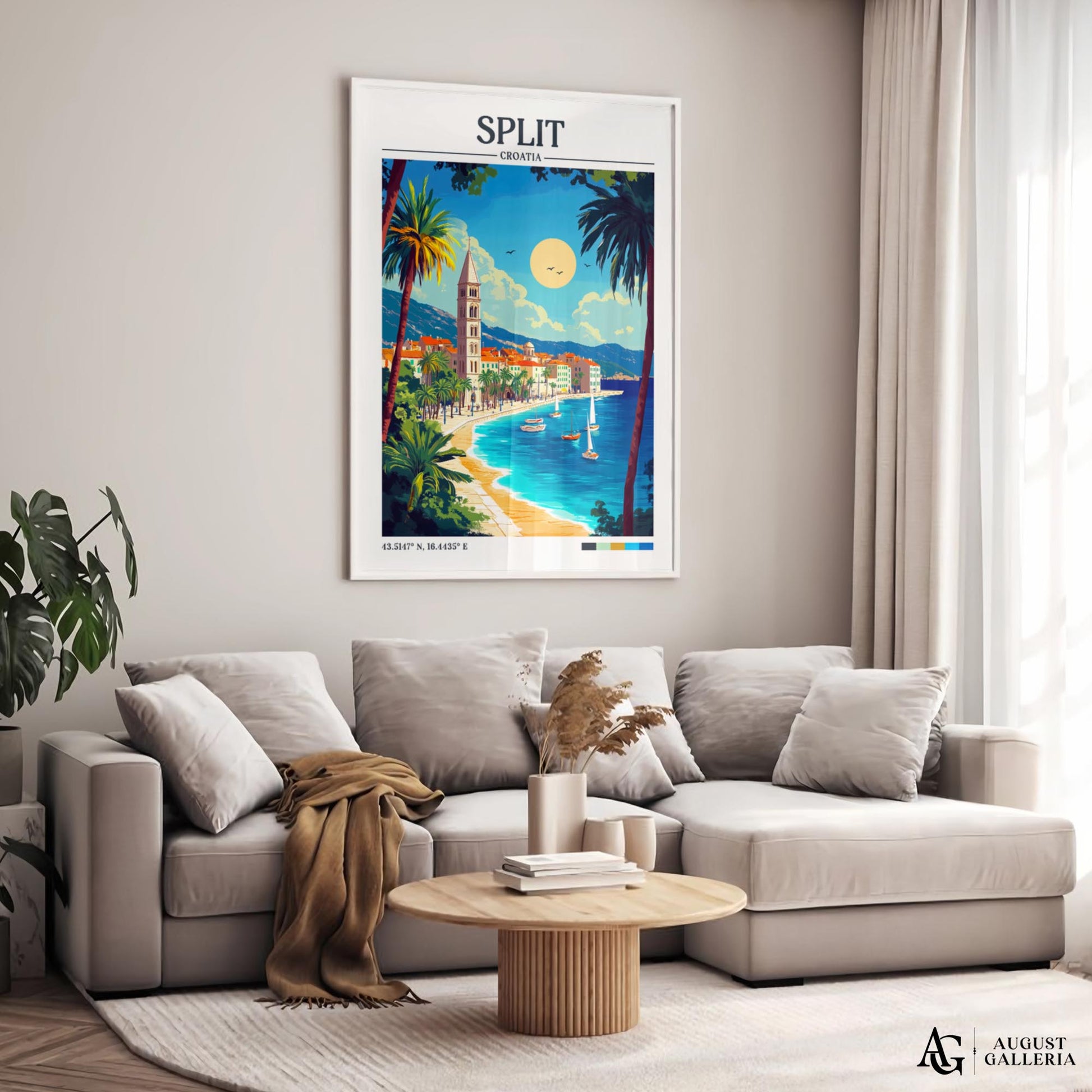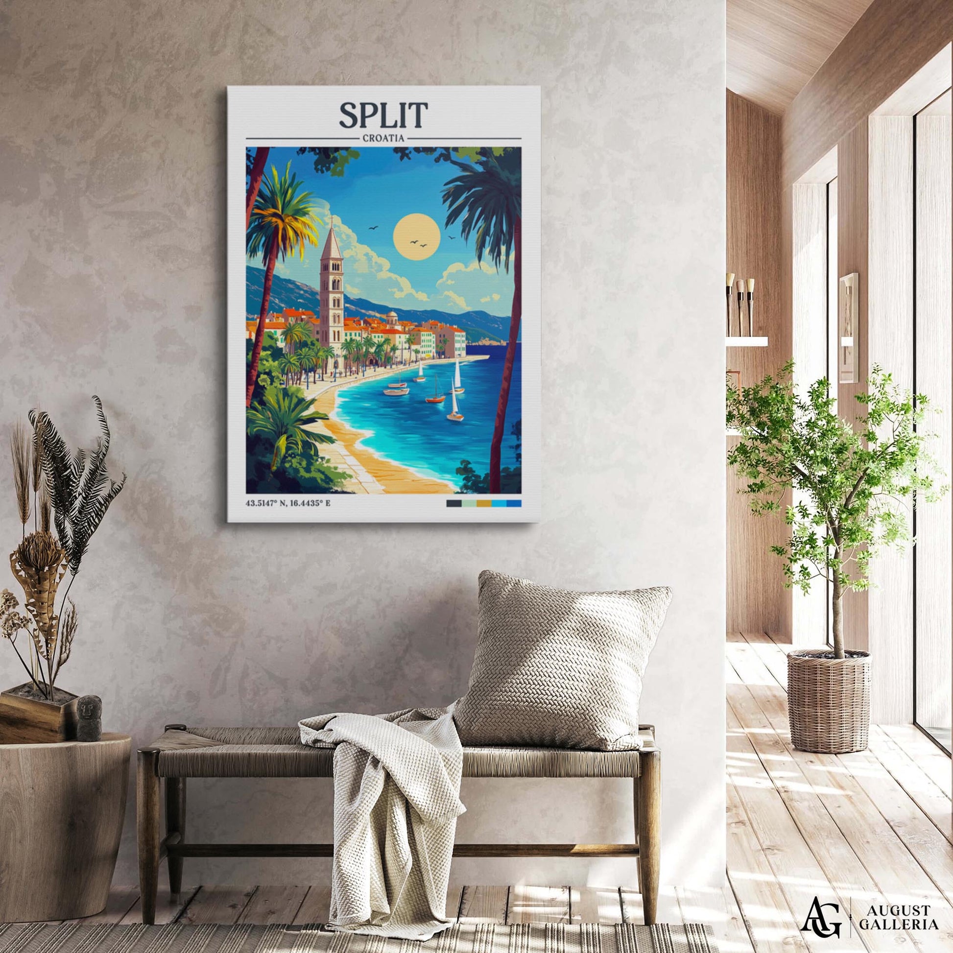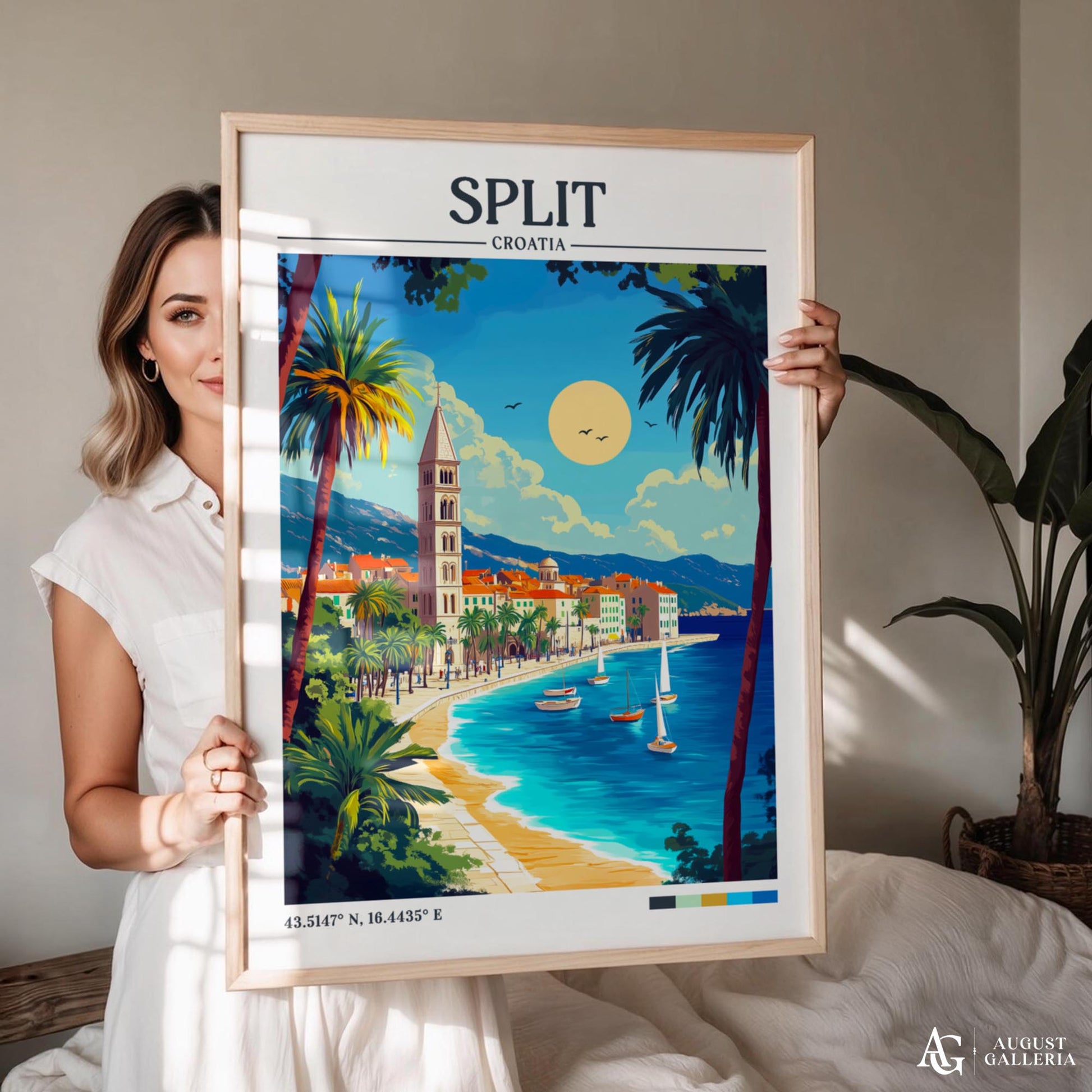 Discover the charm of Split with this retro-inspired travel print, highlighting the city’s historic harbour and striking seafront. The ancient walls of Diocletian’s Palace rise proudly beside elegant palm-lined promenades, while boats drift gently across the Adriatic. With its blend of Roman heritage, coastal beauty, and Mediterranean flair, this artwork captures Split’s timeless atmosphere and seaside allure.