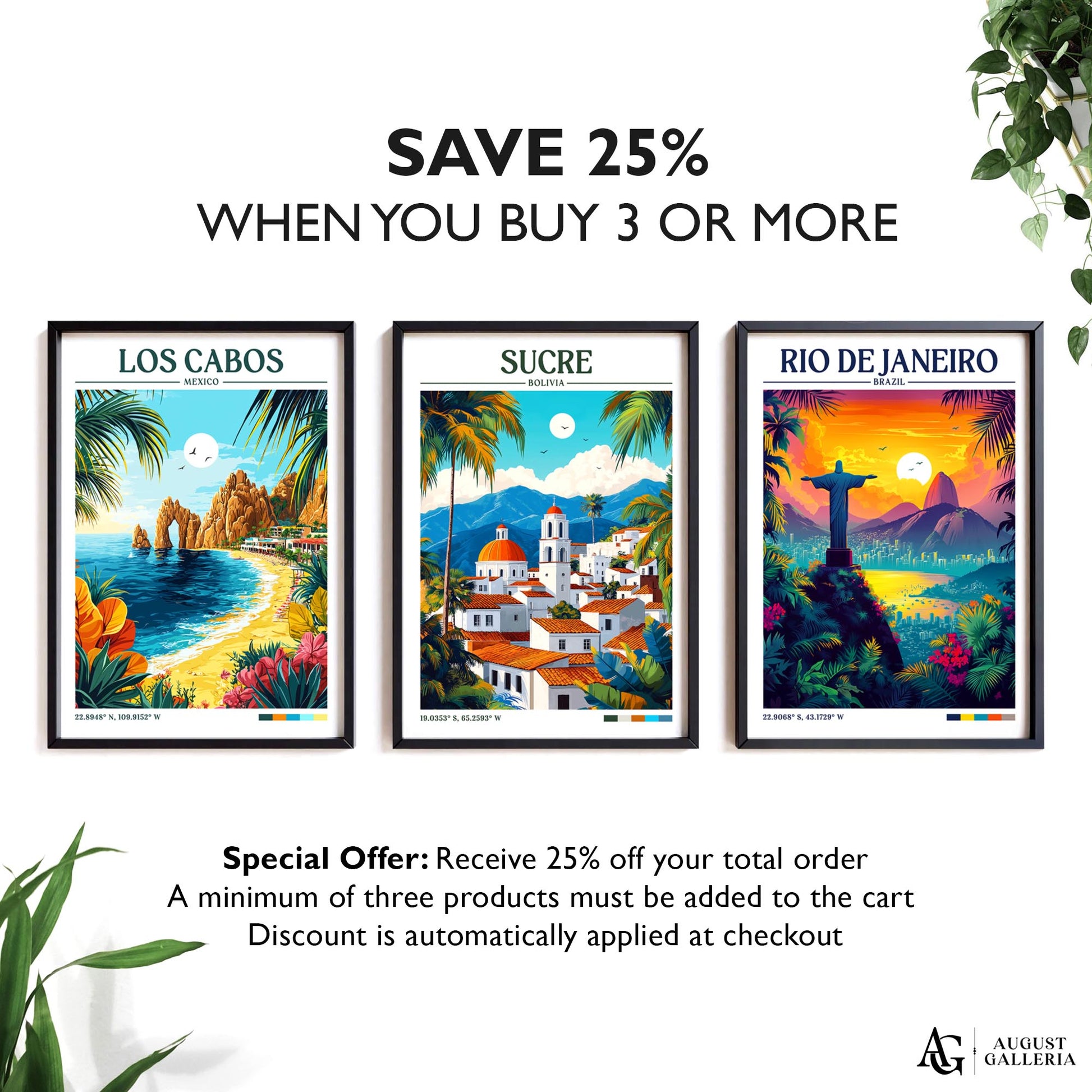 Celebrate the whitewashed charm of Sucre with this retro travel illustration, featuring the city’s colonial architecture set against a backdrop of sunlit hills. Red-tiled roofs, ornate balconies, and cobbled streets evoke the timeless beauty and historic elegance of Bolivia’s constitutional capital. This print captures Sucre’s serene atmosphere, cultural richness, and vibrant heritage, making it a perfect keepsake for admirers of South American cities.