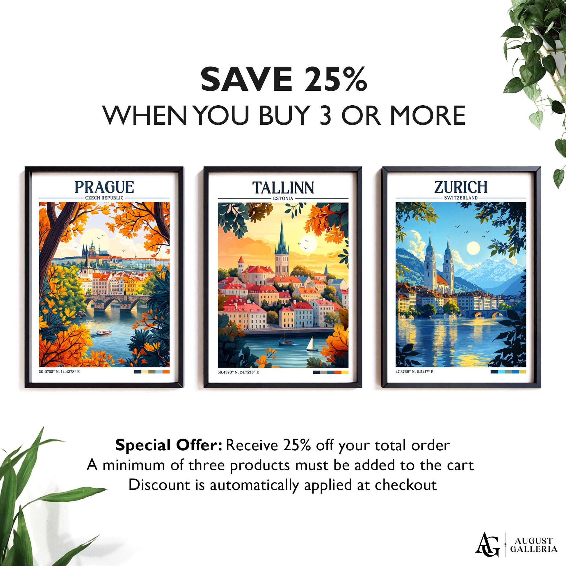 Step into the medieval charm of Tallinn with this retro travel illustration, featuring its picturesque Old Town with red-tiled rooftops and winding cobblestone streets. Elegant spires and historic towers rise against a crisp sky, while the city walls and quaint squares hint at centuries of rich heritage. This print captures the timeless beauty, cultural depth, and enchanting atmosphere of Estonia’s capital, making it a perfect keepsake for lovers of historic European cities.