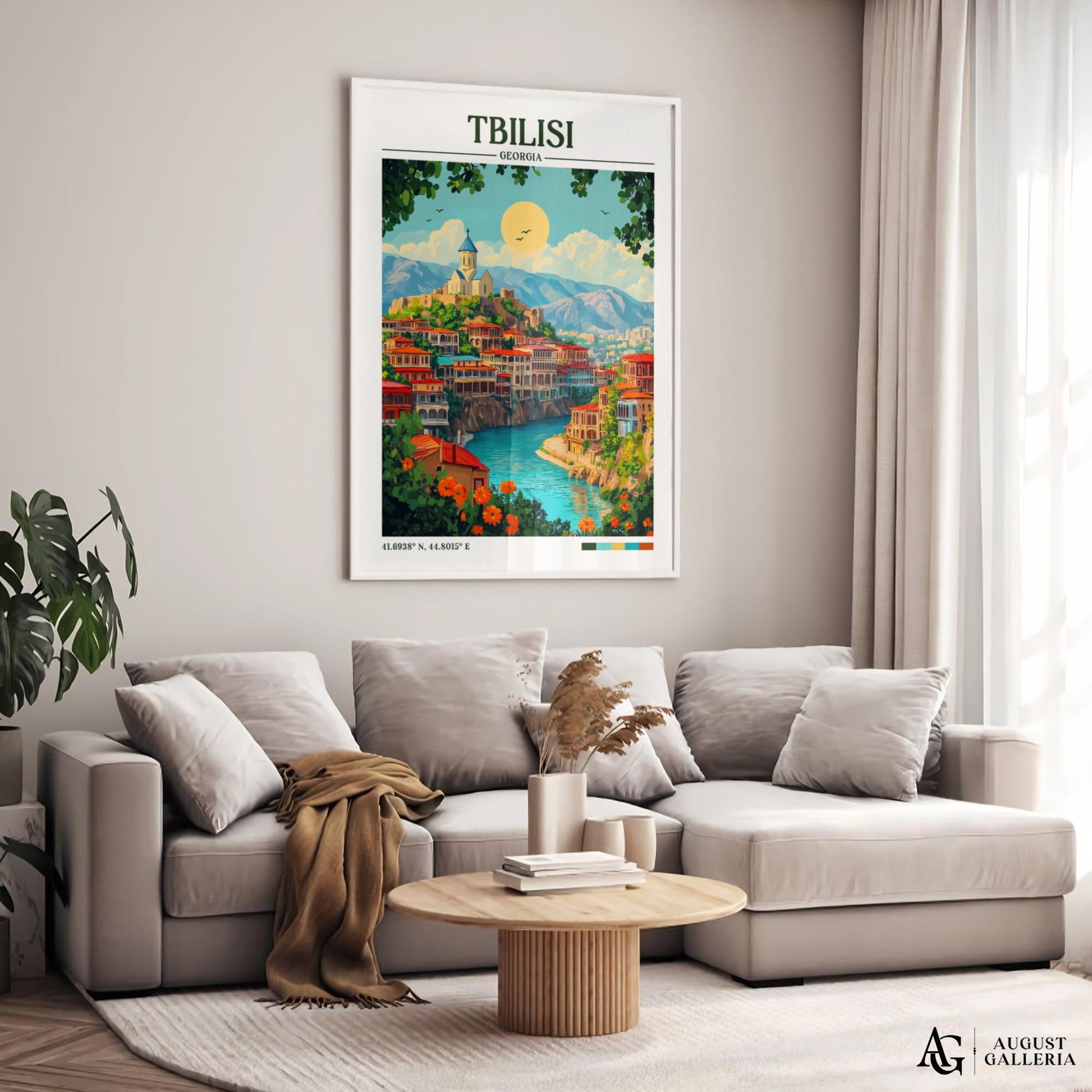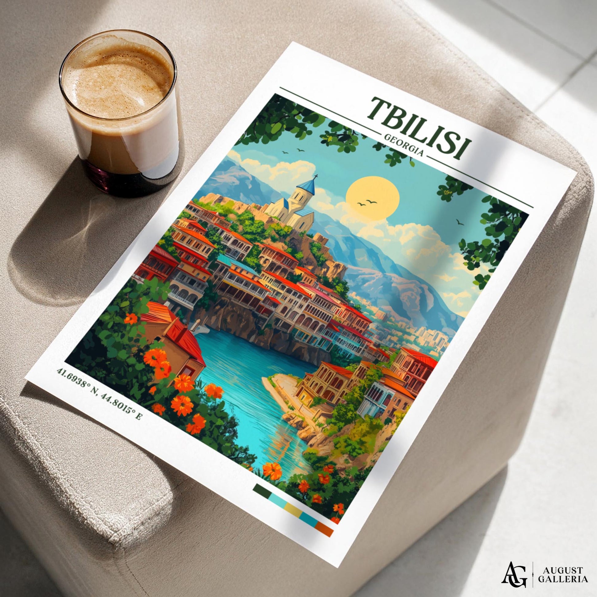 Step into the historic charm of Tbilisi with this retro travel illustration, featuring the city’s colourful rooftops, winding streets, and distinctive hillside architecture. The skyline is framed by the gentle rise of surrounding mountains under a clear sky, highlighting the harmonious blend of old and new that defines Georgia’s capital. This print captures the timeless beauty, cultural richness, and unique character of Tbilisi, making it a perfect keepsake for admirers of the city.