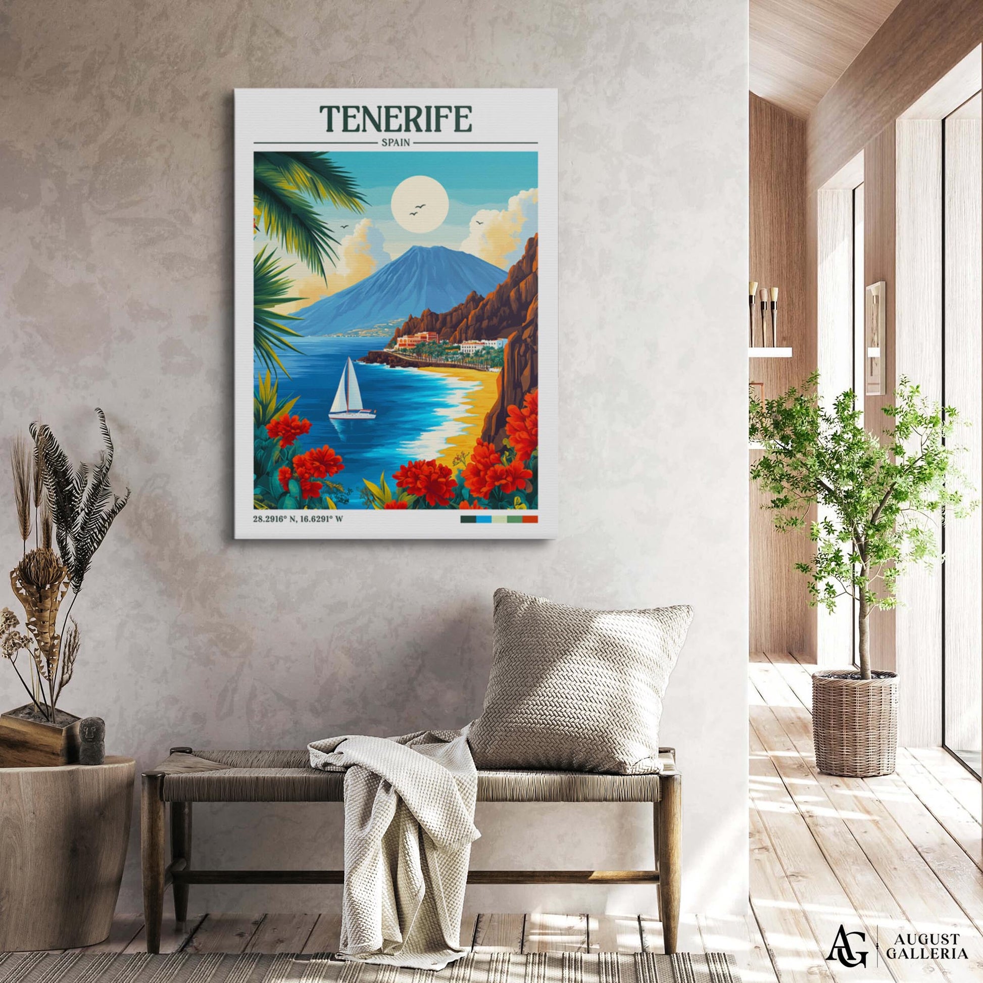 Step into the sun-soaked beauty of Tenerife with this retro travel illustration, featuring the island’s volcanic landscapes, golden beaches, and lush greenery. Towering Mount Teide rises dramatically in the background, while palm trees and coastal flora frame the sparkling blue ocean. This print captures the timeless charm, natural diversity, and vibrant spirit of Tenerife, making it a perfect tribute for lovers of the Canary Islands.